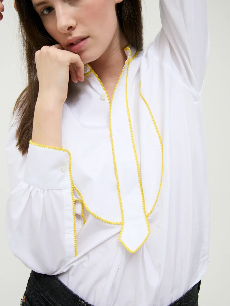 Chemise Painter Venetian signée Sébline confectionnée en popeline de coton italienne blanche décorée de coutures jaunes contrastantes. Une chemise à la coupe inspirée des blouses de peintre.