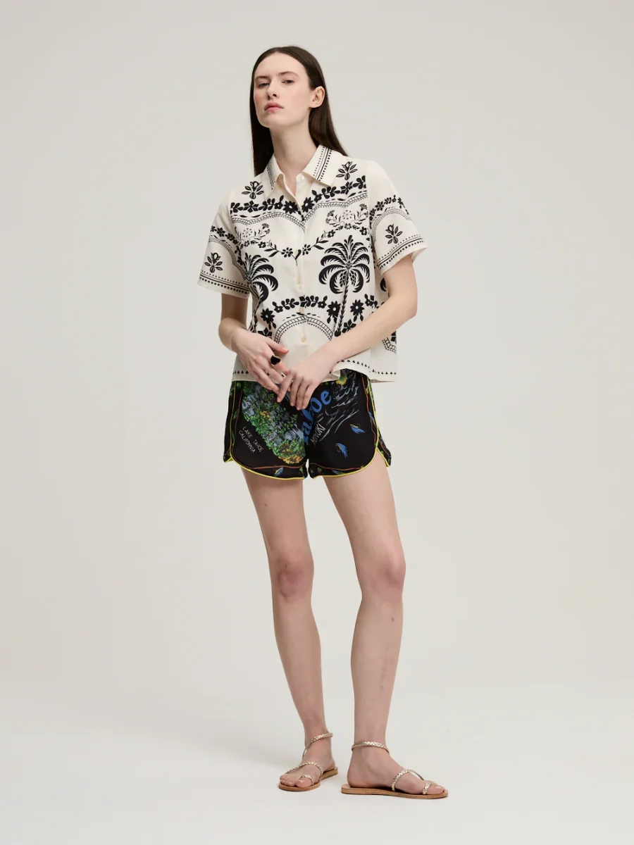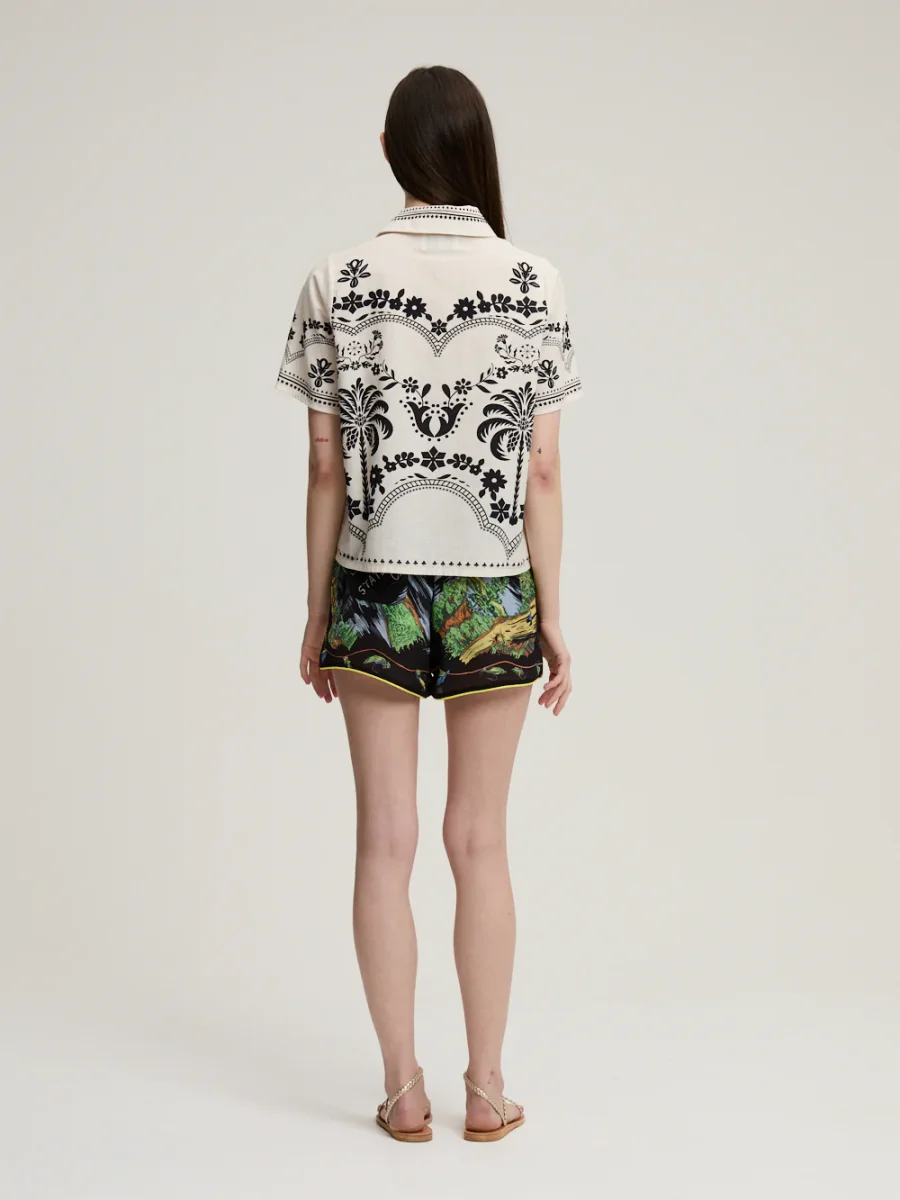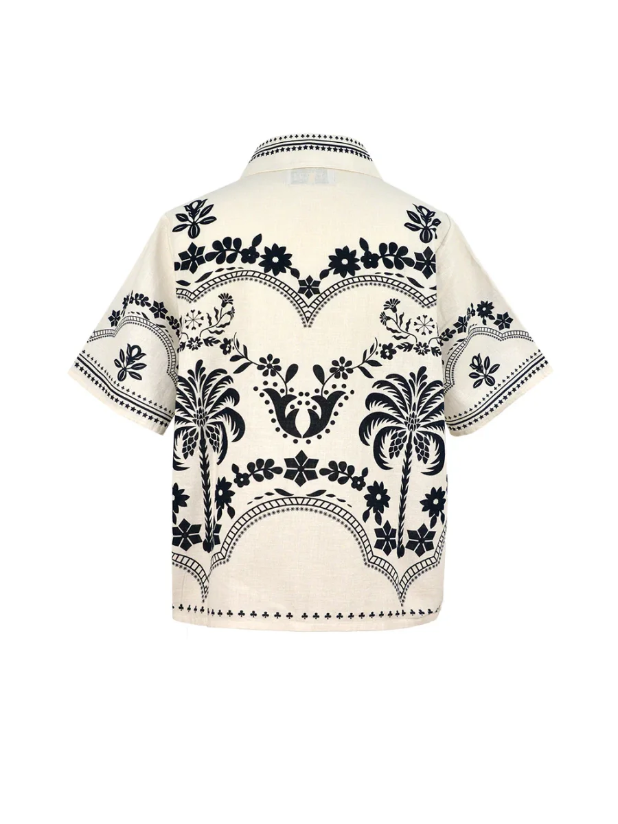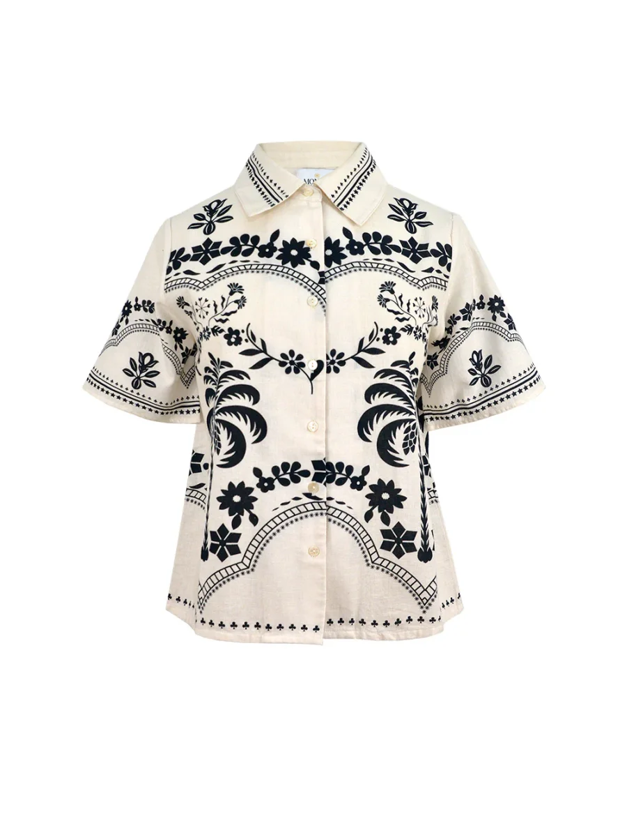 Chemise Parrot signée Monoki confectionnée en coton de couleur blanc cassé imprimé de motifs floraux noir. Une chemise à la coupe droite et au style inspiré des chemises traditionnelles hawaïennes.