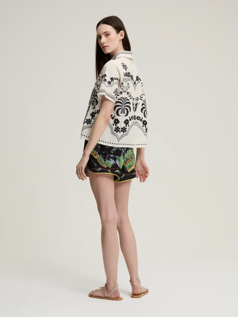 Chemise Parrot signée Monoki confectionnée en coton de couleur blanc cassé imprimé de motifs floraux noir. Une chemise à la coupe droite et au style inspiré des chemises traditionnelles hawaïennes. – Le mannequin mesure 1m76 et porte une Taille Unique