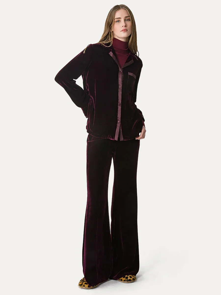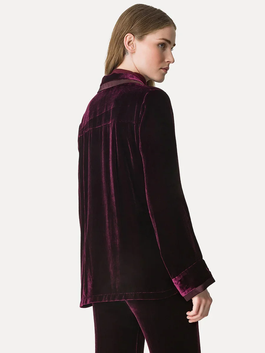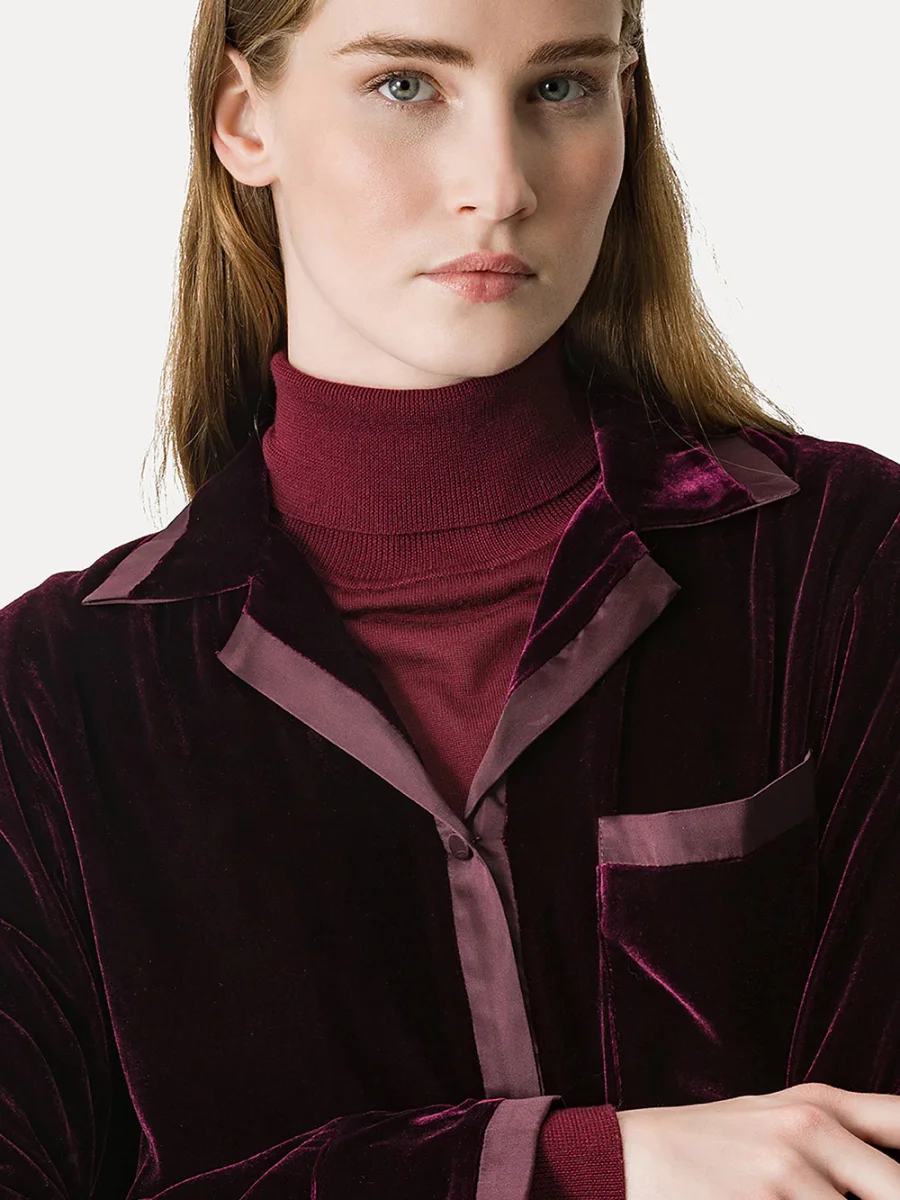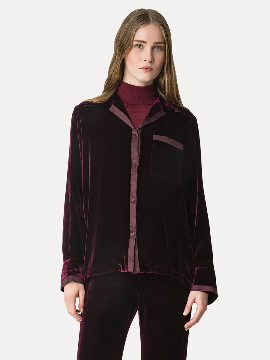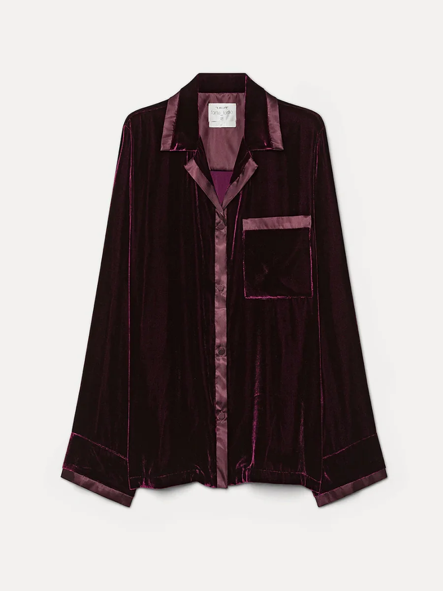 Chemise Pyjama signée Forte_Forte confectionné dans un tissu en velours bordeaux. Une chemise inspirée de la coupe pyjama aux bordures en satin. – Fabriquée en Italie – Poche plaquée sur la poitrine