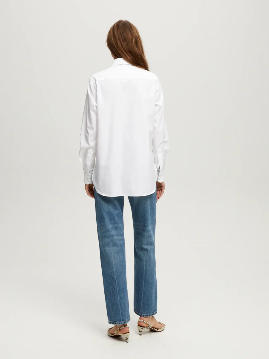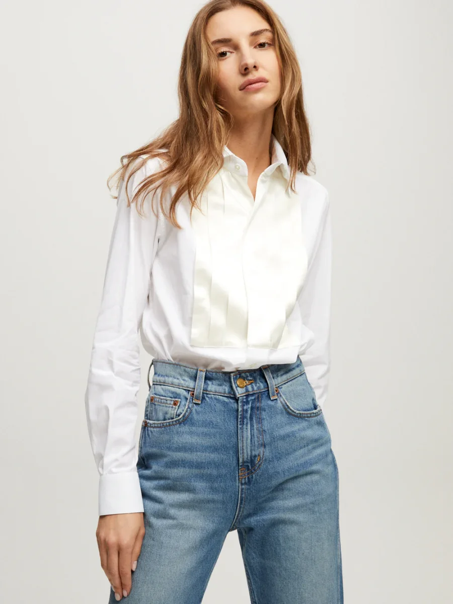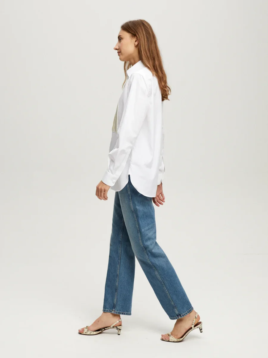 Chemise Smocking signée Sébline confectionnée en coton blanc accompagné d’un plastron plissé dans un tissu satiné blanc cassé. Une chemise à la coupe droite, boutonnée sur le devant.