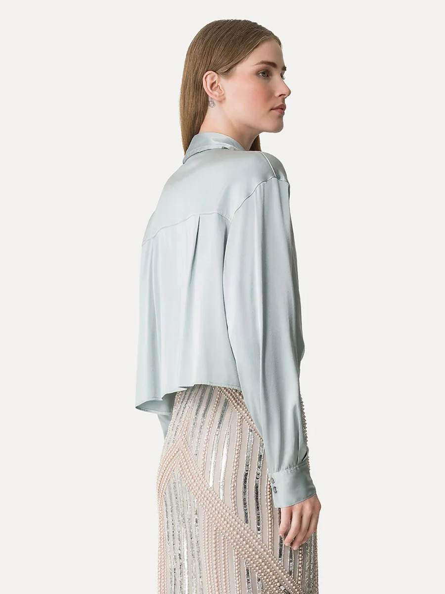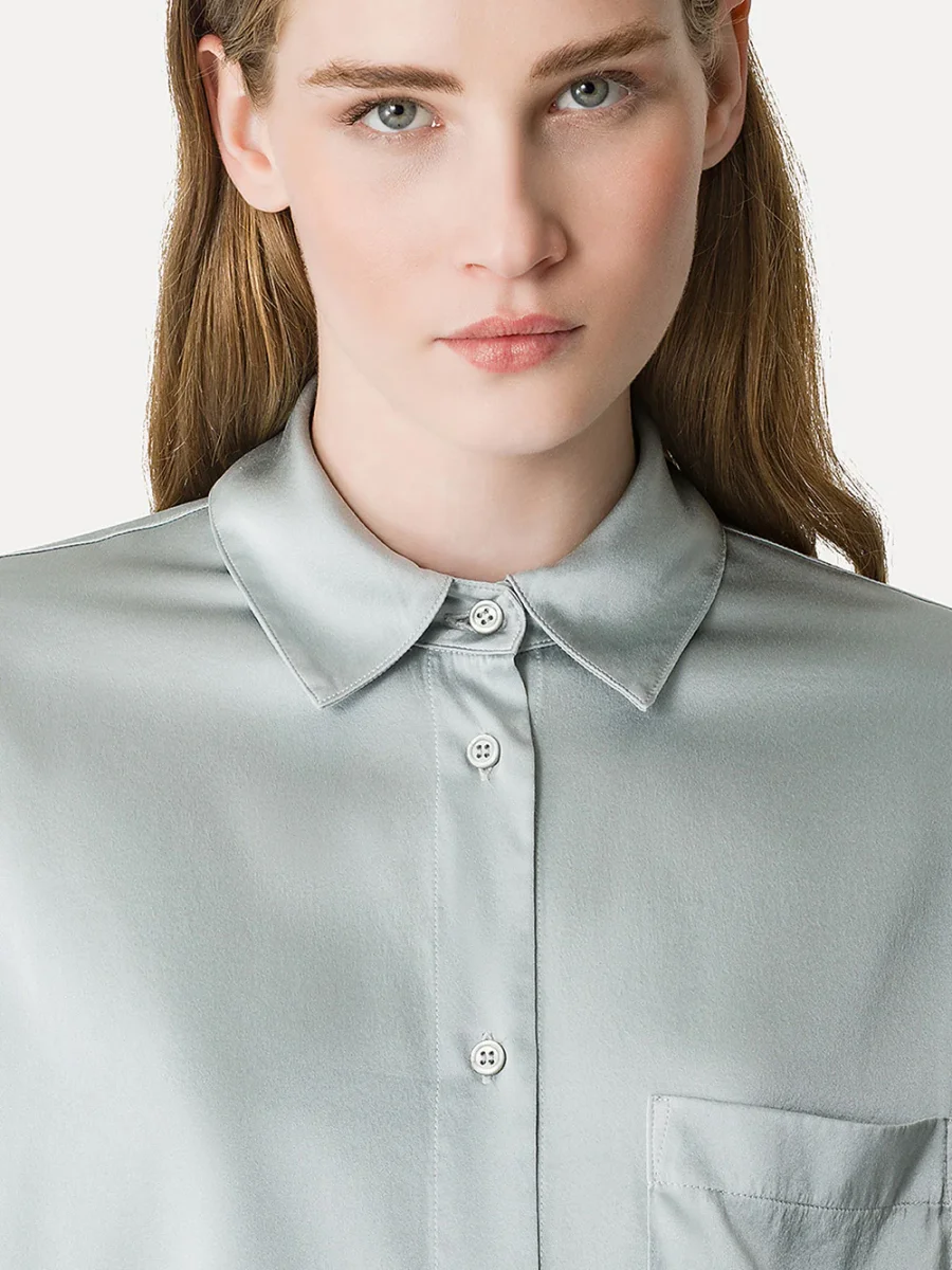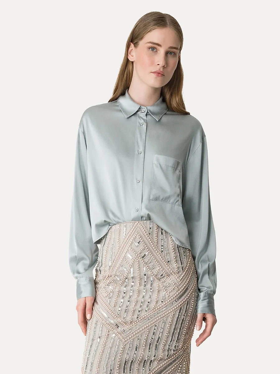 Chemise Soie Pearl signée Forte_Forte confectionnée en satin de soie de couleur vert d’eau. Une chemise courte à la coupe droite et aux poignets resserrés.