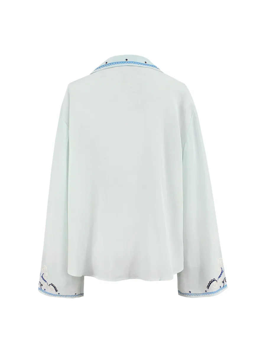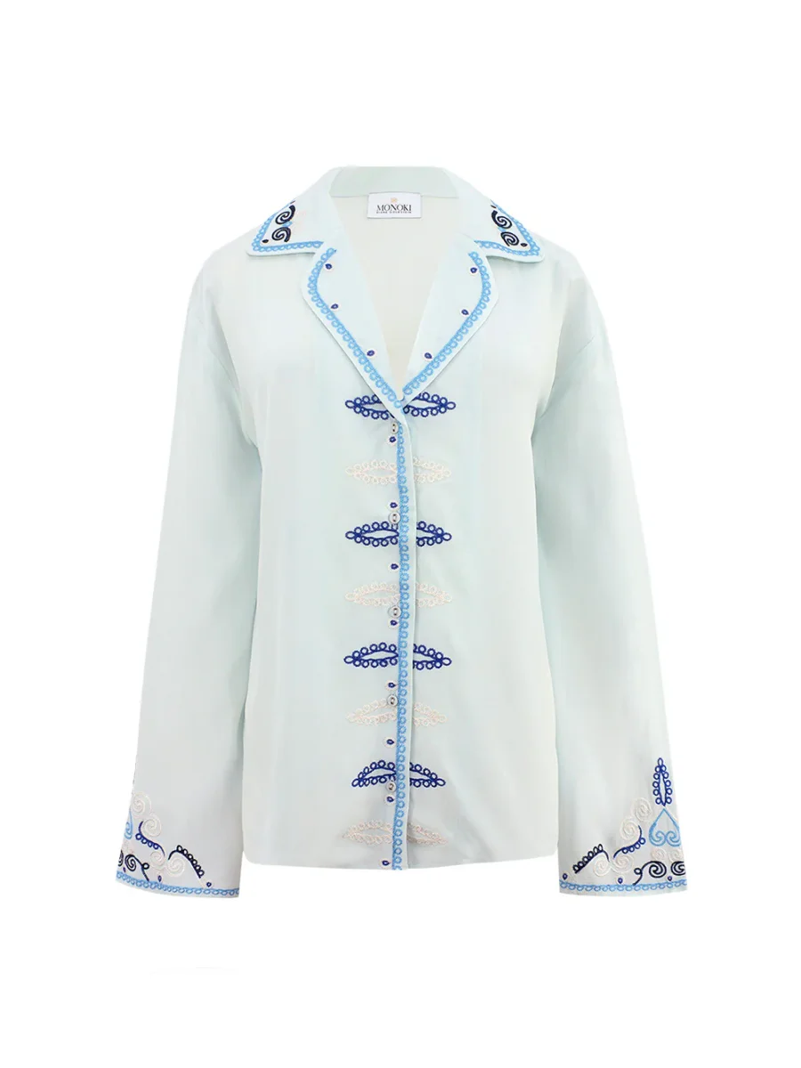 Chemise Suzanne signée Monoki confectionnée en soie bleu clair aux broderies contrastantes dans les tons bleus également au niveau des poignets, du col et de la pâte de boutonnage.