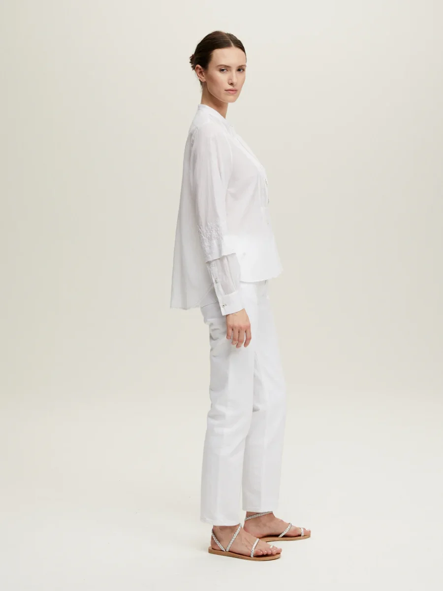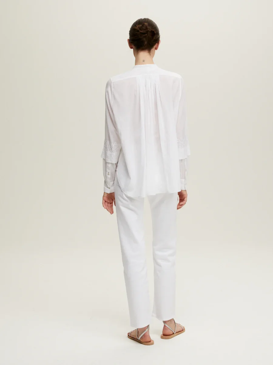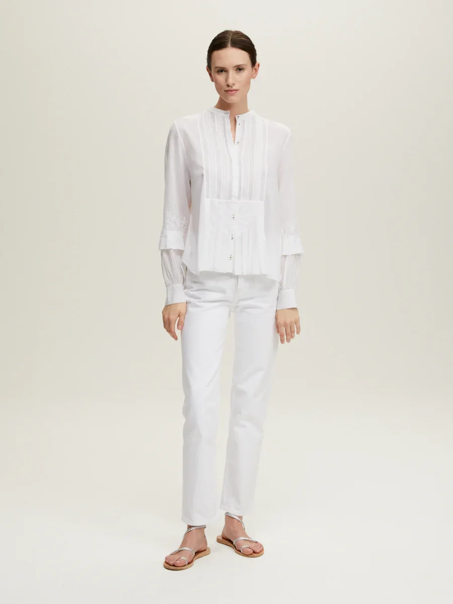 Chemise Tisia signée Jane Gustavsson confectionnée en coton organique blanc tissé à la main brodé de fleurs blanches ton-sur-ton. Une chemise au plastron plissé et au col mao.