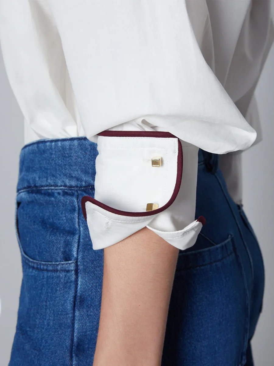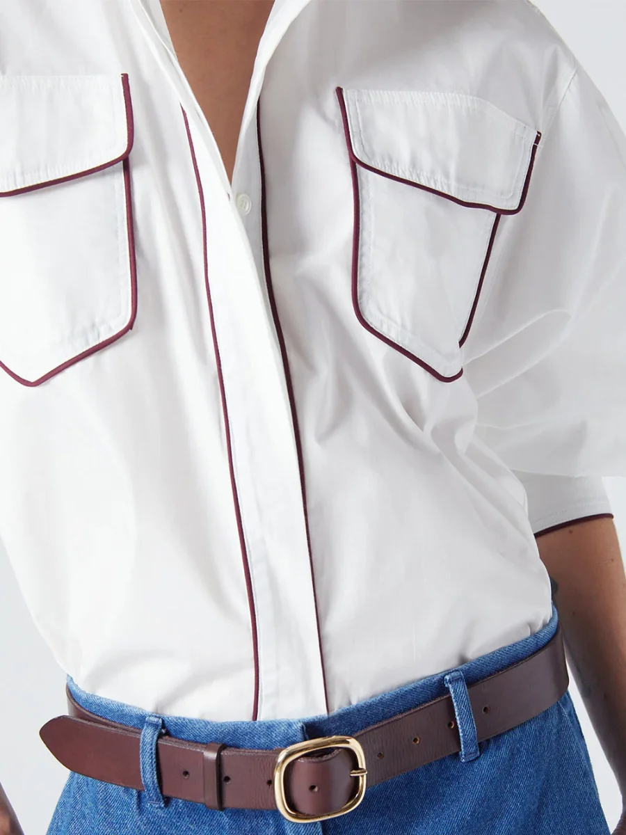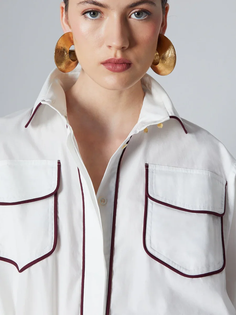 Chemise Wayne Garnet signée The Label Edition confectionnée en coton blanc aux bordures contrastantes de couleur bordeaux. Une chemise à la coupe droite inspirée de l’ouest américain.