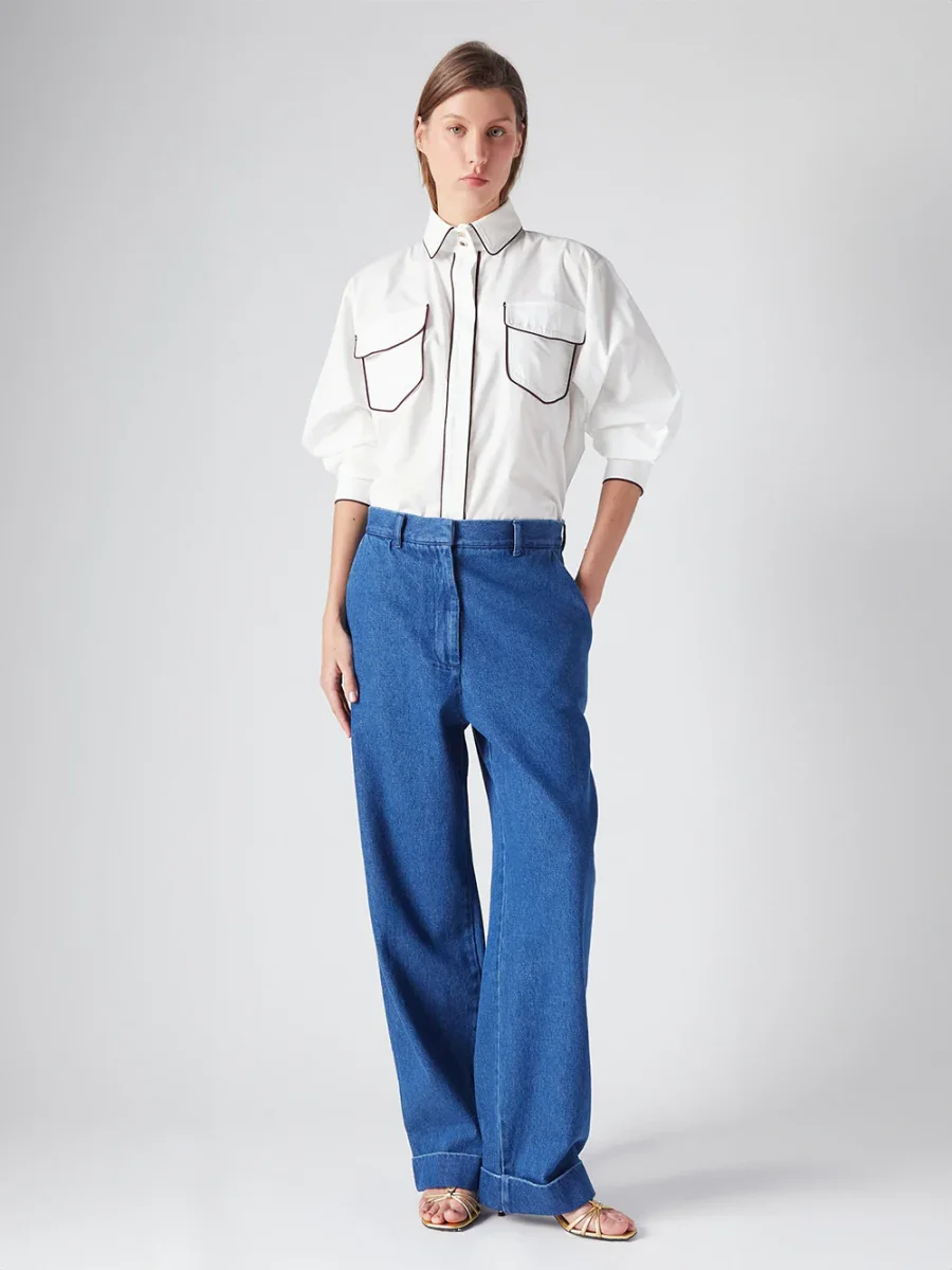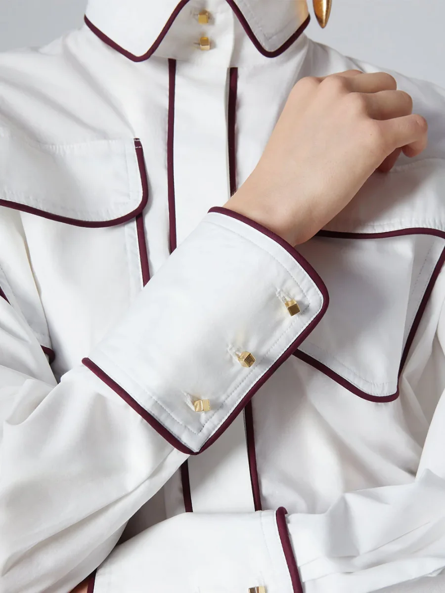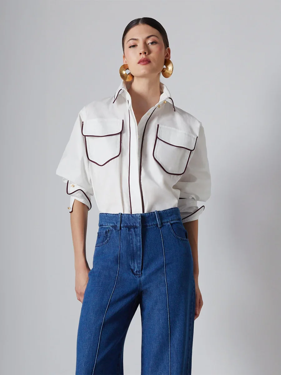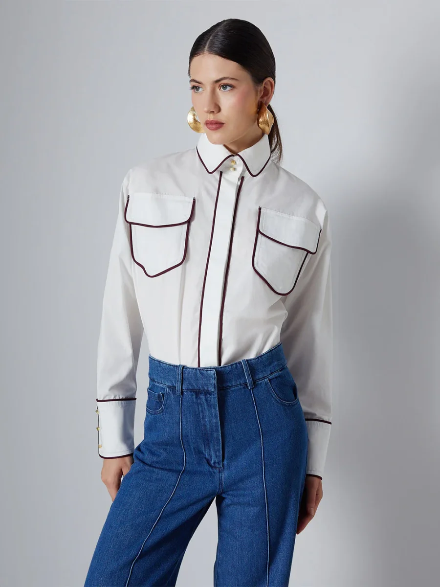 Chemise Wayne Garnet signée The Label Edition confectionnée en coton blanc aux bordures contrastantes de couleur bordeaux. Une chemise à la coupe droite inspirée de l’ouest américain.