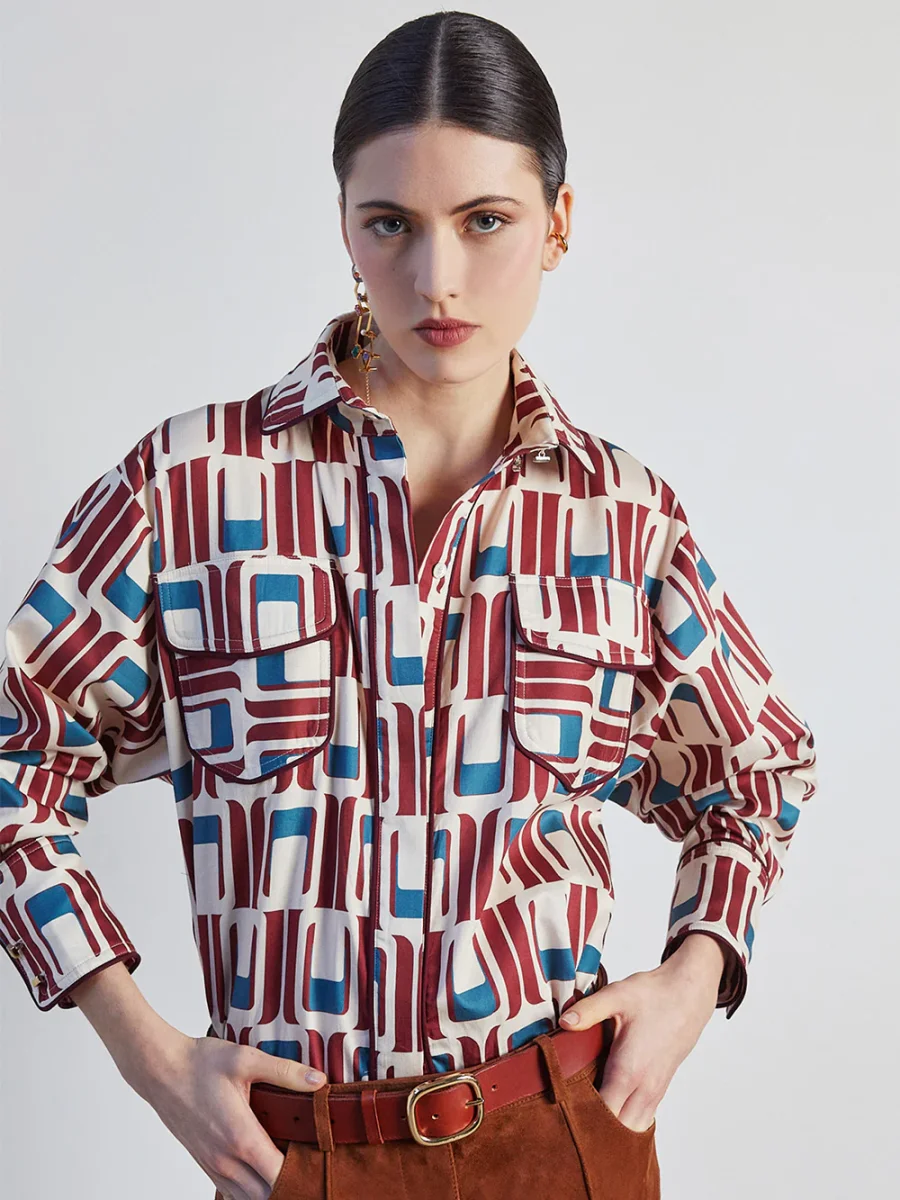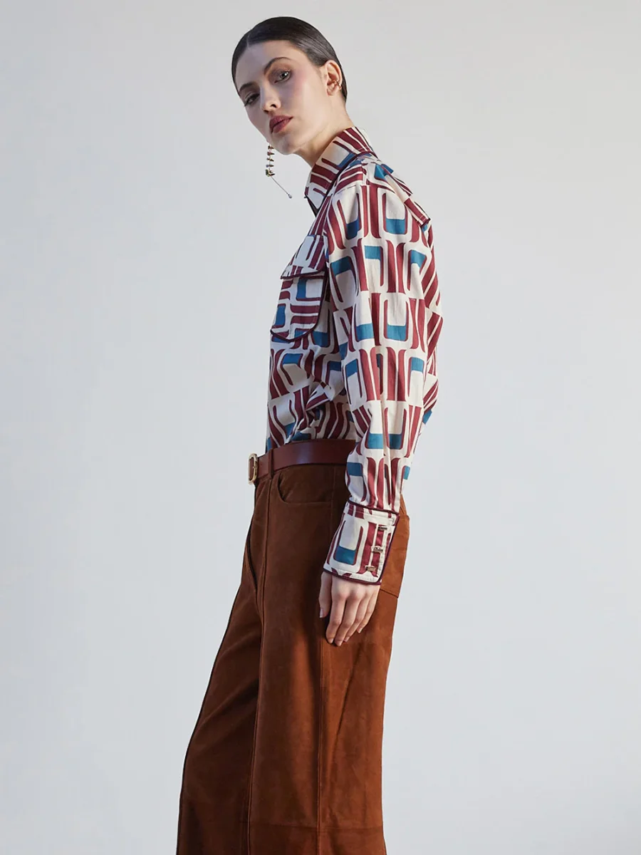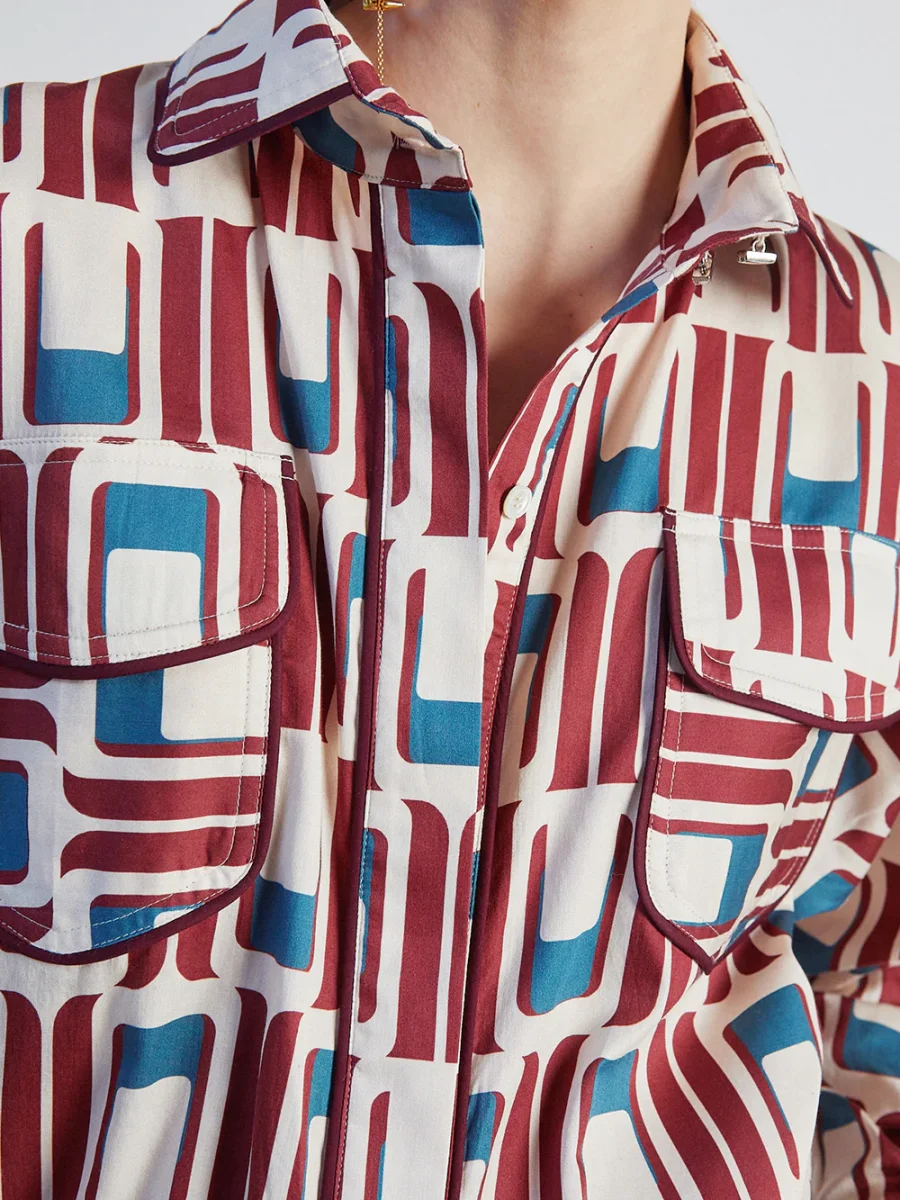 Chemise Wayne Manhattan signée The Label Edition confectionnée en coton aux motifs géométriques dans les tons rouge, bleu et blanc. Une chemise à la coupe droite inspirée de l’ouest américain.
