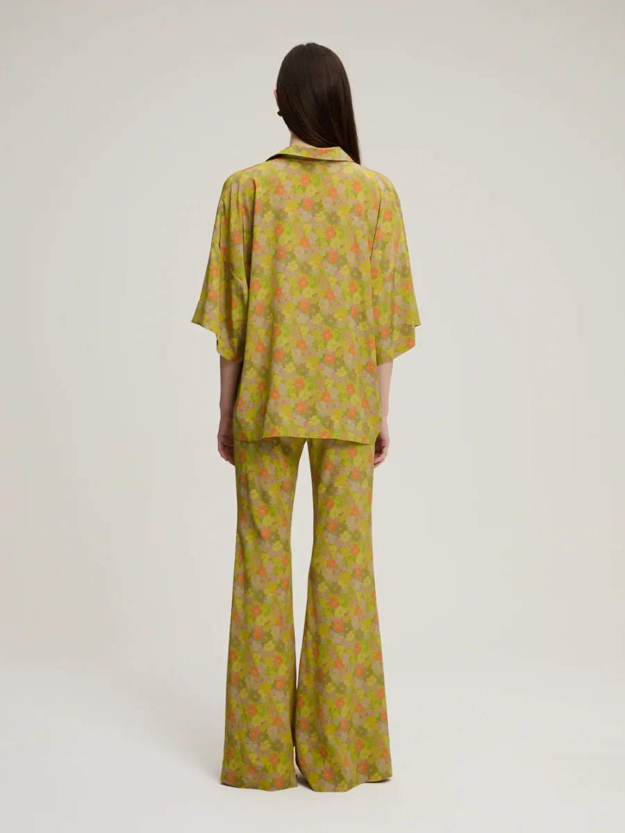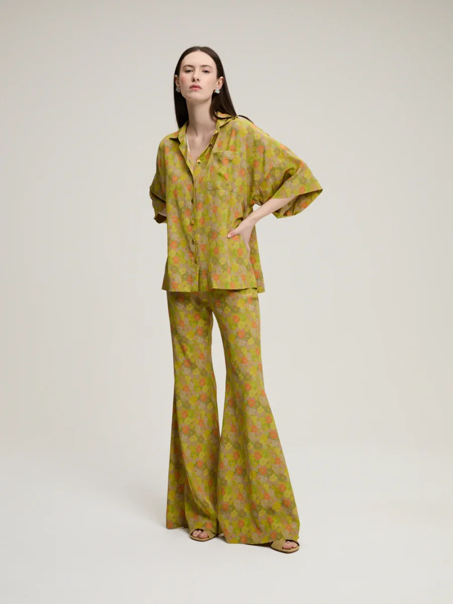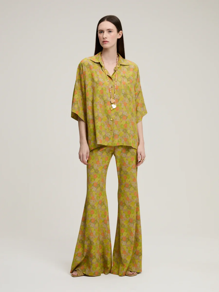 Chemise Zaoua signée Françoise confectionnée en crêpe de soie imprimé de fleurs dans les tons marron, jaune et vert. Une pièce réalisée avec des tissus non utilisés issus des grandes marques de luxe.