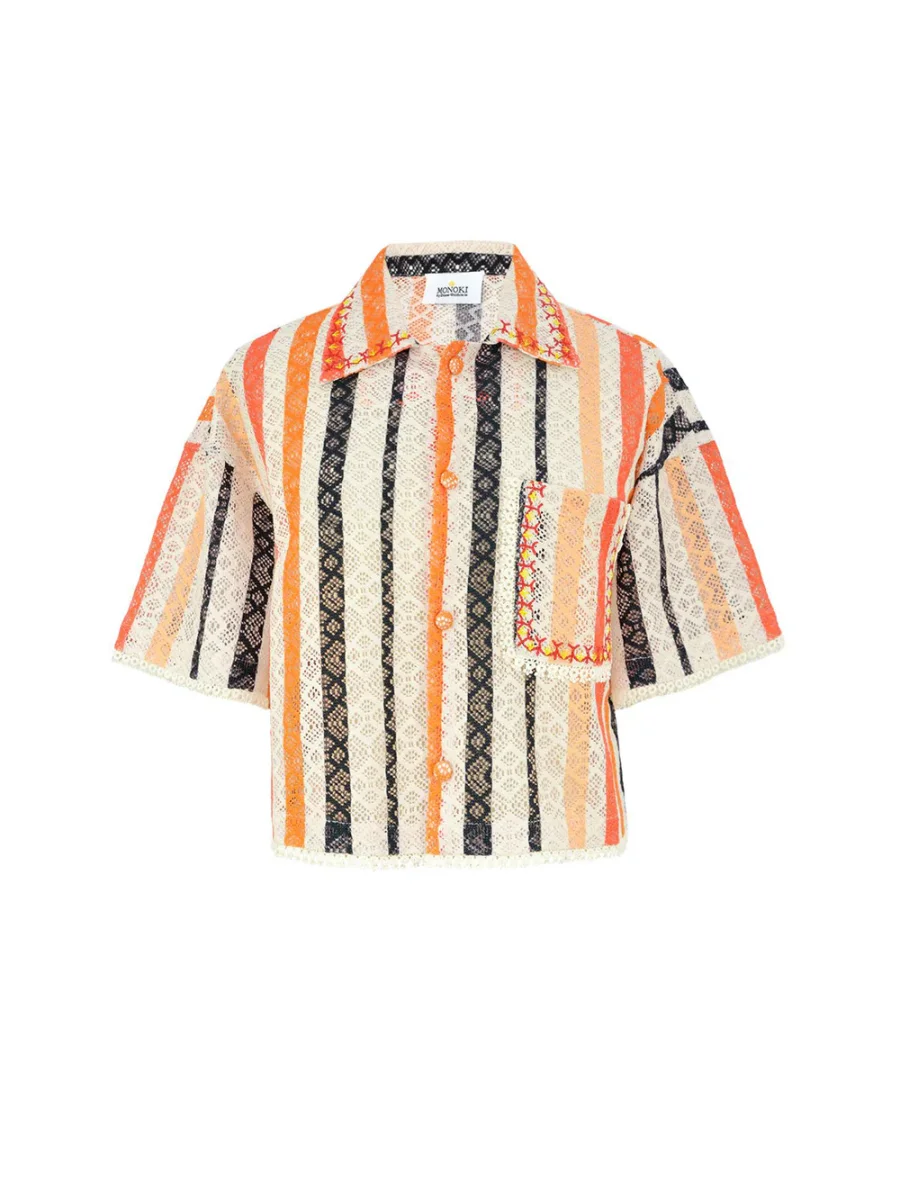 Chemise Zora signée Monoki confectionnée en coton ajouré orange, noir et crème. Une chemise à la coupe et manches courtes, boutonnée sur le devant. – Poche plaquée sur la poitrine – Taille Unique