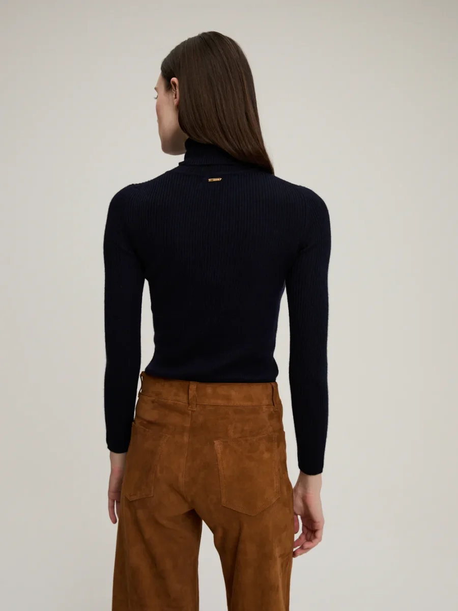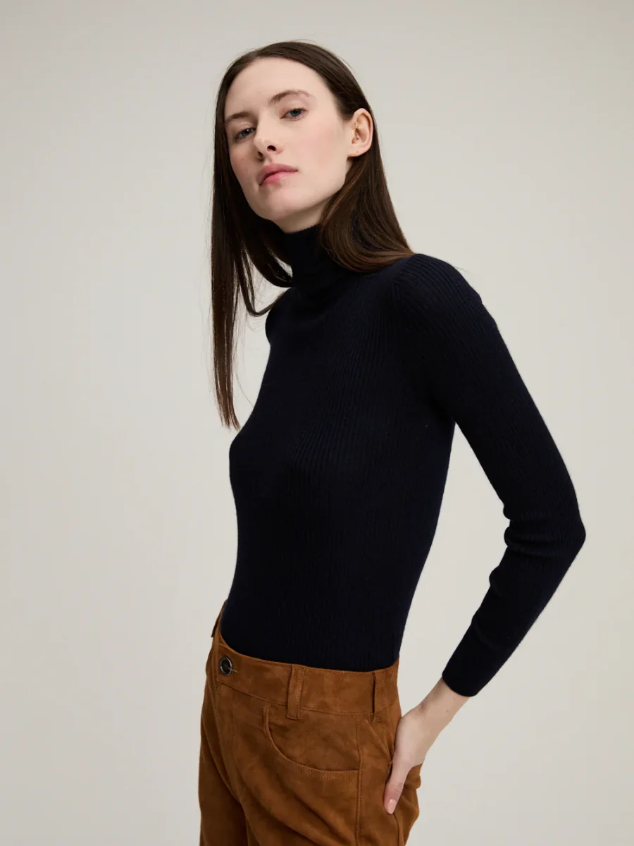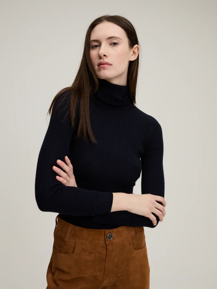 Col Roulé Léa Navy signé BY Marie Collection confectionné en cachemire de couleur bleu marine. Un pull en maille fine côtelée, près du corps, fabriqué dans un atelier au Népal mettant en avant le travail artisanal des femmes népalaise. – 100% Cachemire