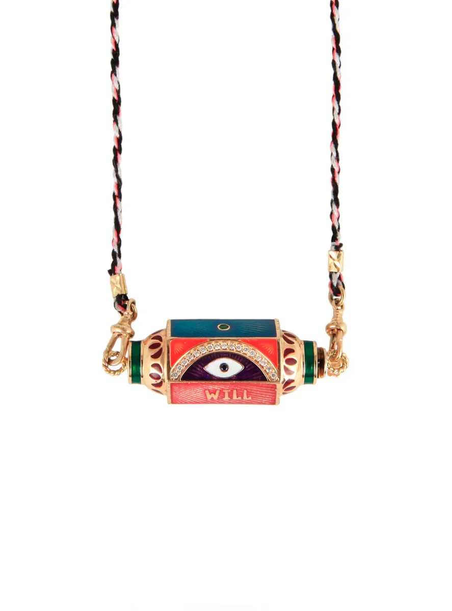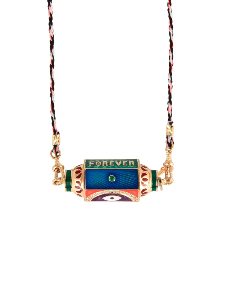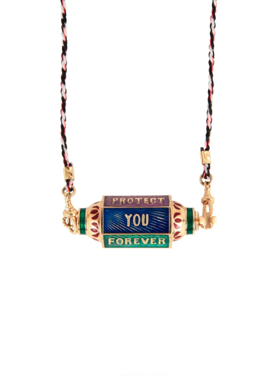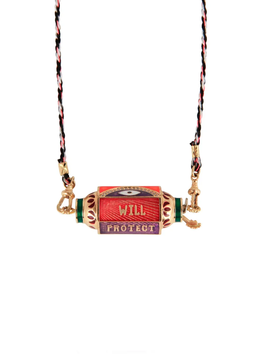 Collier Locket émaillé Eye Will Marie Lichtenberg exclusivité 20ans BY MARIE. Ce collier se compose d’un lien double en coton orné d’opalines et d’un pendentif locket multicolore en or 14 carats finement ciselé et émaillé à la main. Un oeil protecteur et un arc de cercle en diamants ainsi que l’inscription « WILL PROTECT YOU FOREVER » ornent les facettes du locket. La symbolique occupe une place importante dans les créations de Marie Lichtenberg, ainsi le coton du cordon provient d’un temple Indien de Jaipur et le locket creux en or 14 carats est forgé dans un atelier indien au savoir-faire unique. La couleur du cordon peut varier par rapport à la photo présenté. Ce modèle est une création exclusive imaginée par Marie Lichtenberg et Marie Gas pour les 20 ans de BY MARIE. Chaque Collier Locket émaillé Eye Will est livré dans sa boîte en papier mâché peinte à la main.