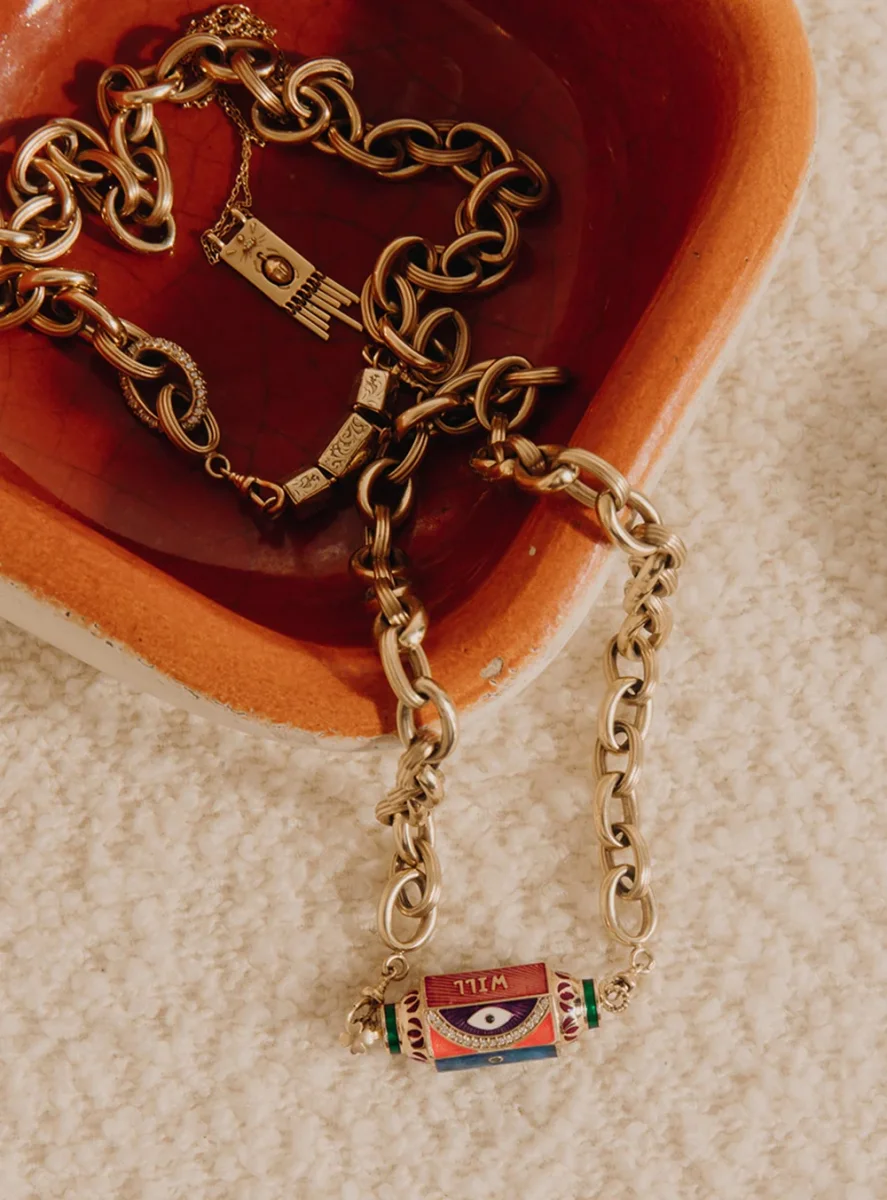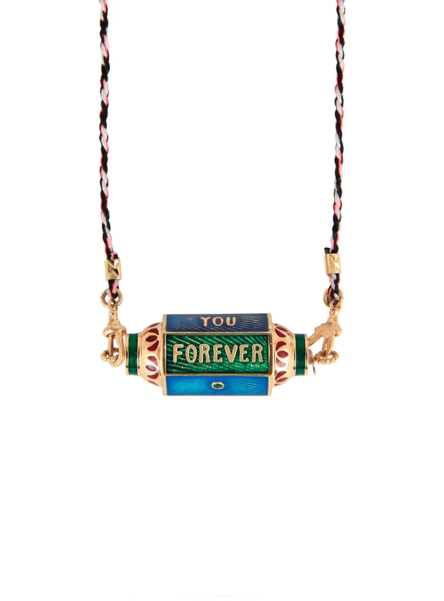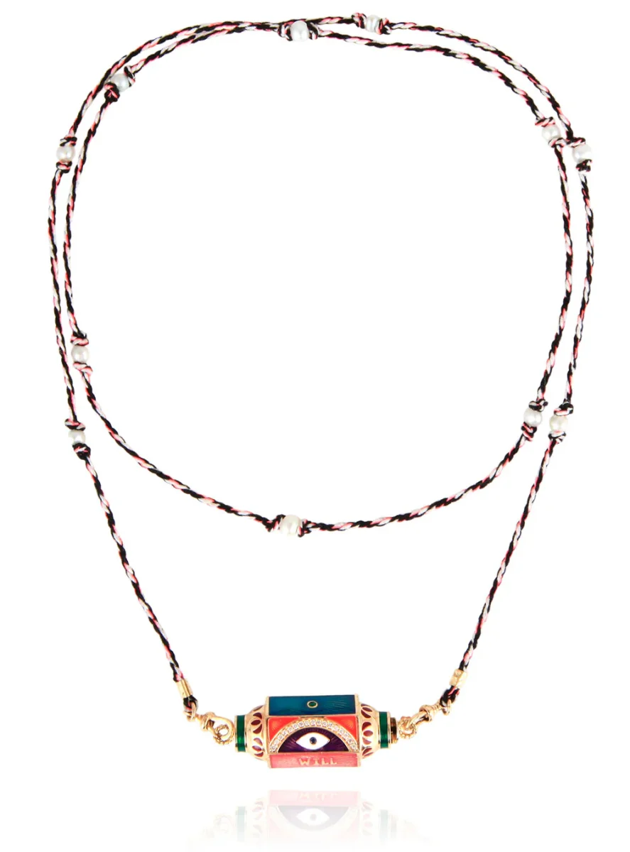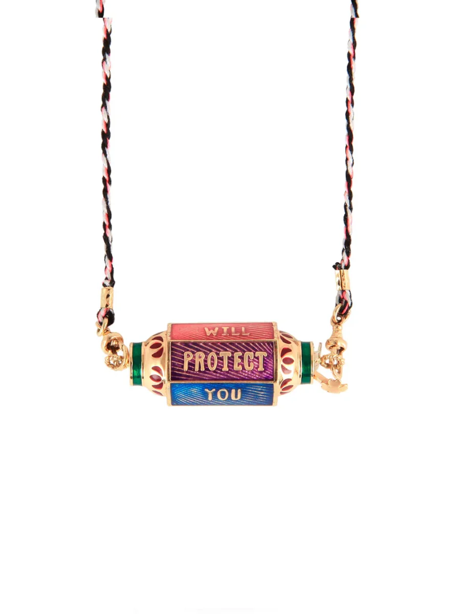 Collier Locket émaillé Eye Will Marie Lichtenberg exclusivité 20ans BY MARIE. Ce collier se compose d’un lien double en coton orné d’opalines et d’un pendentif locket multicolore en or 14 carats finement ciselé et émaillé à la main. Un oeil protecteur et un arc de cercle en diamants ainsi que l’inscription « WILL PROTECT YOU FOREVER » ornent les facettes du locket. La symbolique occupe une place importante dans les créations de Marie Lichtenberg, ainsi le coton du cordon provient d’un temple Indien de Jaipur et le locket creux en or 14 carats est forgé dans un atelier indien au savoir-faire unique. La couleur du cordon peut varier par rapport à la photo présenté. Ce modèle est une création exclusive imaginée par Marie Lichtenberg et Marie Gas pour les 20 ans de BY MARIE. Chaque Collier Locket émaillé Eye Will est livré dans sa boîte en papier mâché peinte à la main.