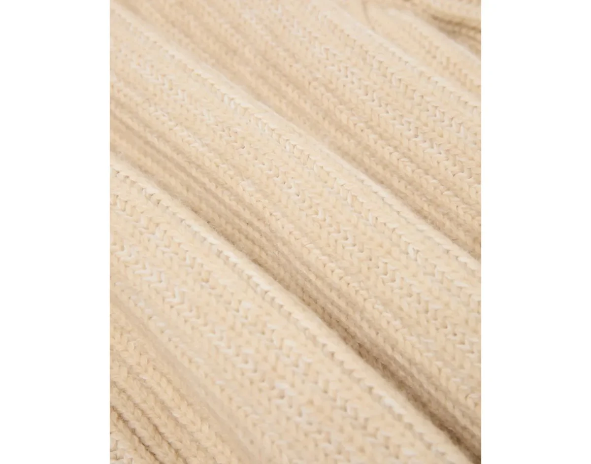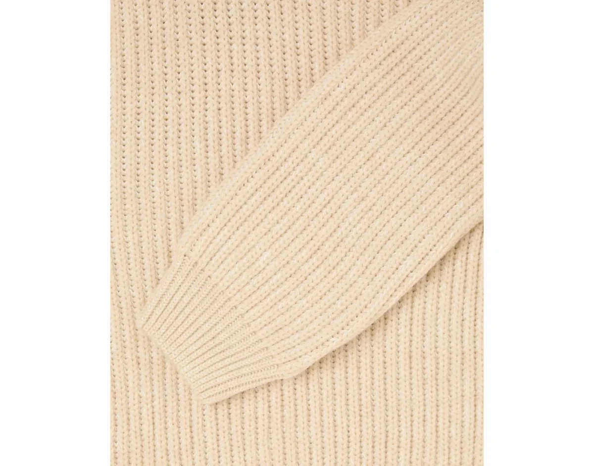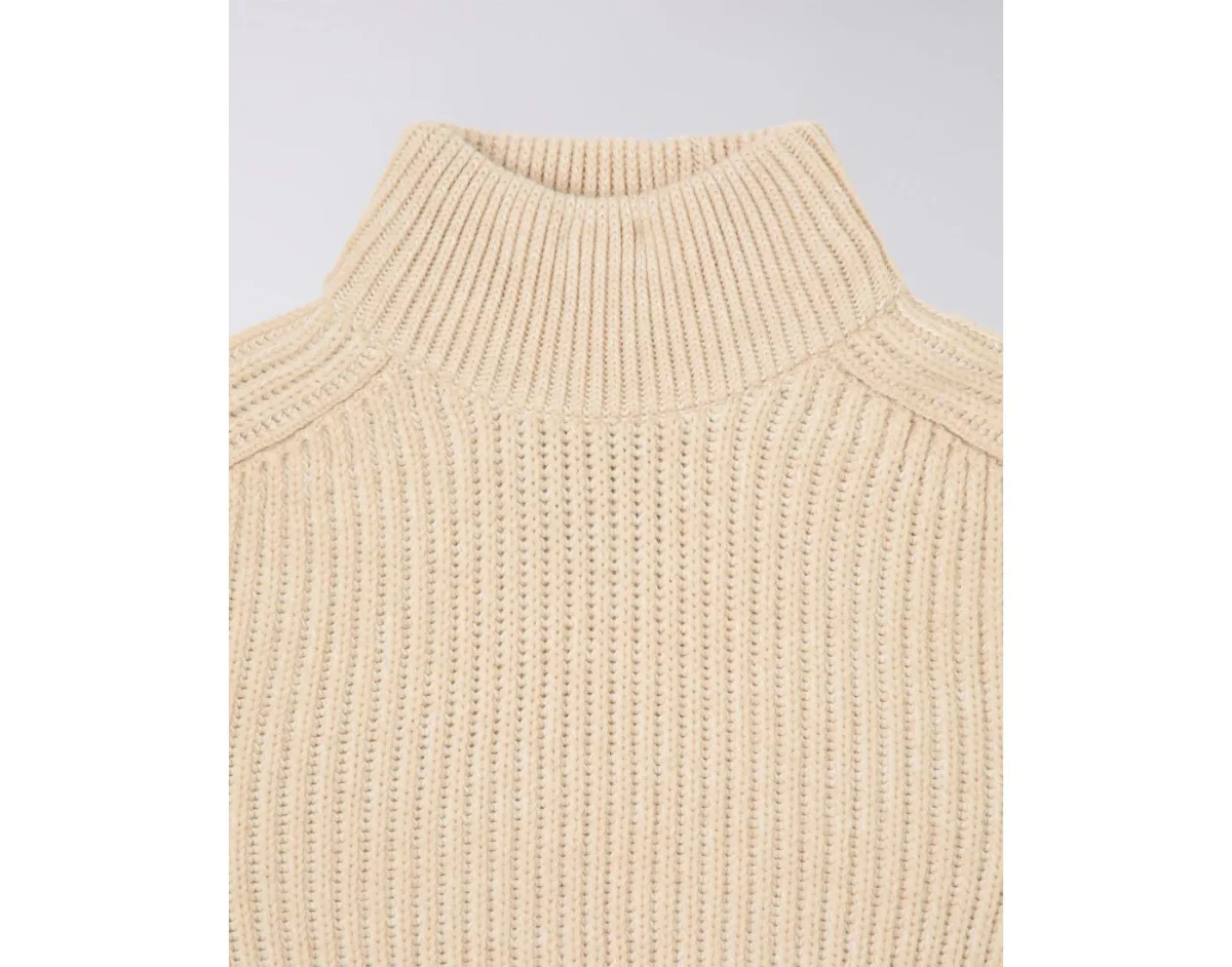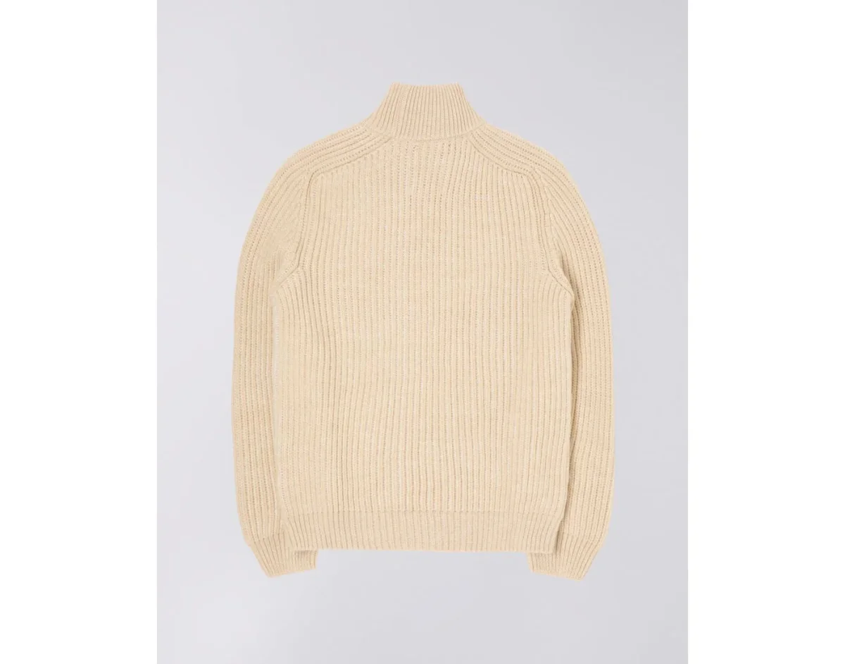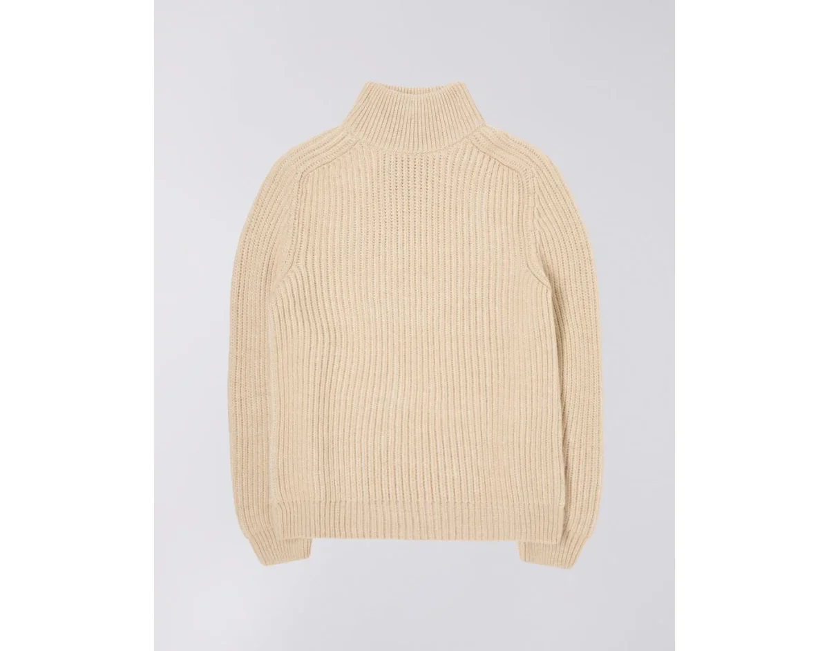 L’EDWIN Roni High Collar Sweater à col montant est un pull tricoté en fils mélangés de couleur beige, à la coupe oversize.