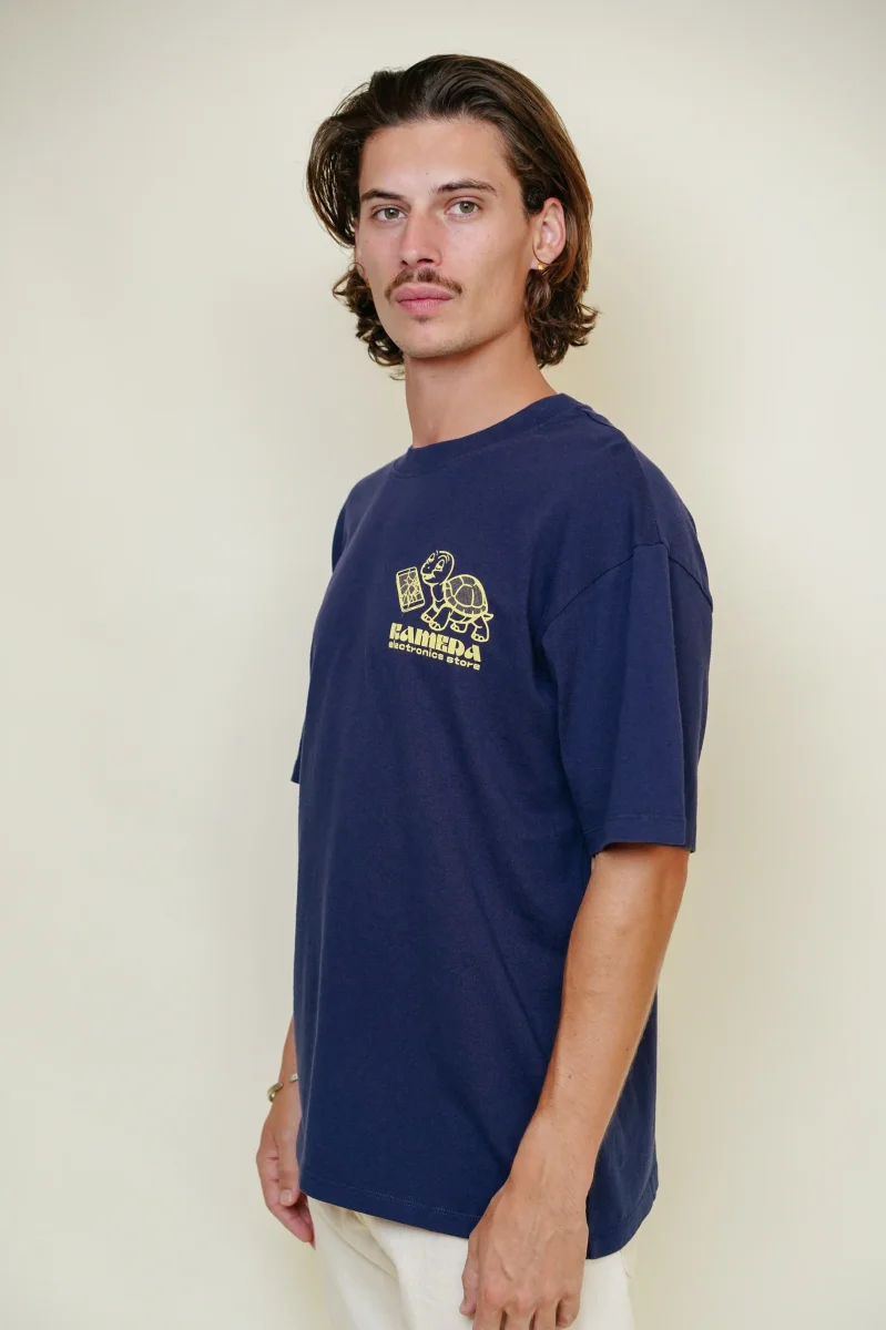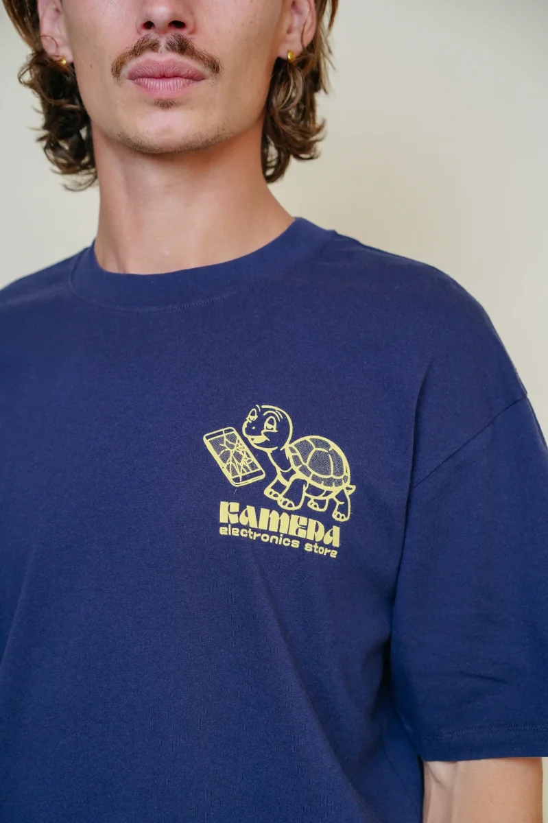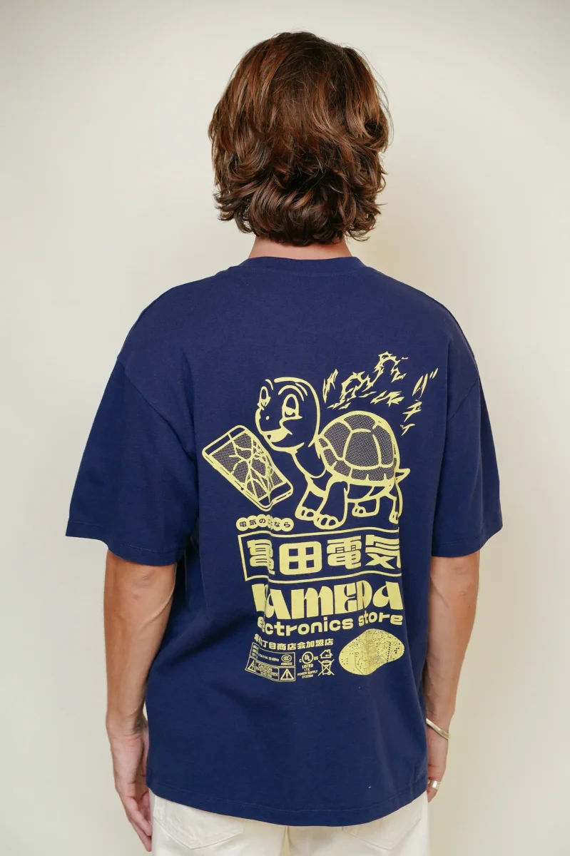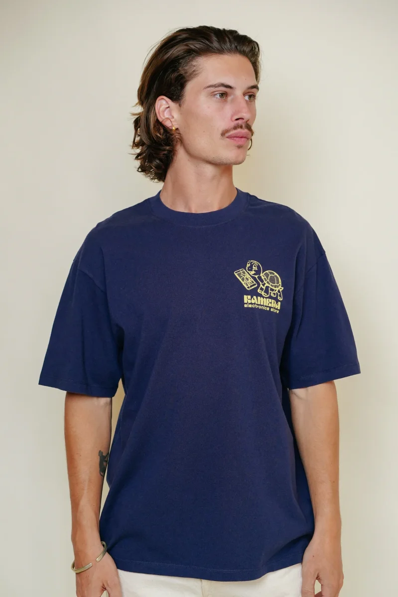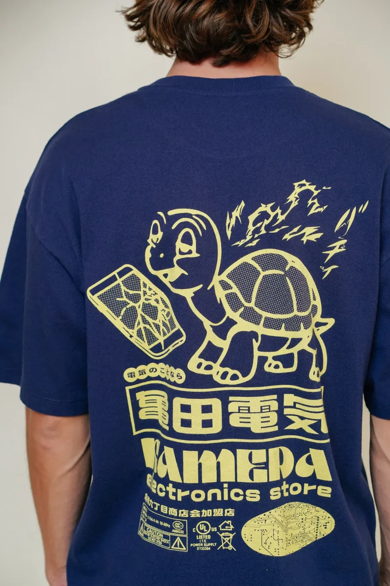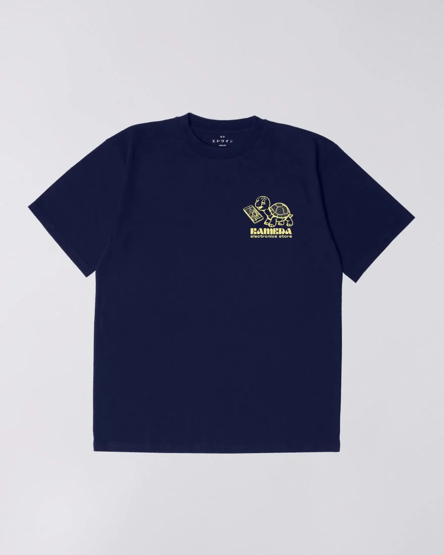 Le t-shirt EDWIN Kamera est confectionné en jersey simple 160 g/m², 100 % coton. Il présente une coupe oversize, des imprimés graphiques sur la poitrine et le dos, ainsi qu’un col côtelé pour plus de résistance et de structure.