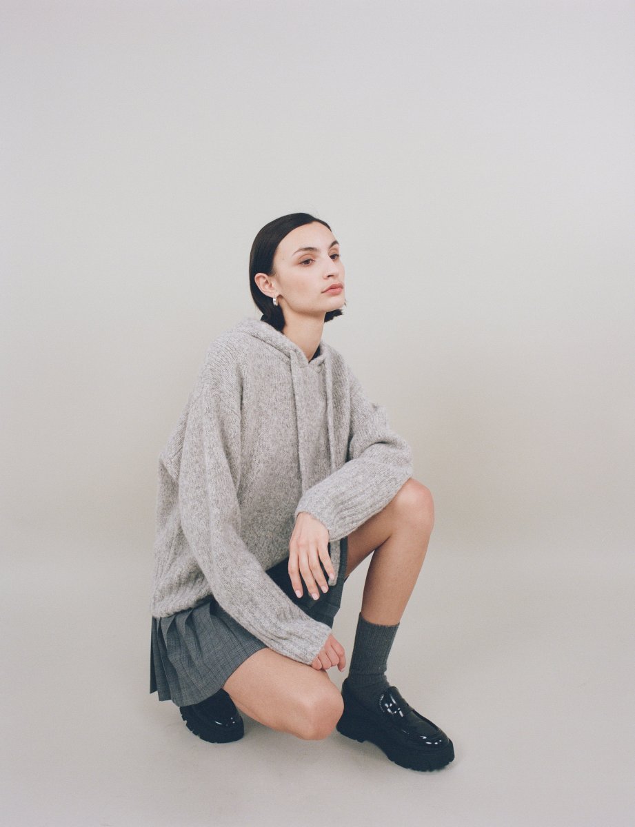 L’indispensable de saison, le pull à capuche Esthème en Alpaga.