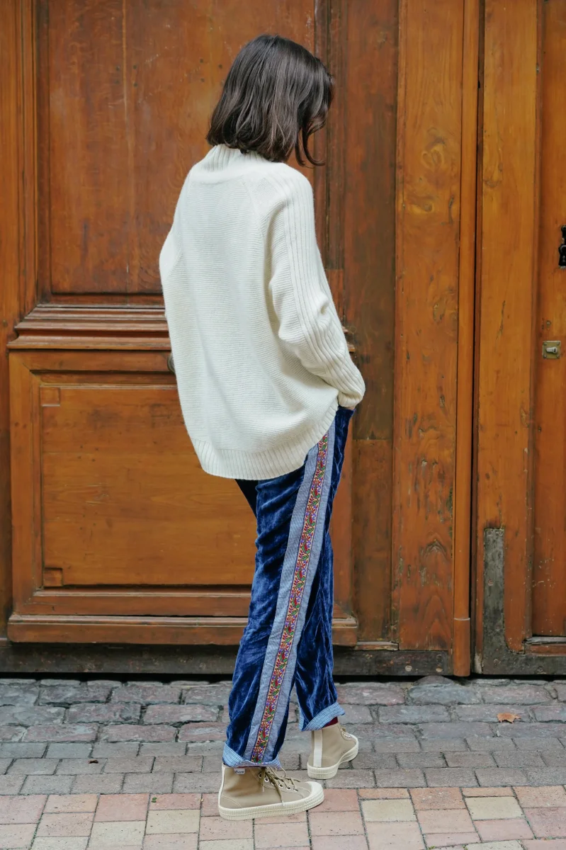 - Détails : col roulé enveloppant, emmanchures rehaussées de tressages