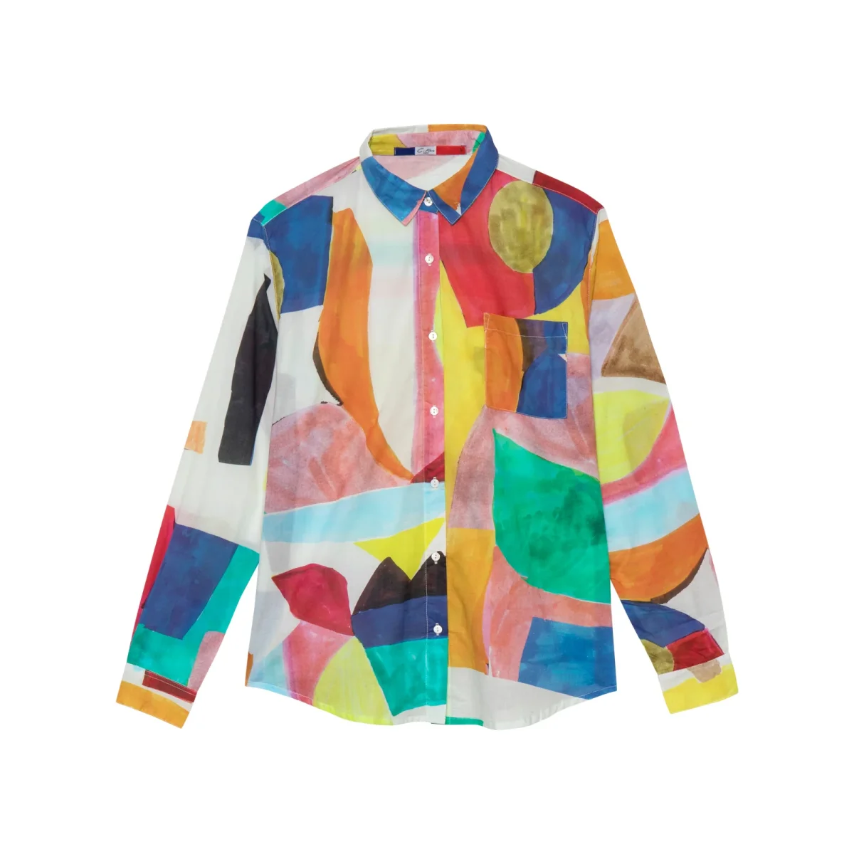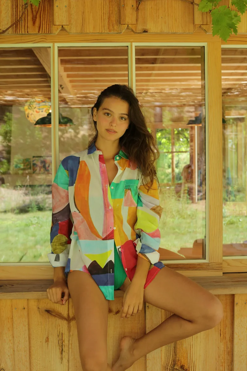 Affirmez votre style avec cette chemise en 100% coton, où l’art et la mode fusionnent dans une pièce unique et expressive. Intégralement recouverte de formes peintes à la main par Marguerite Bartherotte dans son atelier à la Pointe du Cap Ferret, chaque chemise est une véritable œuvre d’art, rendant chaque modèle absolument unique.