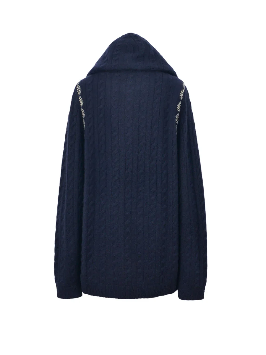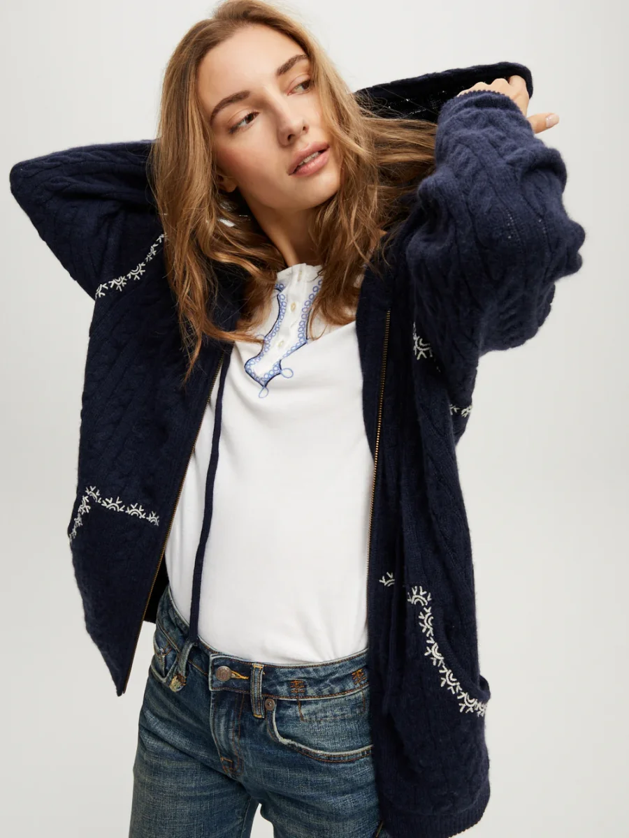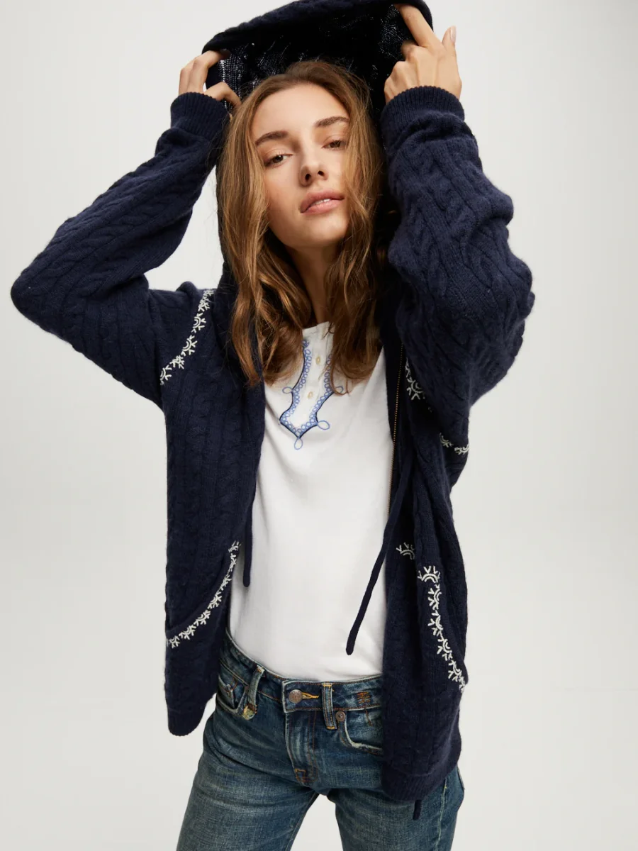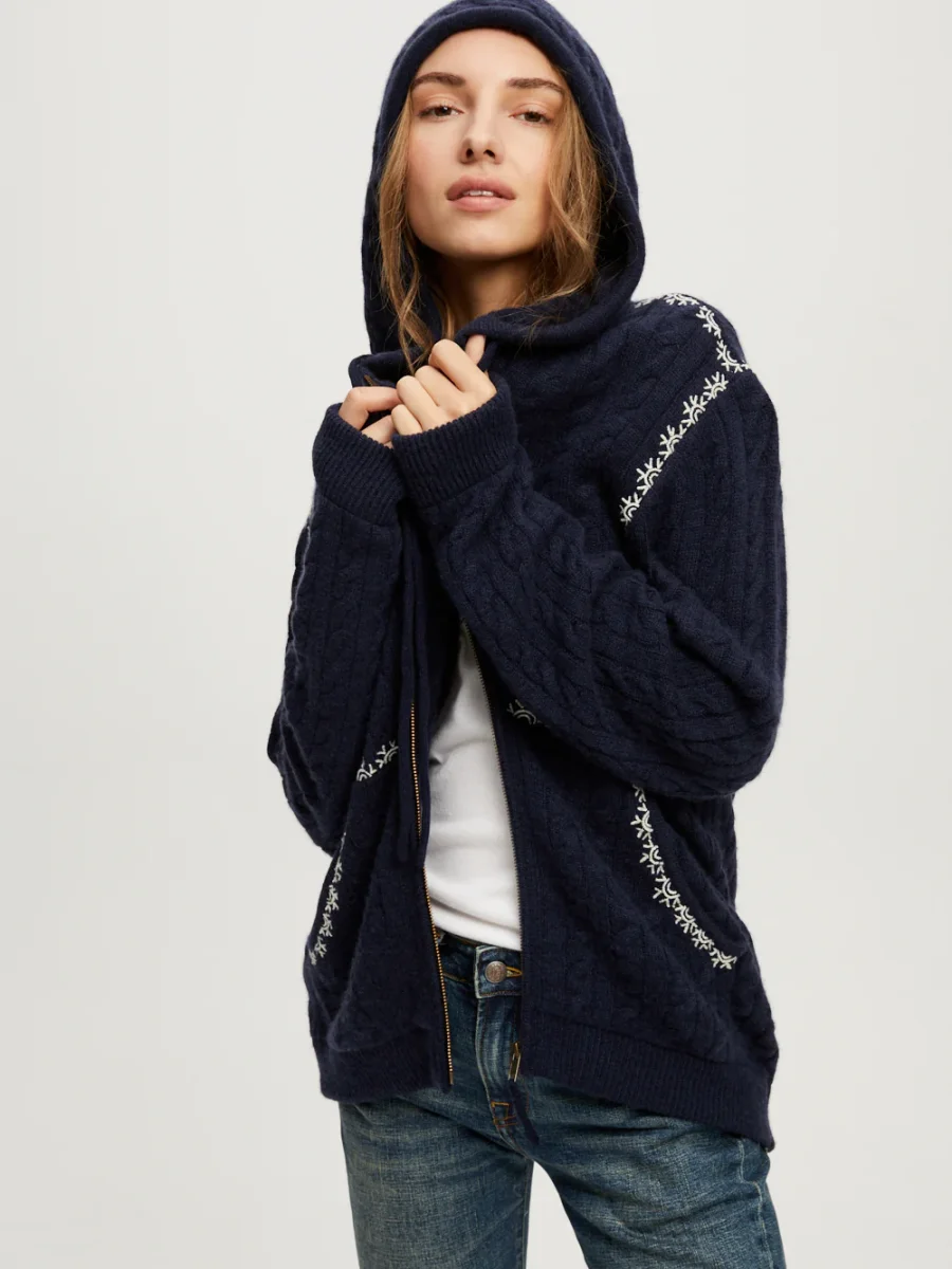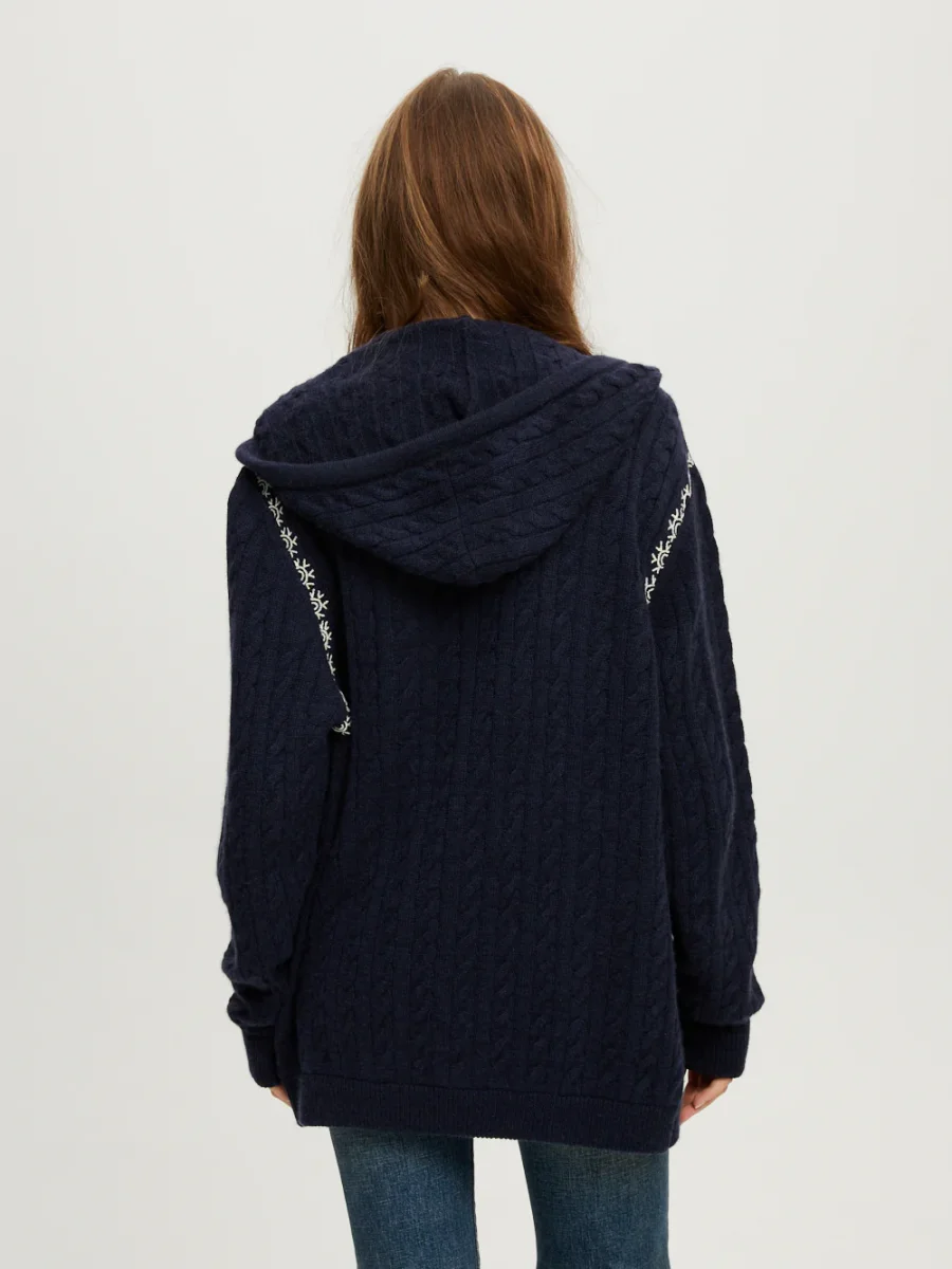Gilet Capuche Ama signé Monoki confectionné en cachemire bleu marine décoré de broderies contrastantes blanches. Une gilet zippé à capuche et aux poches kangourous sur le devant.