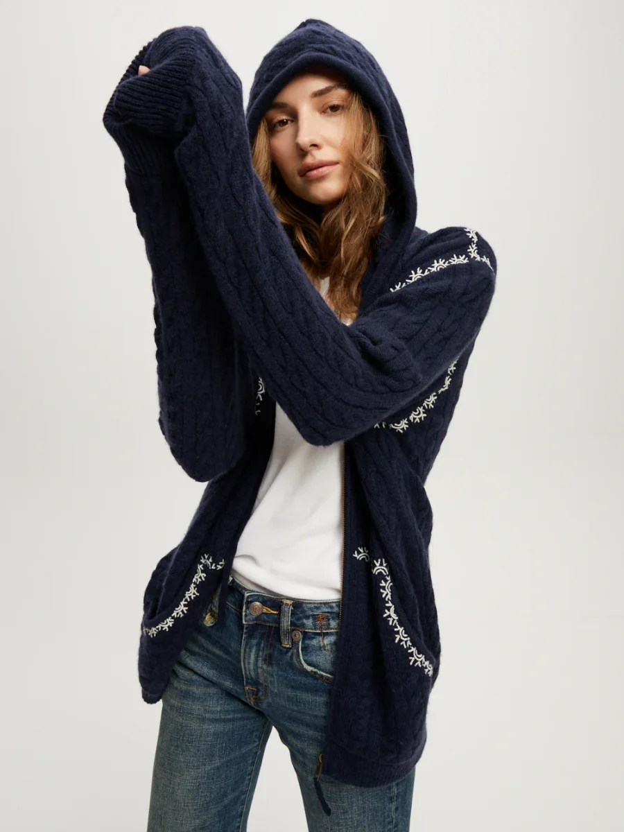 Gilet Capuche Ama signé Monoki confectionné en cachemire bleu marine décoré de broderies contrastantes blanches. Une gilet zippé à capuche et aux poches kangourous sur le devant. – Taille Unique