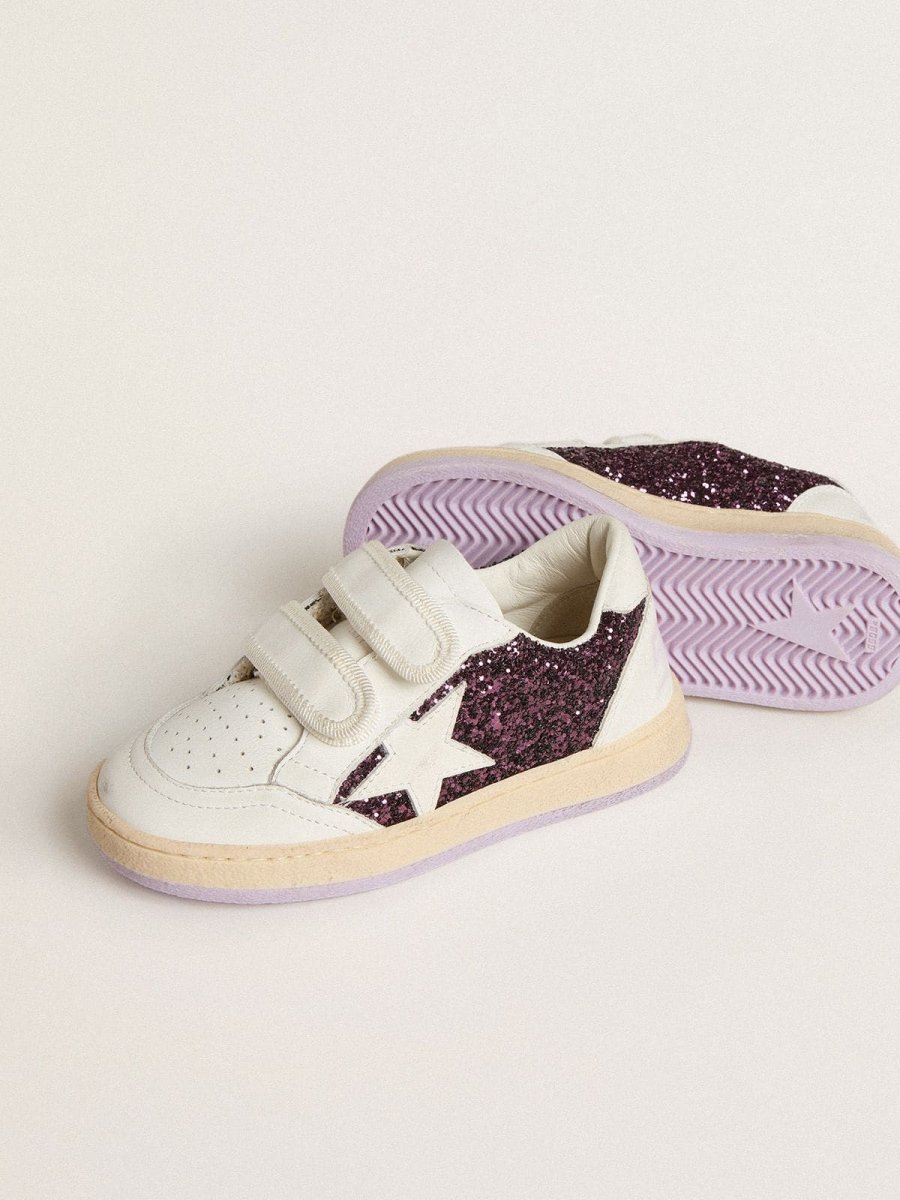 Rêvez des années 1980. Nos sneakers Ball Star font référence à l’esprit des universités américaines, entre un tir au panier et un tour en skateboard. Doté d’une tige à paillettes violettes, ce modèle version Young se distingue par une étoile et un contrefort en cuir blanc. La fermeture à scratch en cuir blanc et le smiley sur la bande de renfort apportent la touche finale : les belles choses ne se démodent jamais.