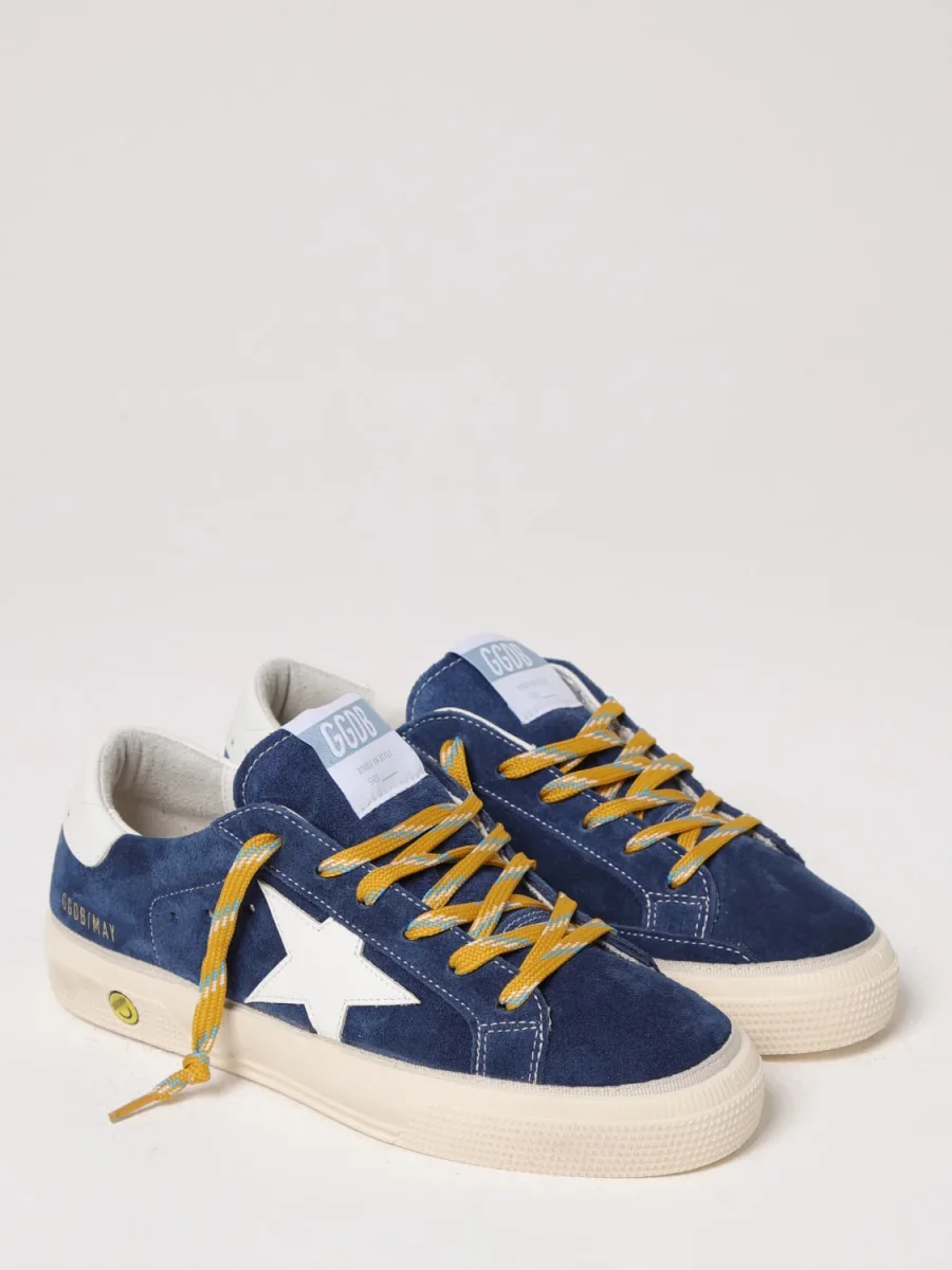 L’inspiration années 70 et le style rétro rencontrent le savoir-faire artisanal qui distingue les sneakers Golden Goose. Ces sneakers May version se distinguent par un cuir suede navy, une étoile en cuir bleu et un contrefort en cuir blanc optique. Le bord couleur crème et les lacets jaunes complètent le style.
