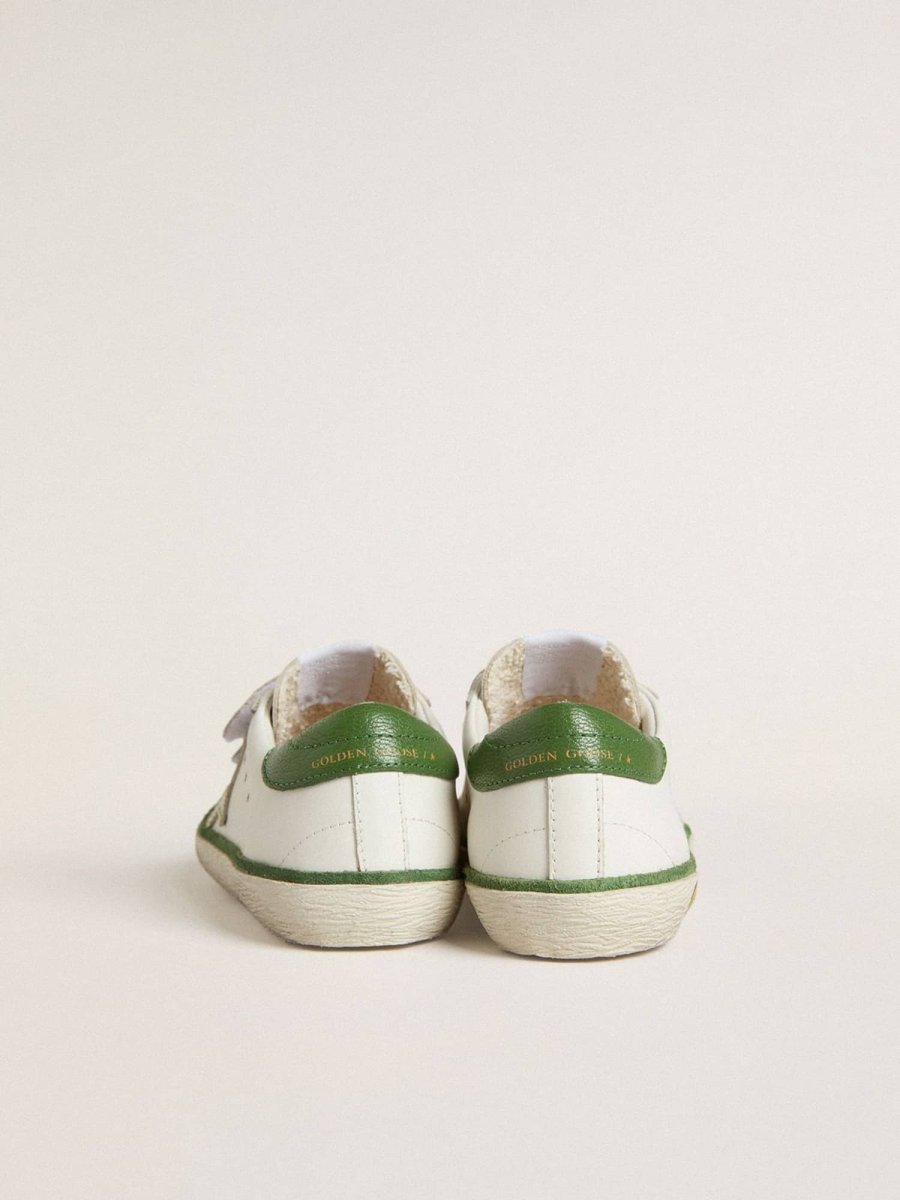 Nos sneakers Old School sont dotées de deux bandes avec fermeture à scratch sur le devant rehaussée du logo contrasté. Doté d’une tige en cuir blanc, ce modèle version Young se distingue par une étoile en cuir couleur crème rehaussée de surpiqûres vertes, un contrefort en cuir nappa vert et un empiècement en daim vert. Le smiley contrasté sur la bande de renfort apporte la touche finale.