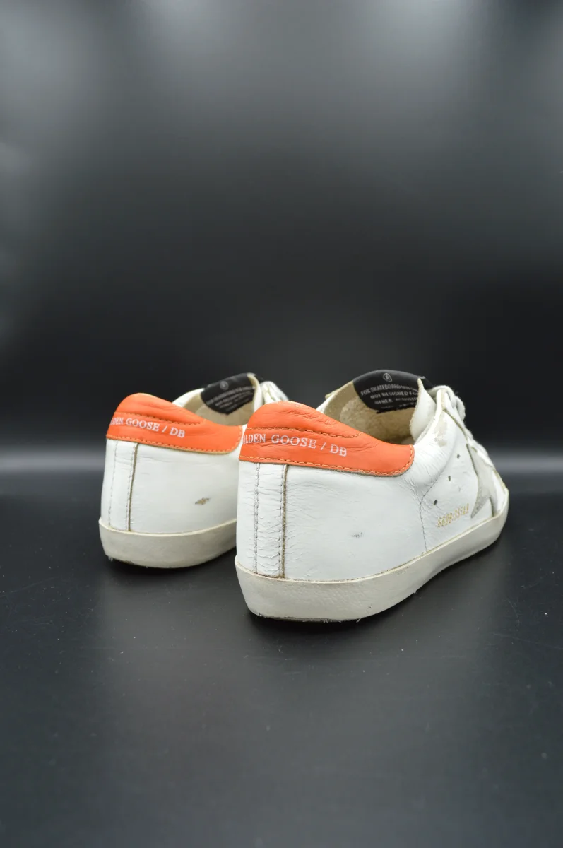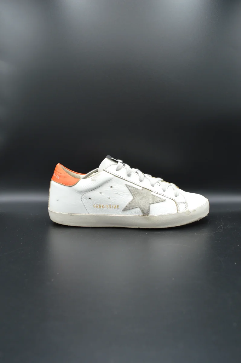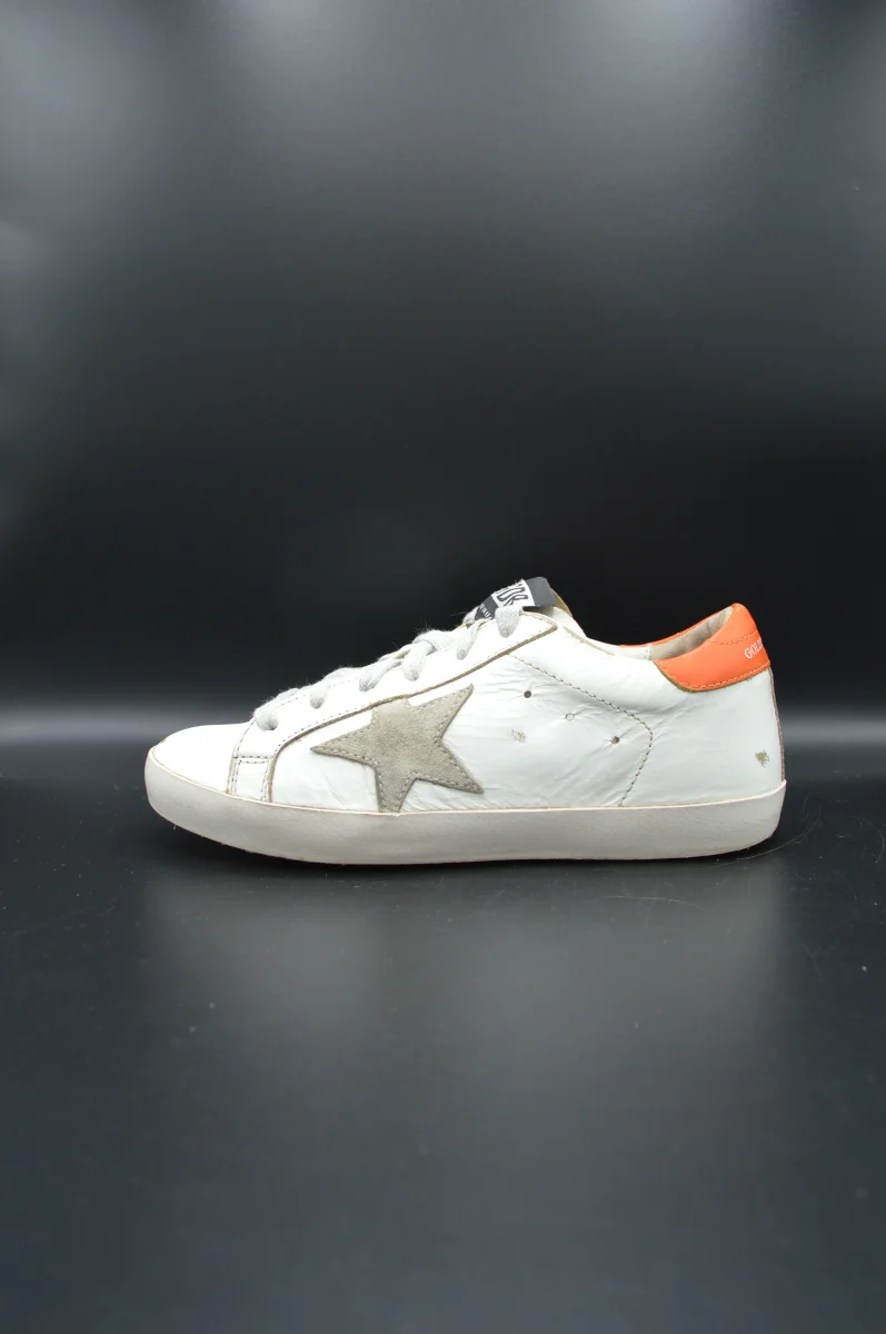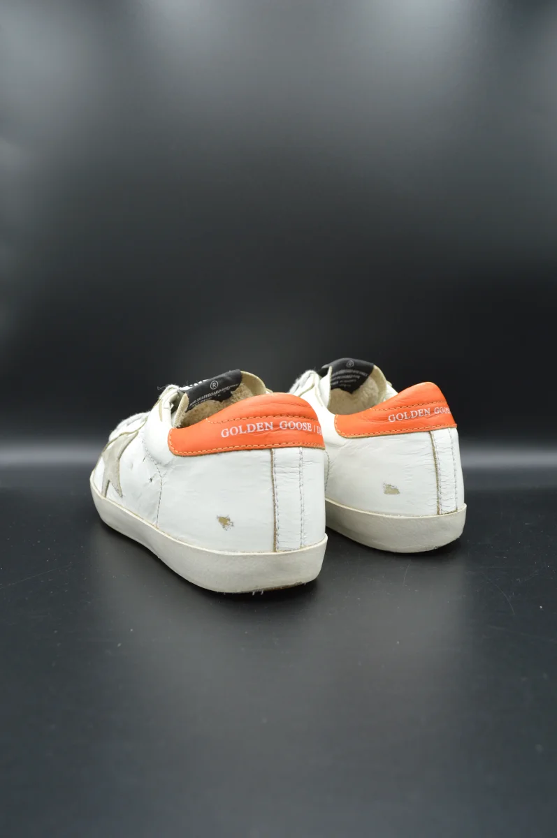 Détails de l’article : Marque : Golden Goose Modèle : Superstar Pointure : 36 Etat : Très bon état Couleur : Blanc, gris et orange Matière : Cuir lisse et daim Accessoires inclus : Boite et passeport golden goose
