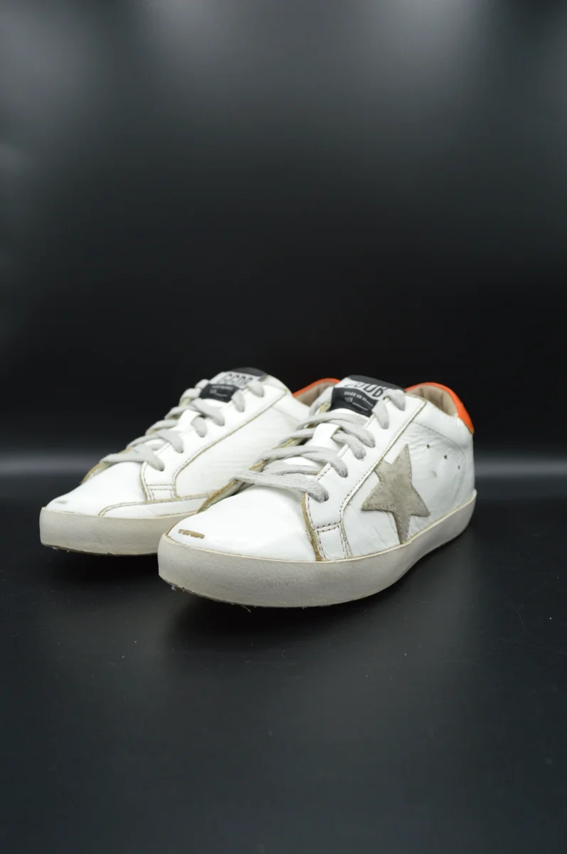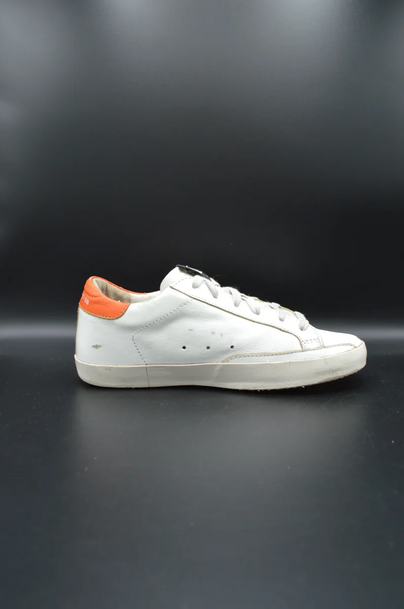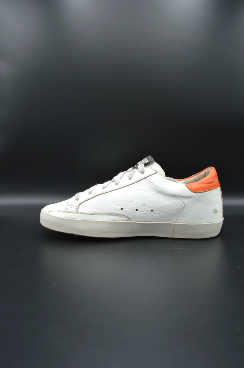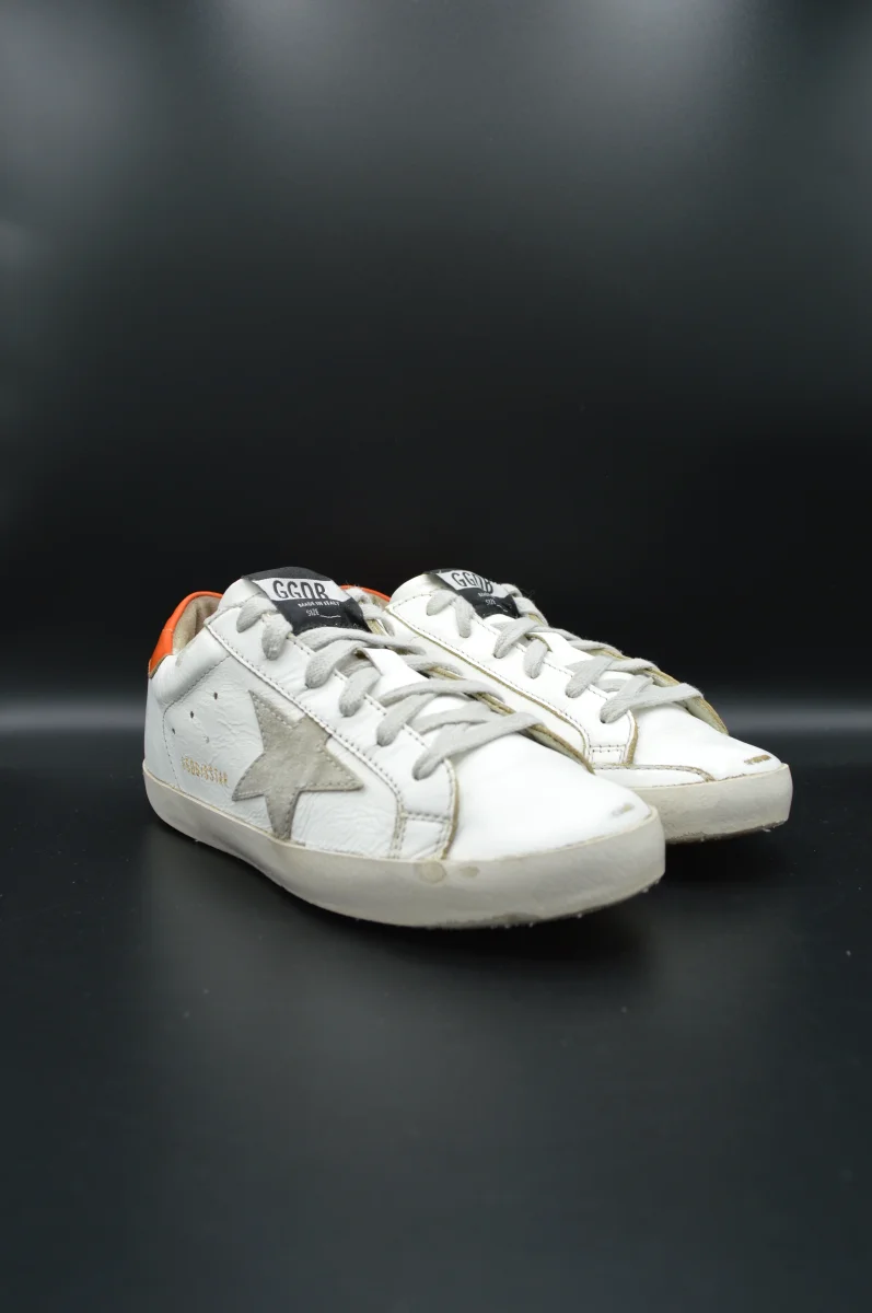 Détails de l’article : Marque : Golden Goose Modèle : Superstar Pointure : 36 Etat : Très bon état Couleur : Blanc, gris et orange Matière : Cuir lisse et daim Accessoires inclus : Boite et passeport golden goose