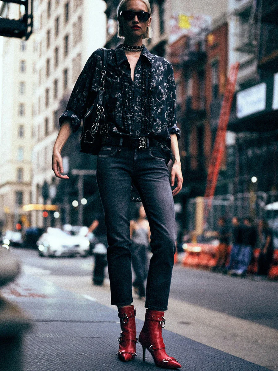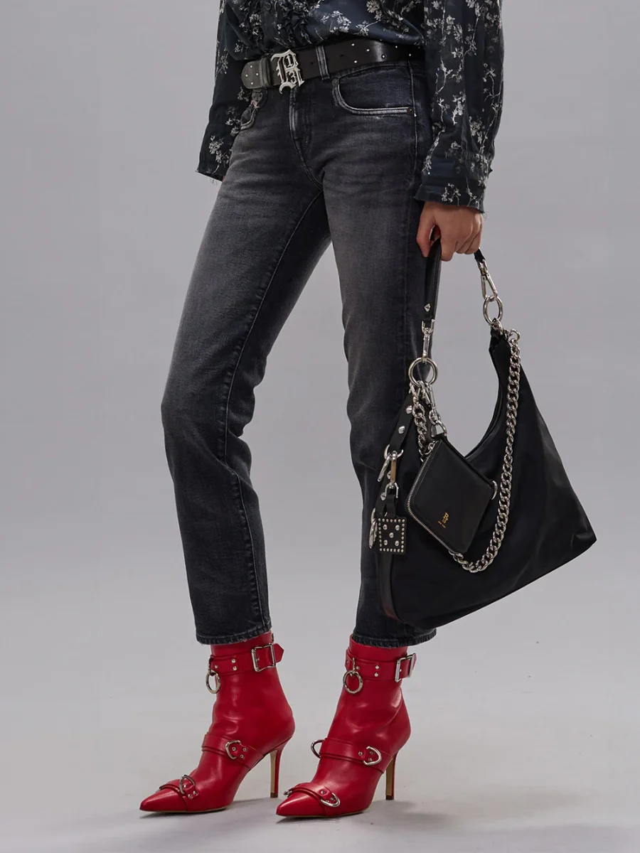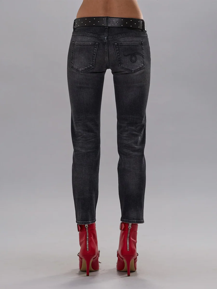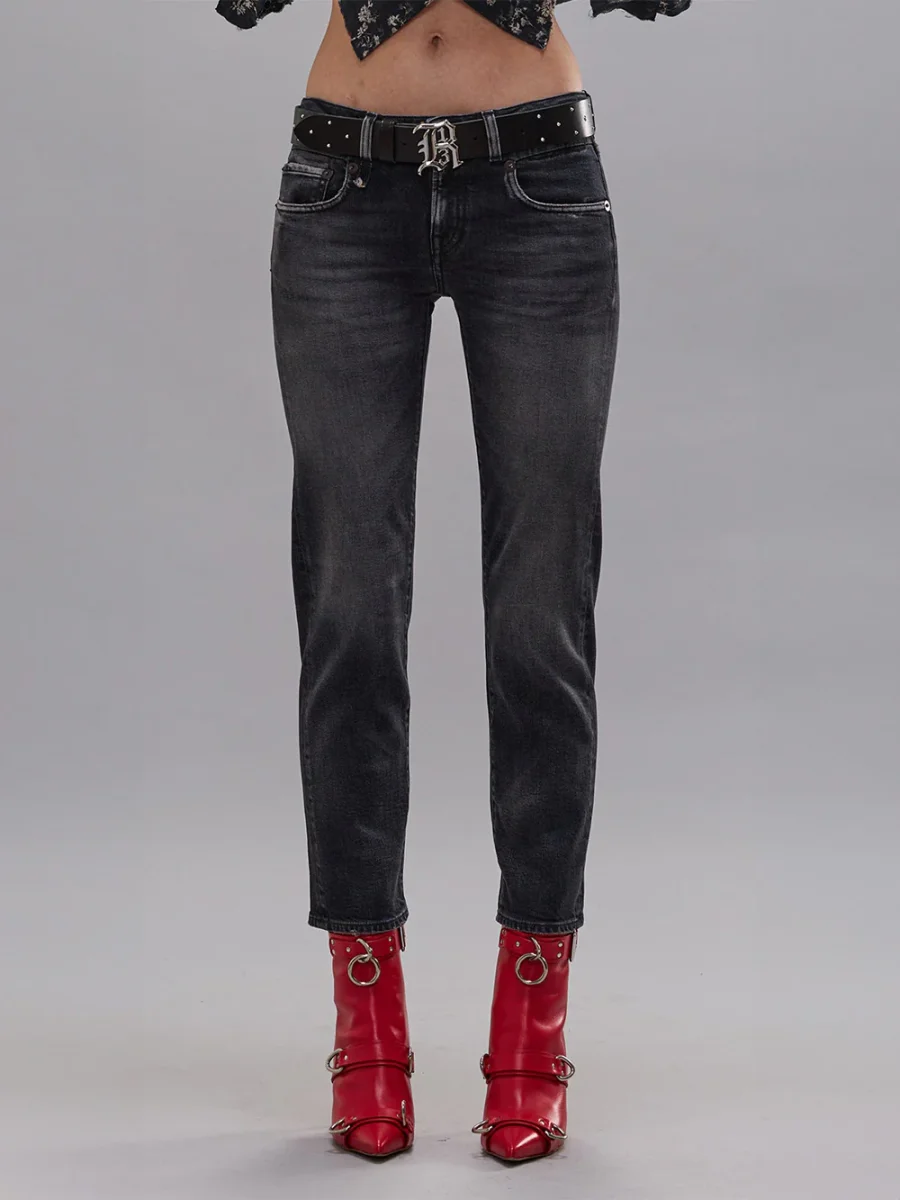 Jean Boy Straight coloris Essex Black Stretch de R13 confectionné en coton noir délavé. Il possède une coupe droite avec une taille basse et est légèrement raccourci sur les chevilles. – Matière stretch et confortable – Cinq poches – Passants à la taille pour enfiler une ceinture – Fabriqué en Italie