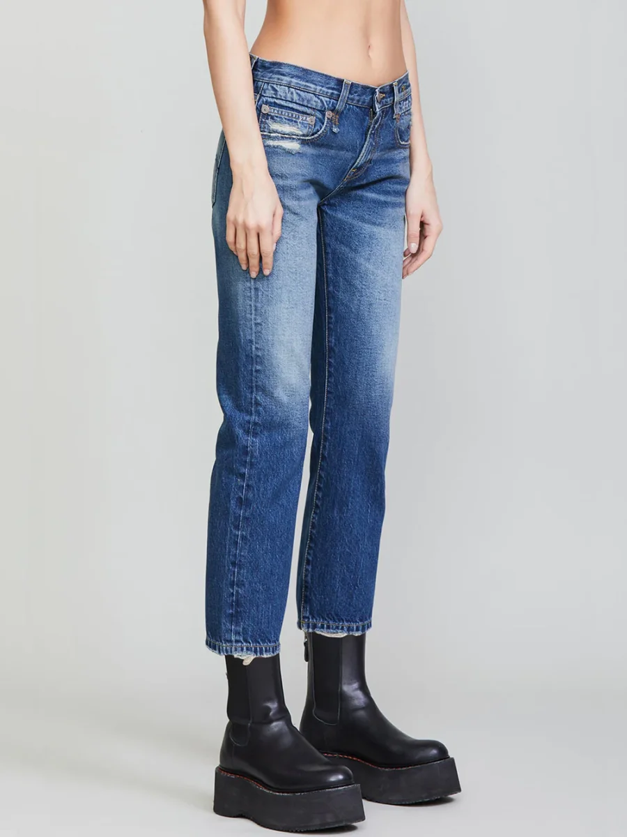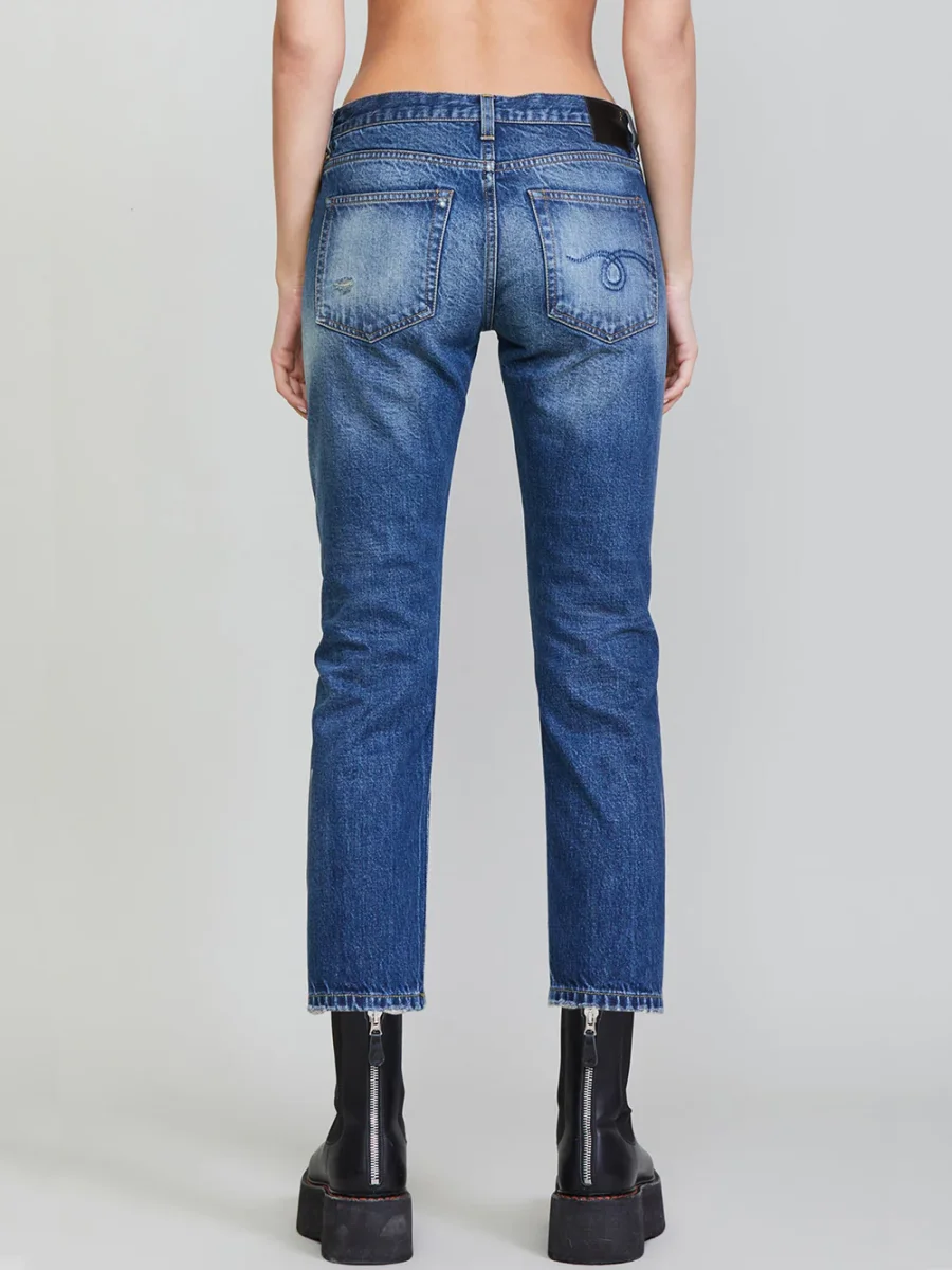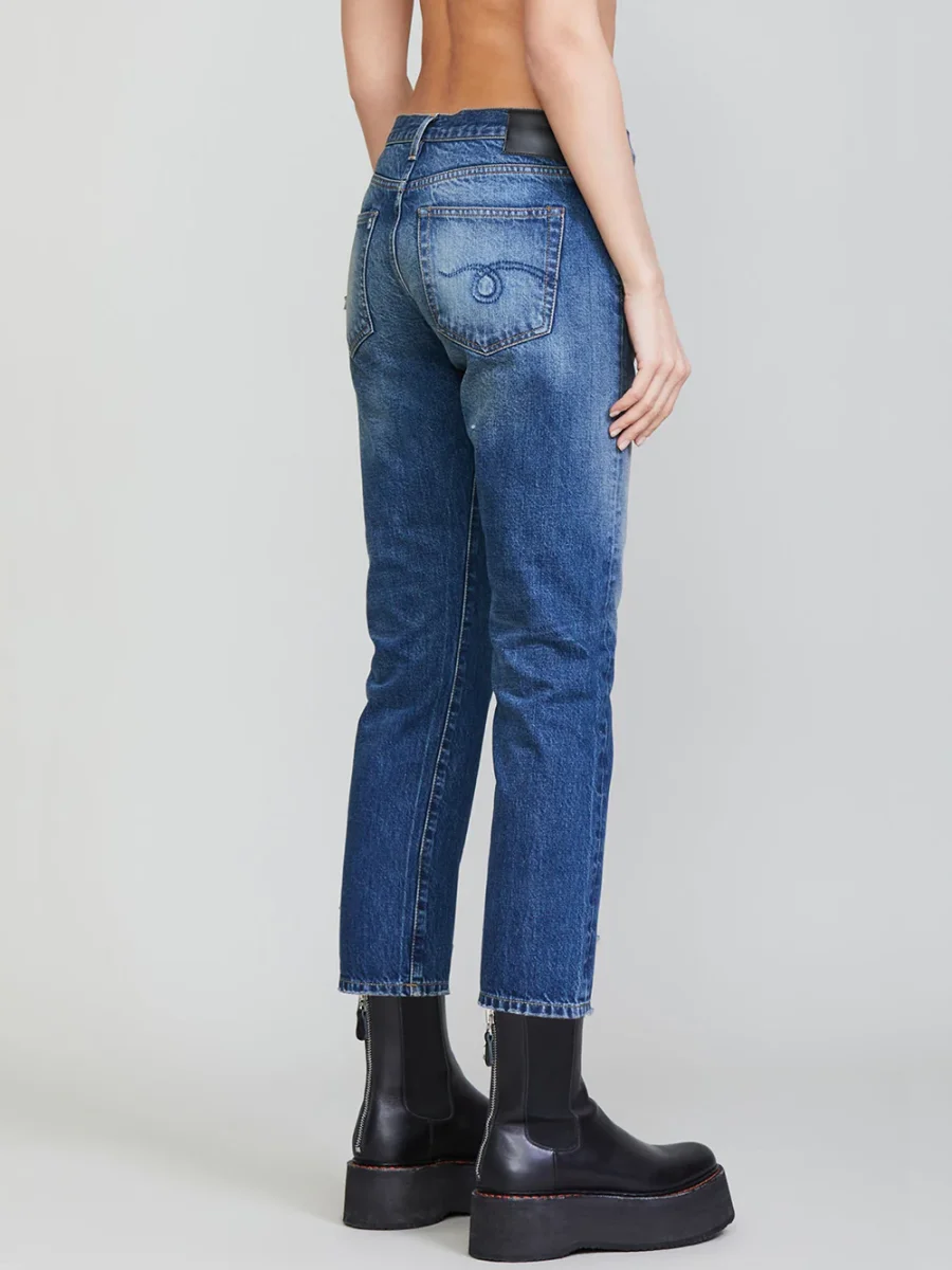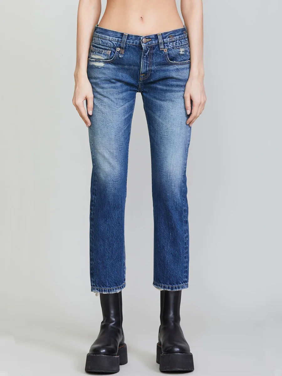 Jean Boy Straight R13. Ce jean taille basse a une coupe droite courte et légèrement évasée. Le modèle a deux poches à l’avant dont une poche briquet et deux poches à l’arrière. Le jean est doté d’un lavage indigo vintage.