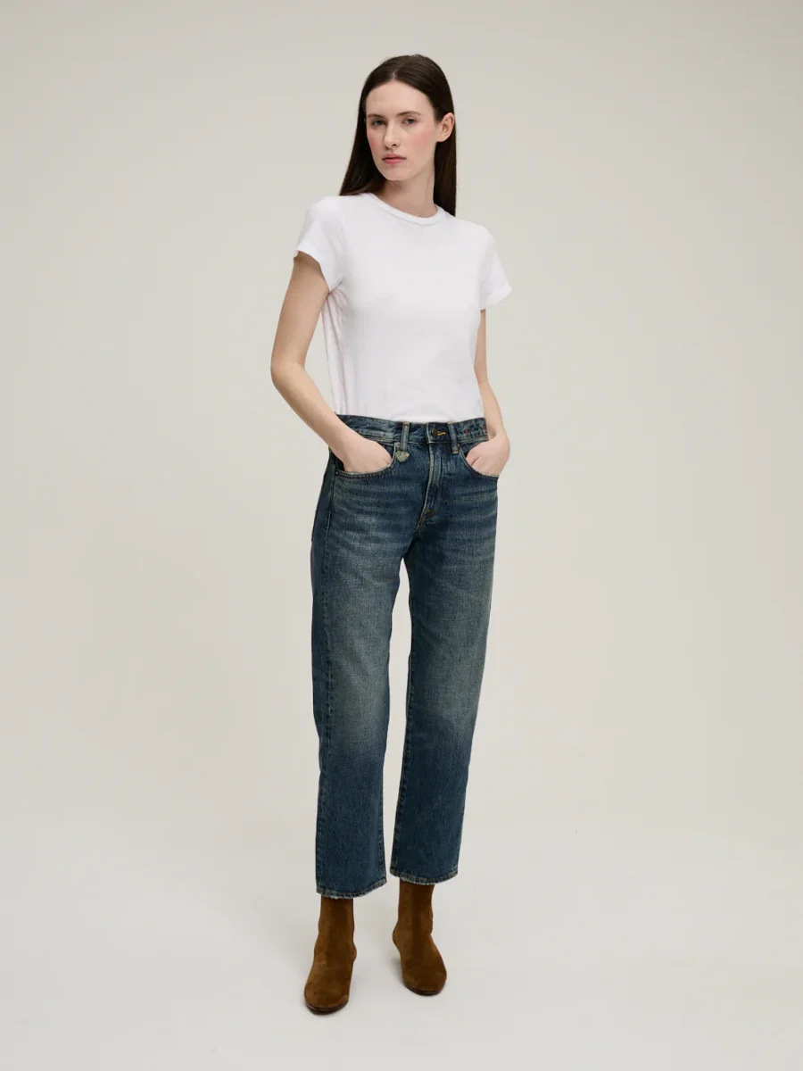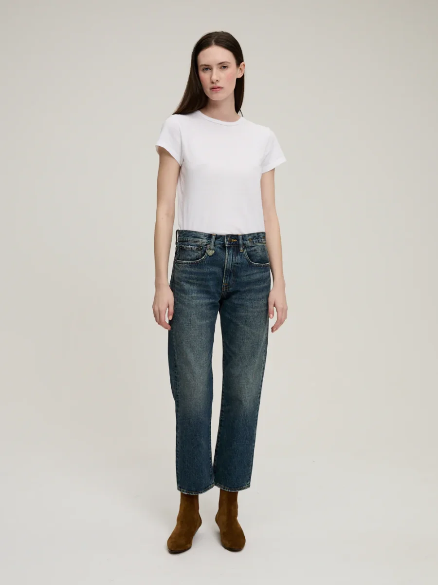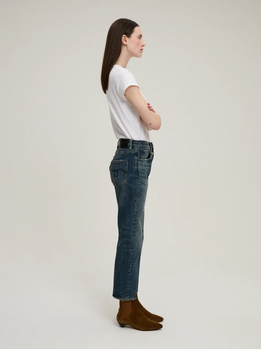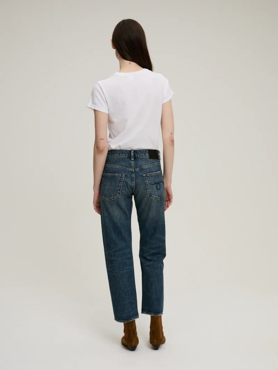 Jean Boyfriend Renegade Blue signé R13 confectionné dans une toile de coton japonaise de couleur bleu foncé. Une coupe droite, à la taille mi-haute et de longueur 7/8ème.