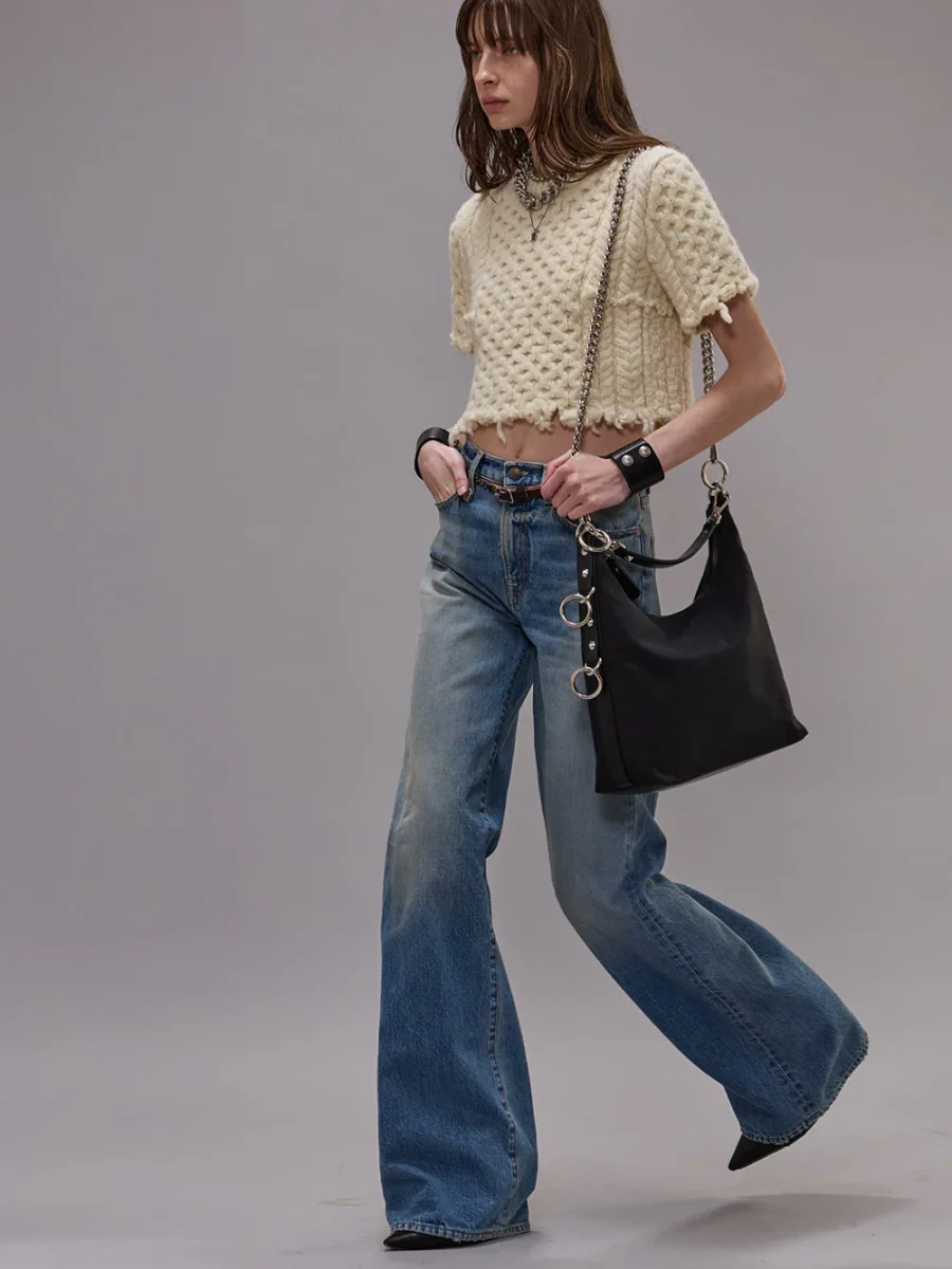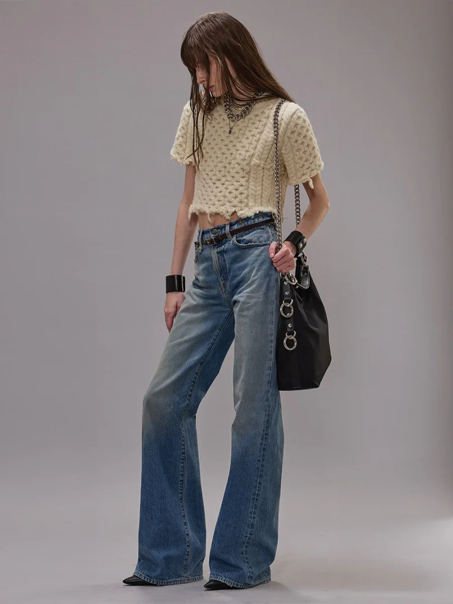 Jean Charlotte Merrin Blue signé R13 confectionné dans un toile de coton au délavage bleu moyen. Une jean taille haute à la coupe évasée au niveau des jambes. – Toile denim 13oz – Ce modèle taille légèrement petit, si vous êtes entre deux tailles, nous vous conseillons de prendre la taille du dessus