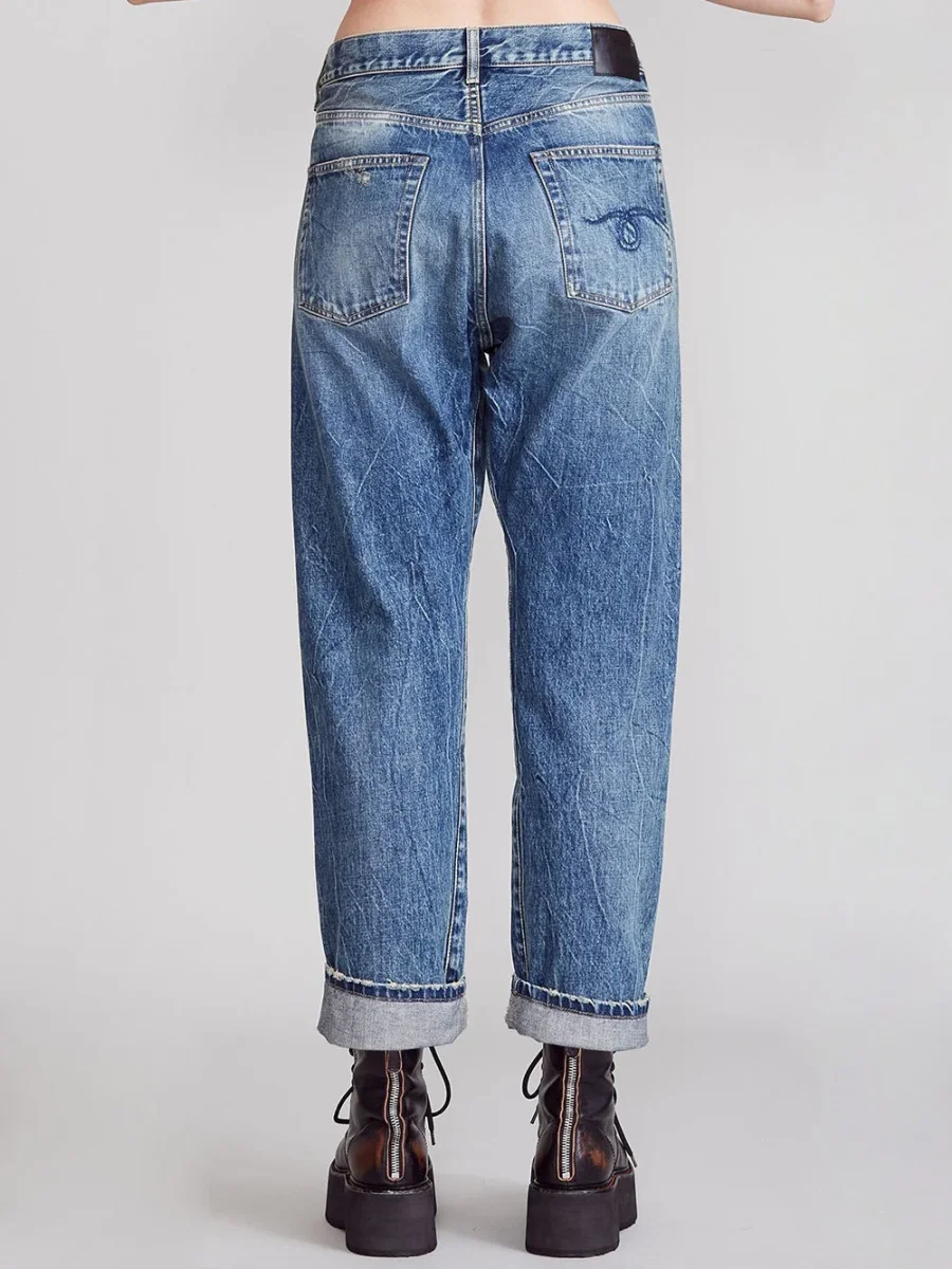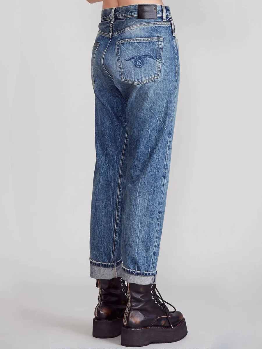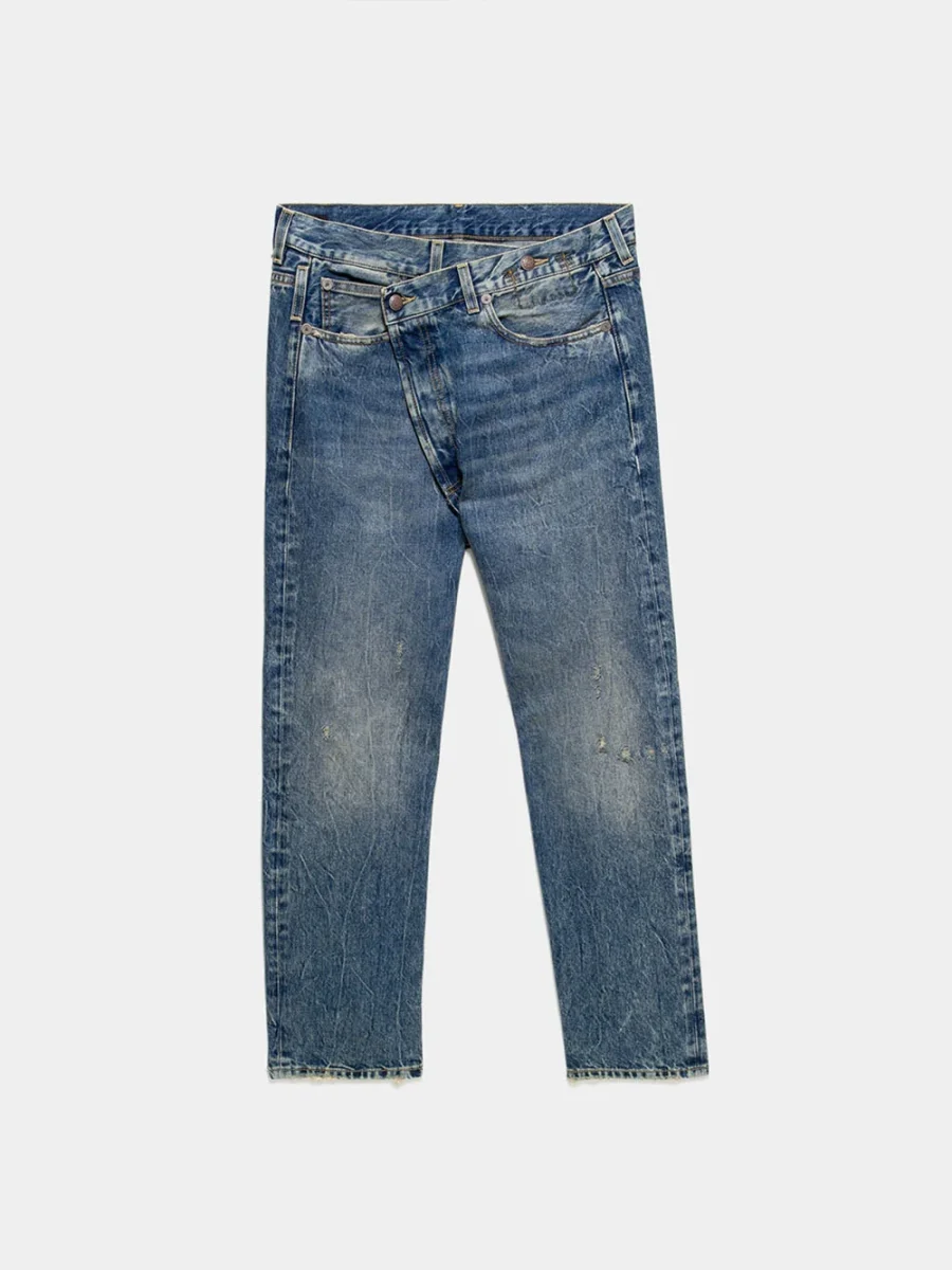 Jean Cross Over R13. Ce jean est doté d’une taille asymétrique et croisée qui forme un V flatteur. Il se ferme à l’aide dun bouton. La pièce est réalisée en denim italien rigide qui a été délavé et vieilli pour rappeler un modèle vintage. Le jean présente des jambes larges.