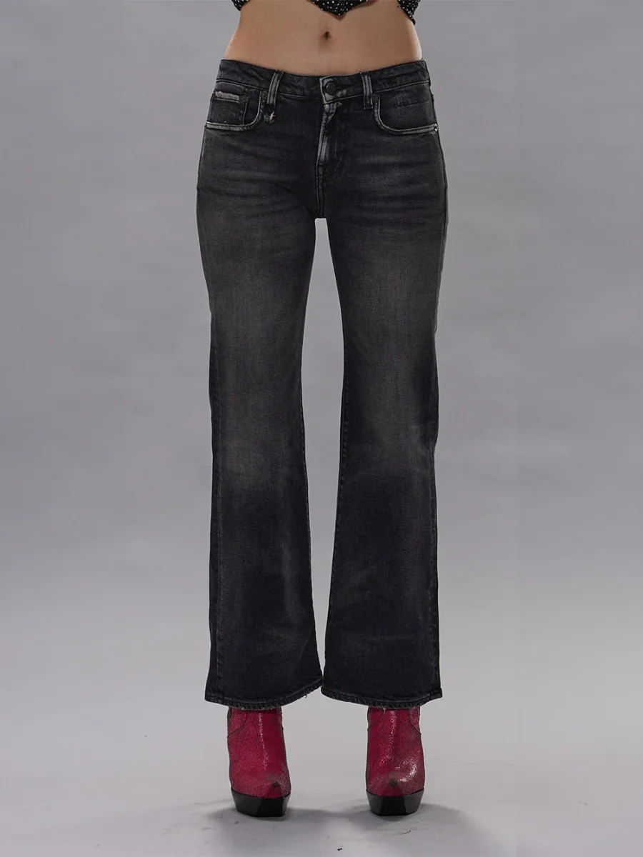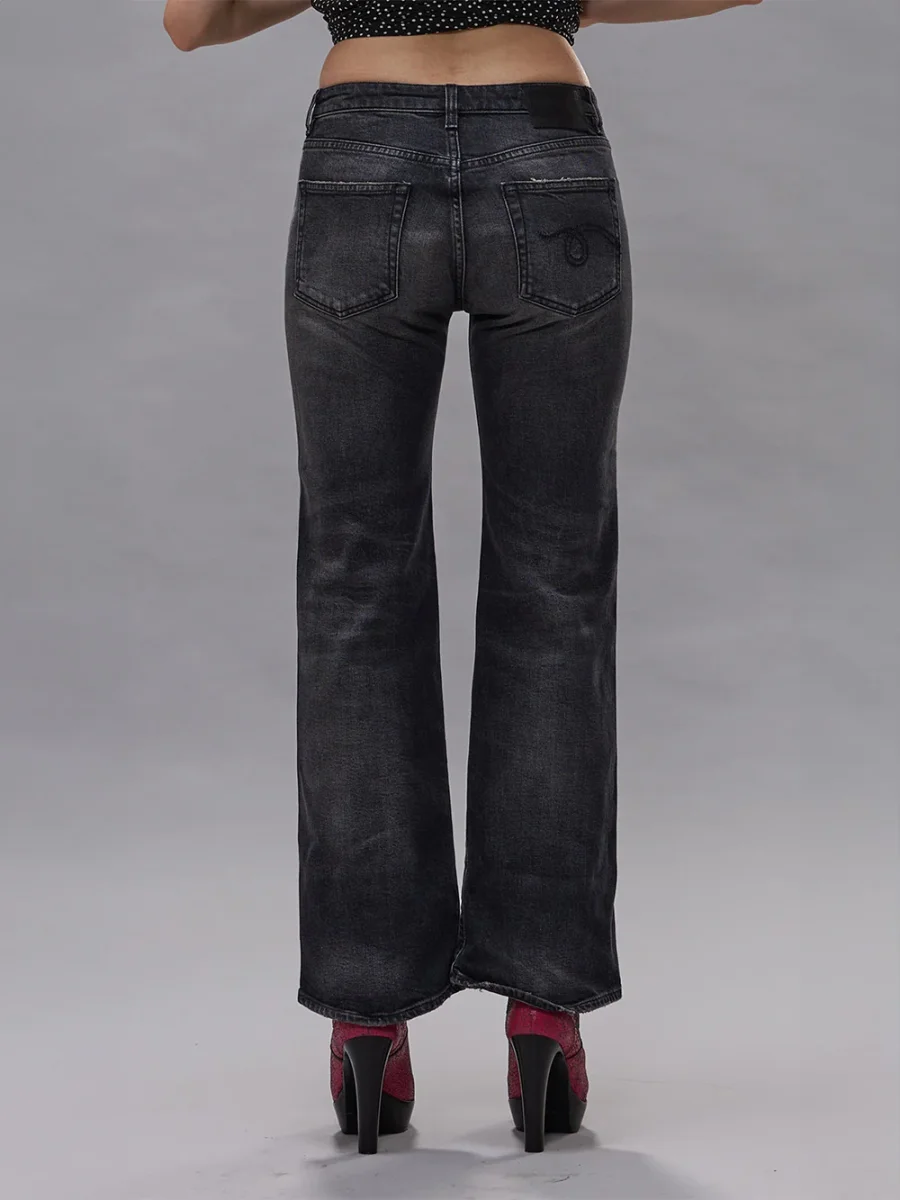 Jean Joan Kick Essex Black signé R13 confectionné en toile de coton noir délavé. Un pantalon à la taille mi-haute et à la coupe légèrement évasée au niveau des chevilles. – Fabriqué en Italie – Longueur 7/8 – Poches en fente à l’avant et plaquées à l’arrière