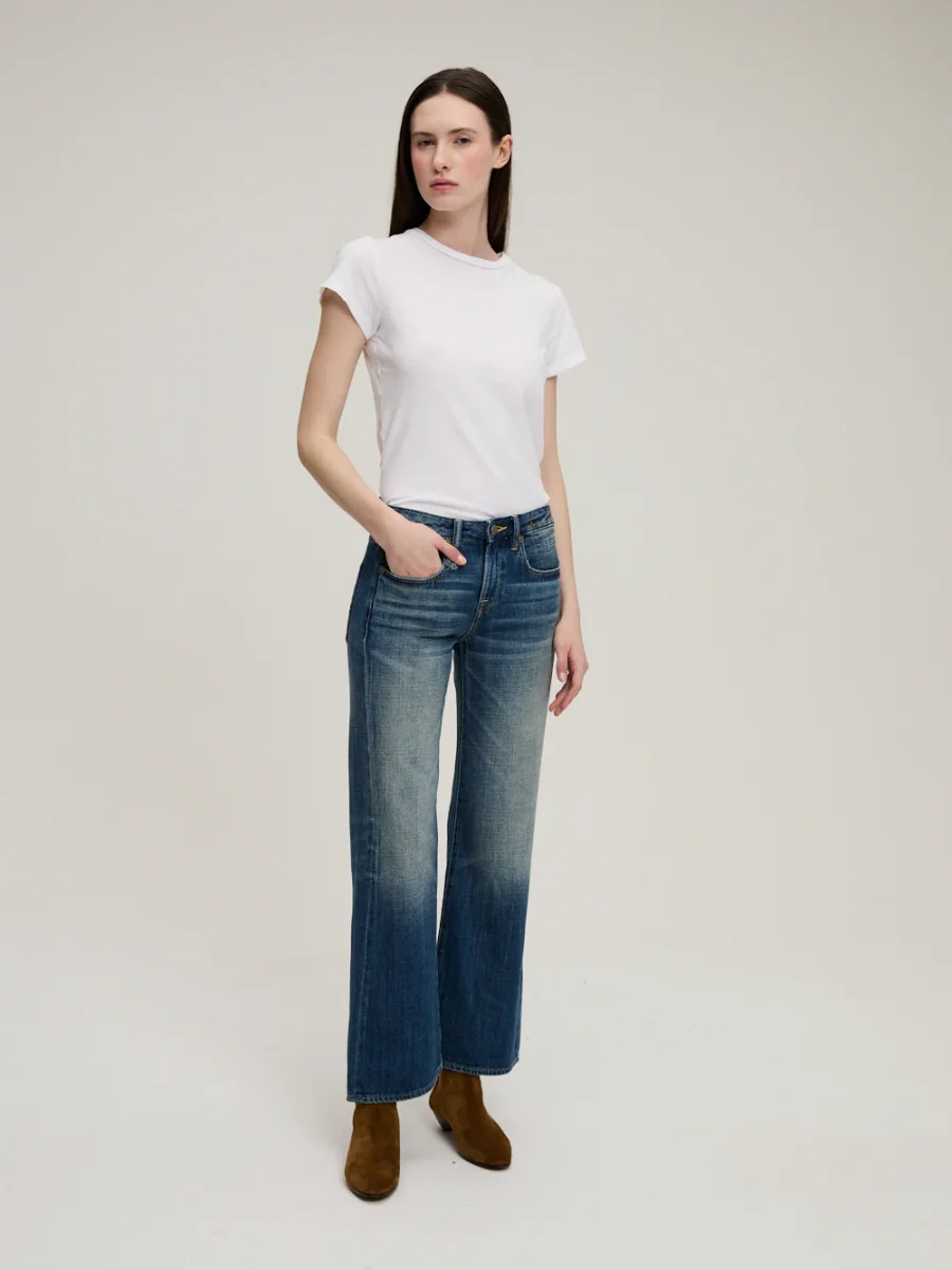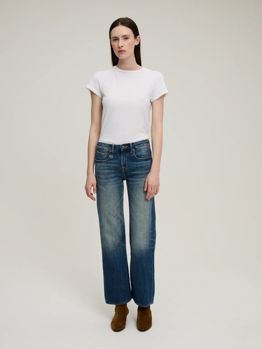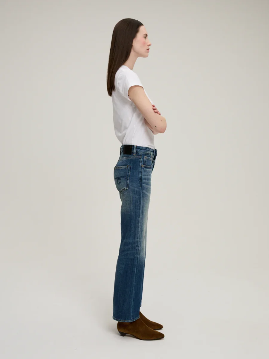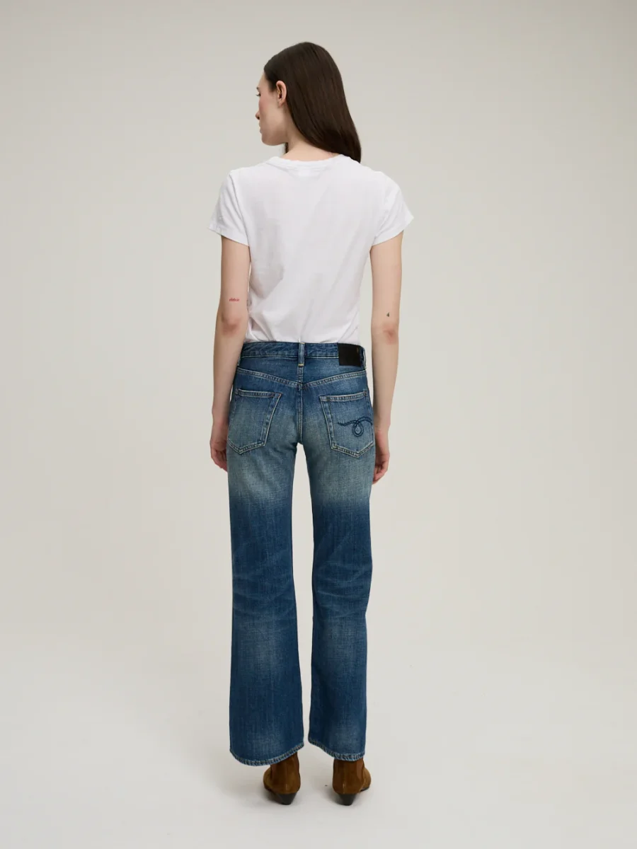 Jean Joan Kick Raine Blue signé R13 confectionné en toile de coton bleu foncé, délavée sur le devant. Un pantalon à la taille mi-haute et à la coupe légèrement évasée au niveau des chevilles.