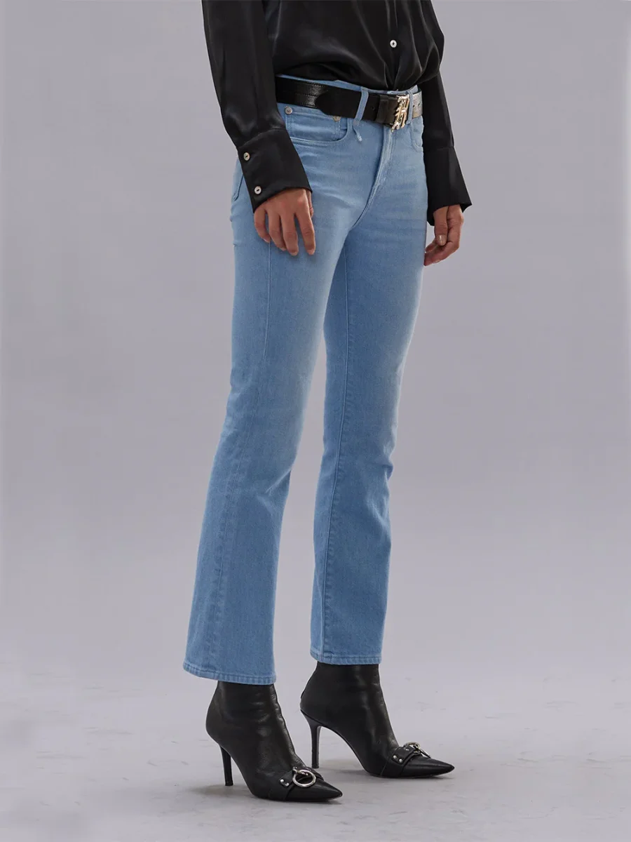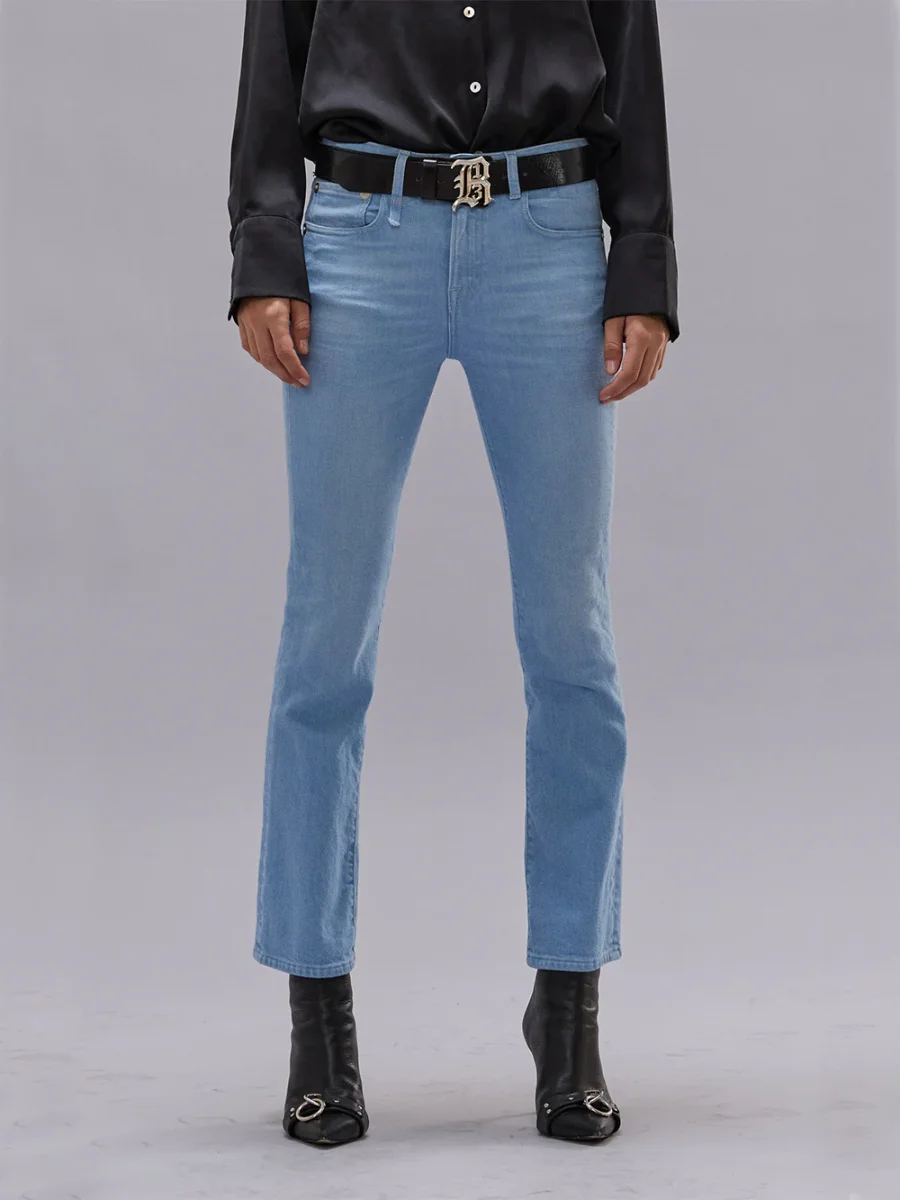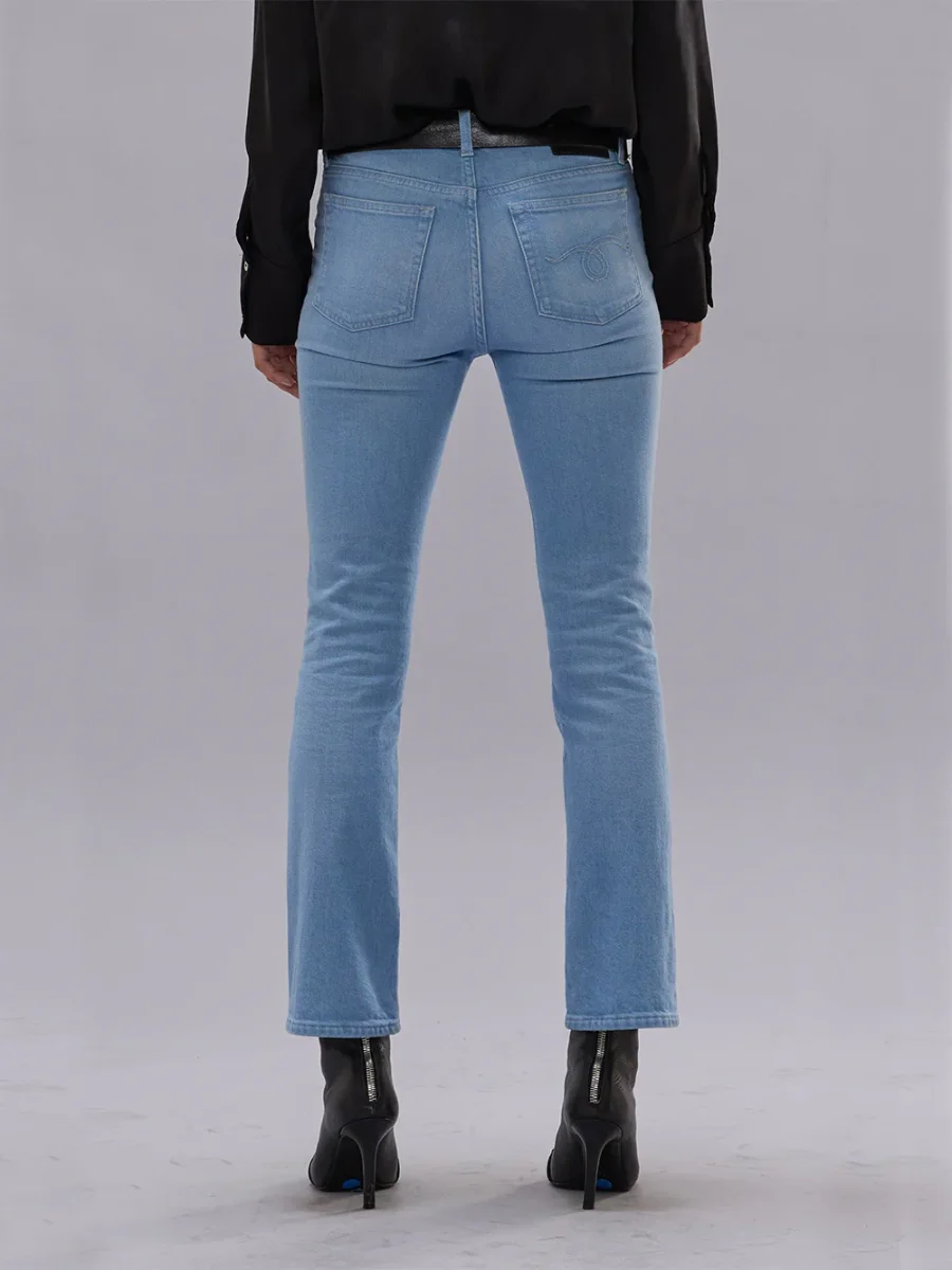 Jean Kick Fit coloris Baby Blue Stretch signé R13 confectionné en denim bleu clair. Une coupe slim légèrement évasée au niveau des chevilles. – Taille mi-haute – Légèrement évasé sur le bas – Coupe slim et courte– 5 poches – Passants pour ceinture – Fermeture par zip et bouton