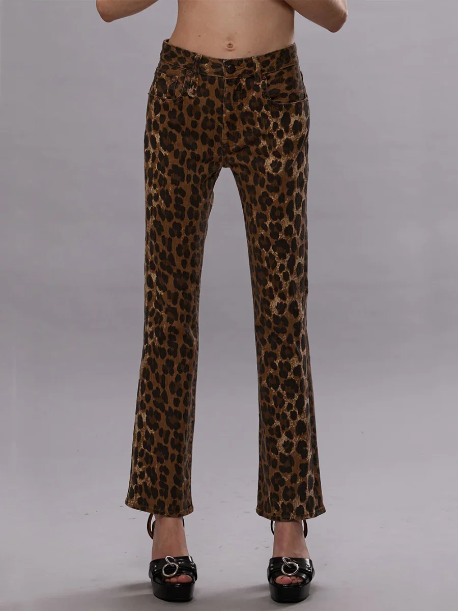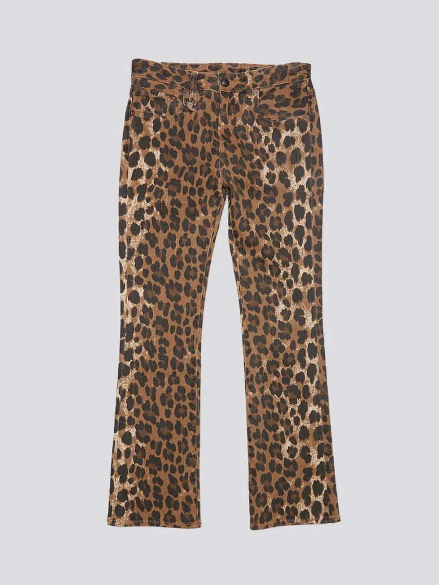Jean Kick Fit coloris Stone Washed Leopard signé R13 confectionné en denim impriùé léopard. Une coupe slim légèrement évasée au niveau des chevilles.