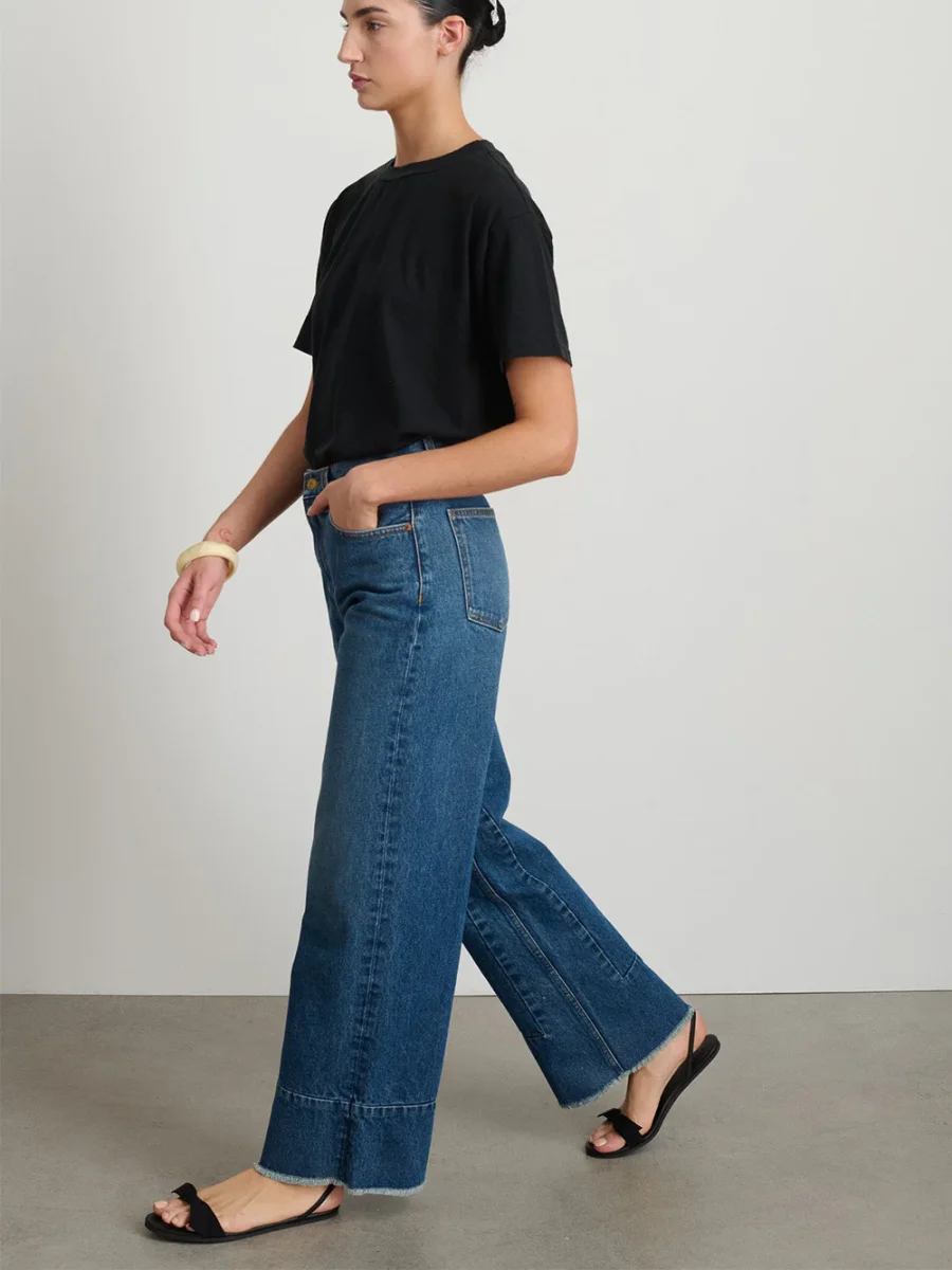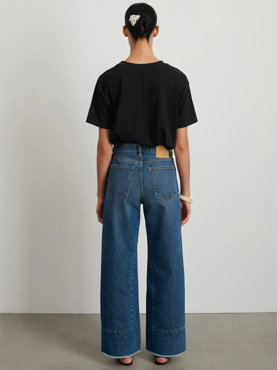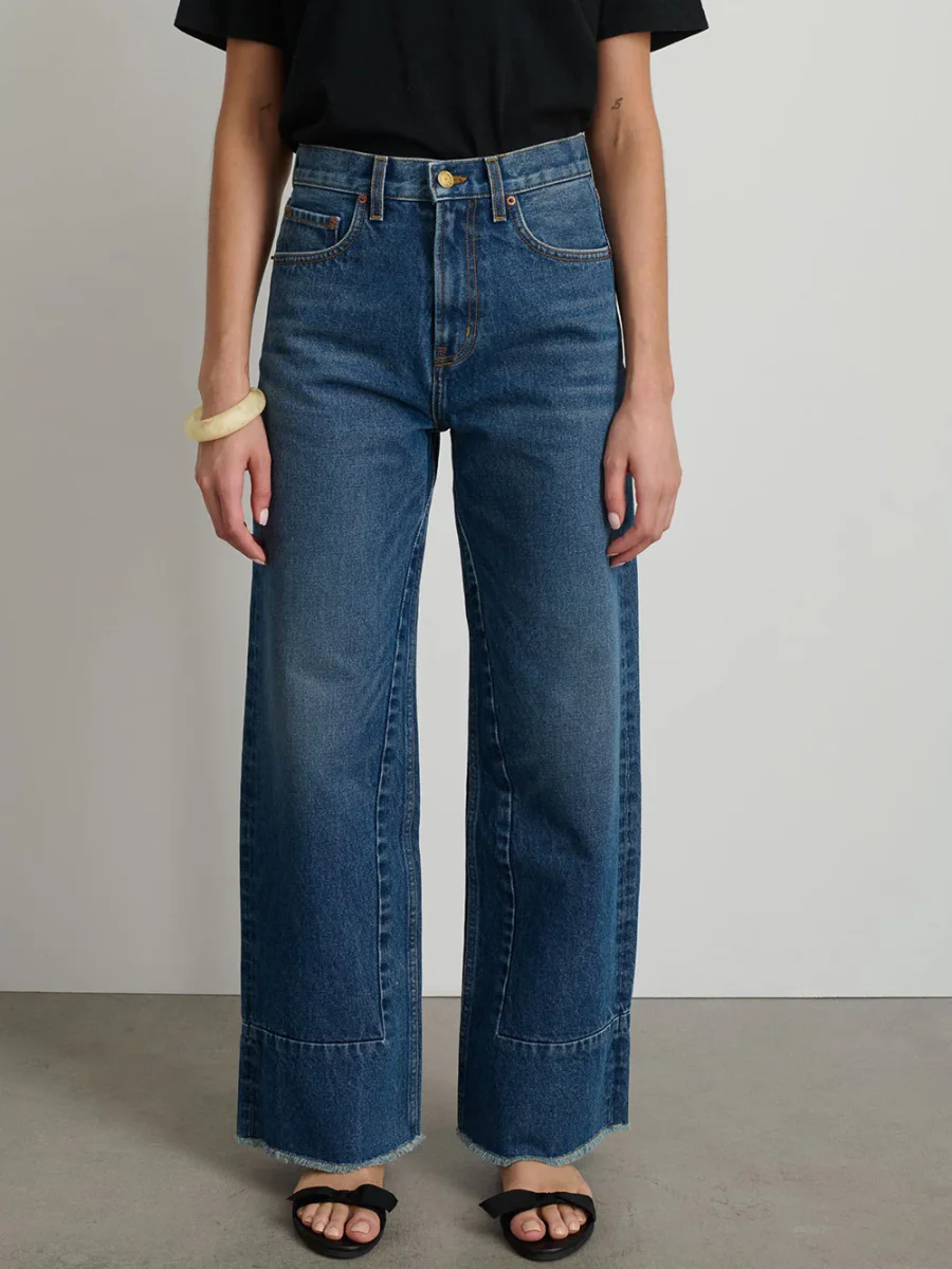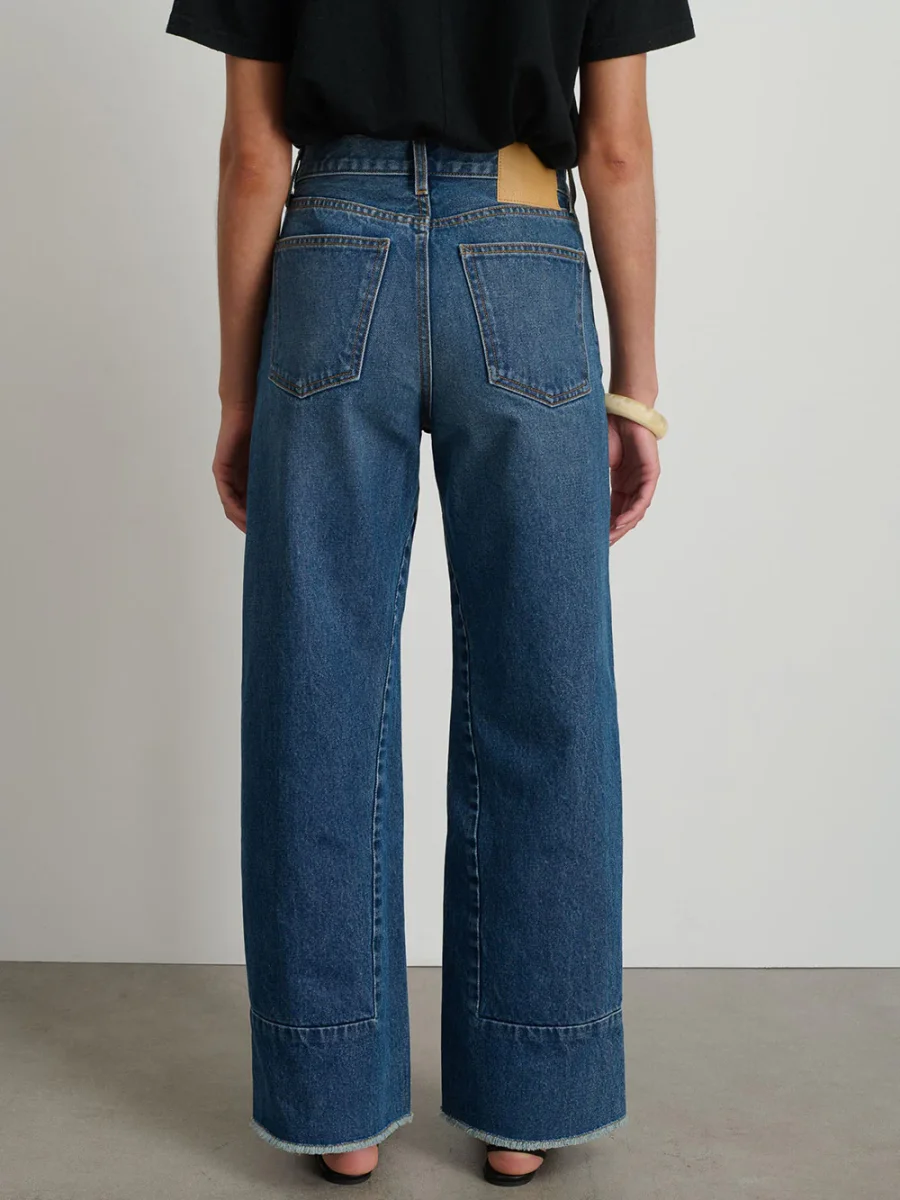 Le jean Marcel Culotte couleur Joni Wash signé BSIDES en denim bleu a une coupe décontractée, une taille moyenne et une jambe droite avec coutures sur le bas. Pièce conçue à New York et fabriquée de manière responsable à Los Angeles.