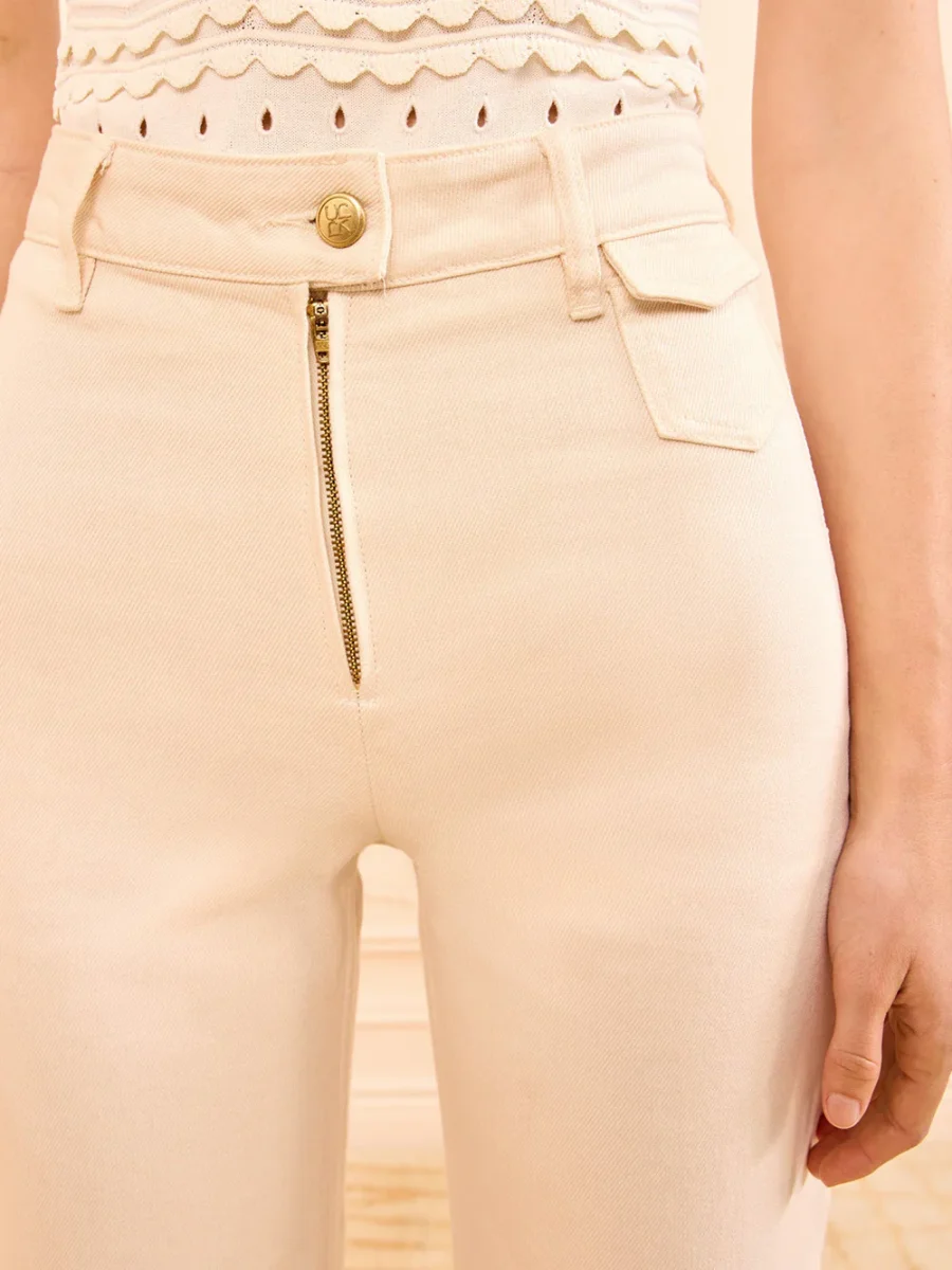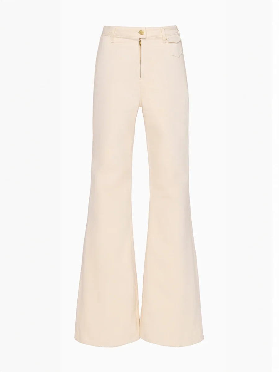 Jean Odelia Cowrie signé Ulla Johnson confectionné dans une toile de jean au délavage écru. Un pantalon au style inspiré des années 1970 avec une taille haute et des jambes évasées.