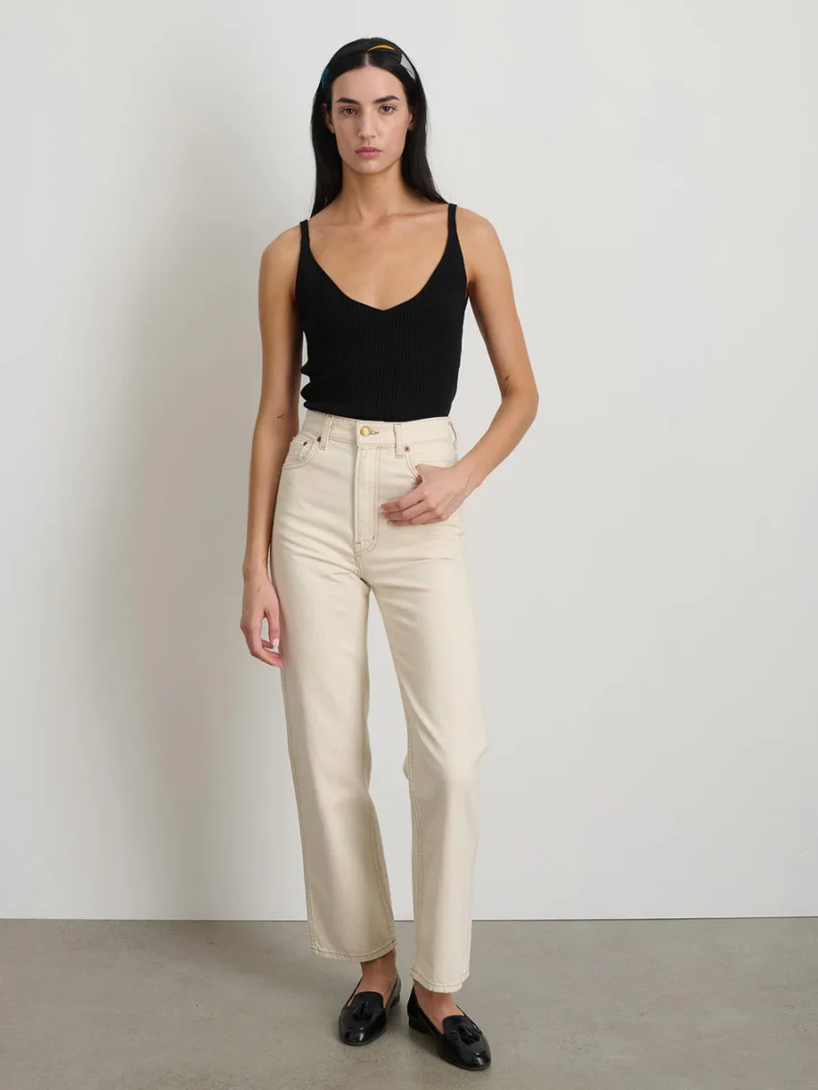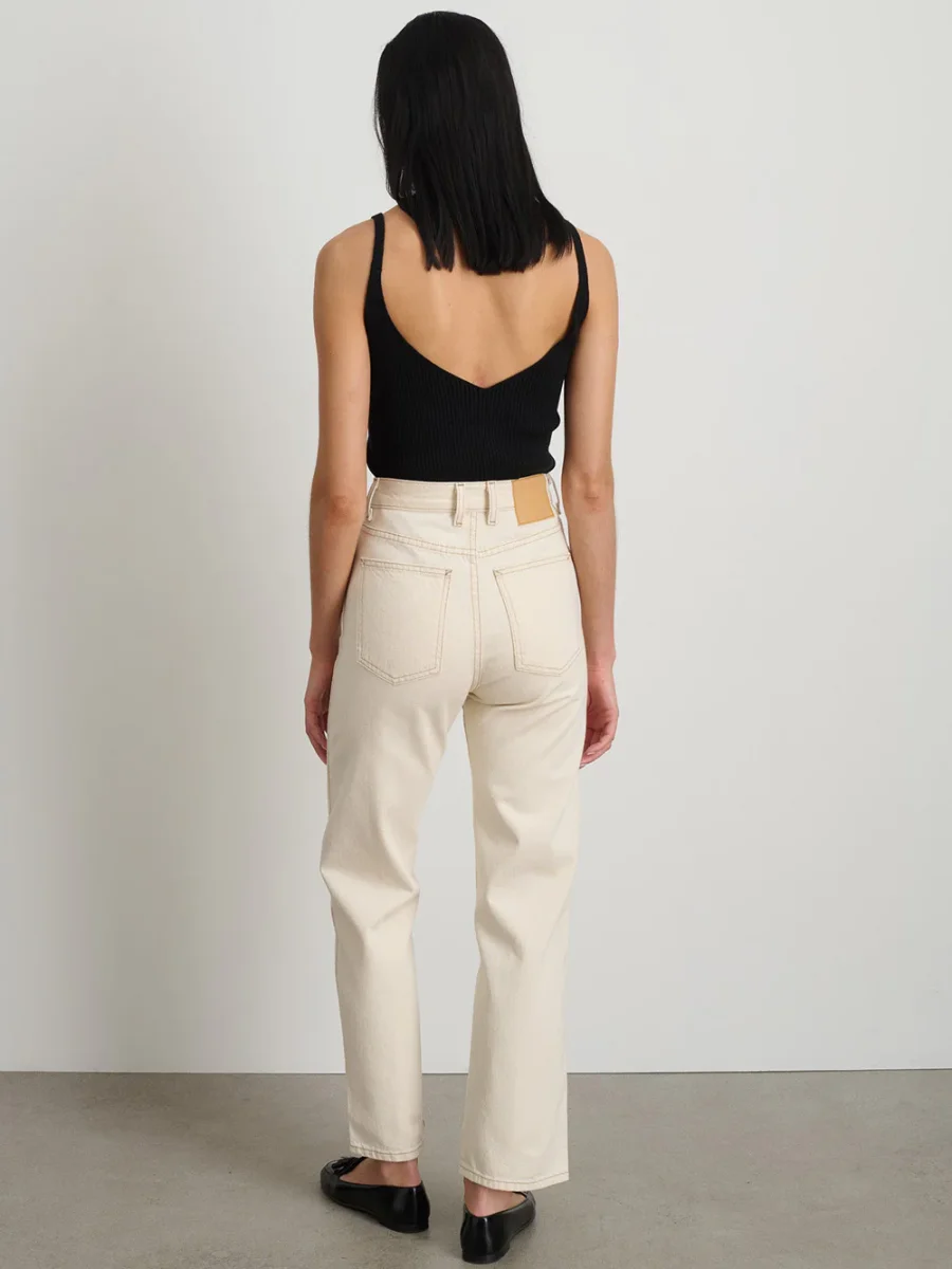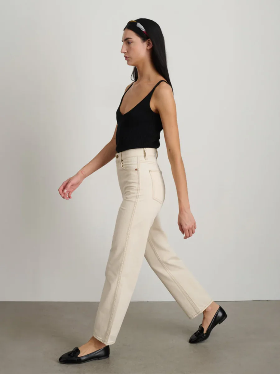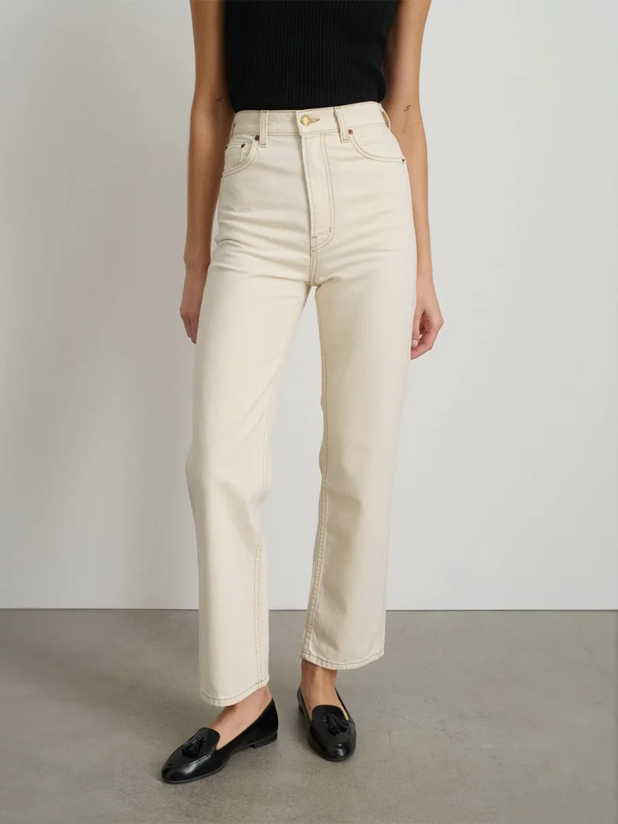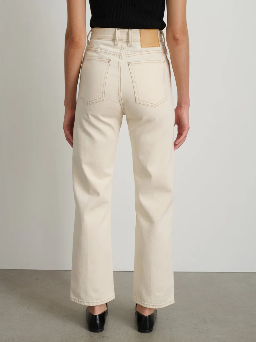 Jean Plein couleur Clair de la marque BSIDES, en denim blanc cassé a une coupe droite avec une taille haute, des jambes légèrement évasées et raccourcies aux chevilles. Cette pièce est conçue à New York et fabriquée de manière responsable à Los Angeles.