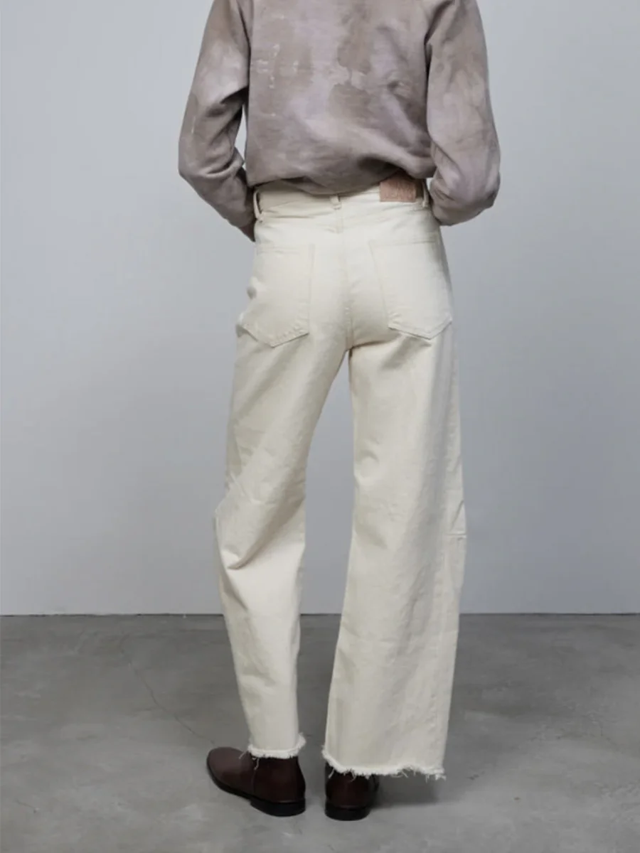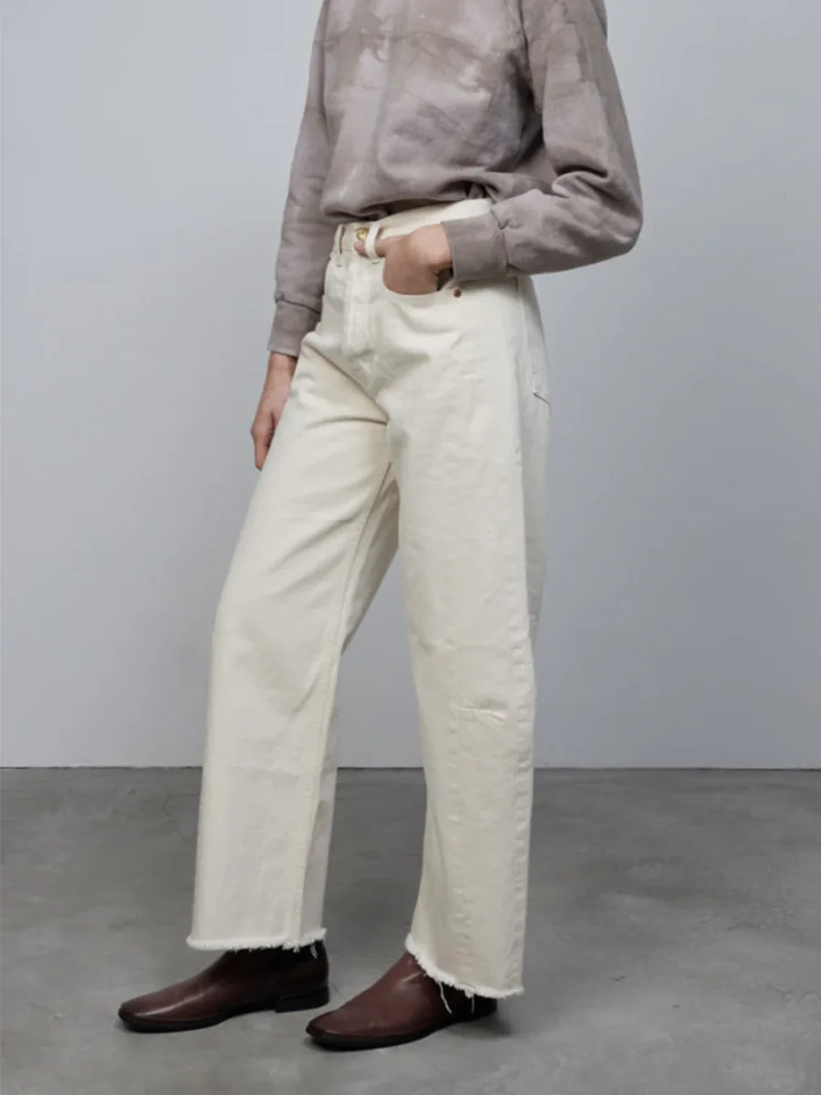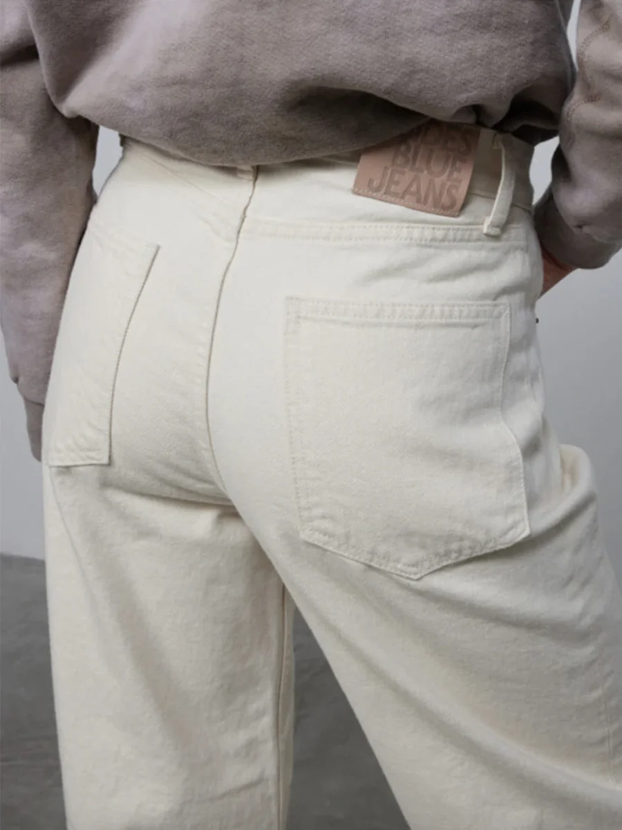 Jean Slim Lasso signé Bsides confectionné dans une toile denim de couleur blanc cassé. Un pantalon taille haute aux jambes larges arquées accompagnées de détails effilochés au niveau des chevilles. – Fabriqué aux États-Unis – Le mannequin mesure 1m75 et porte une taille 25