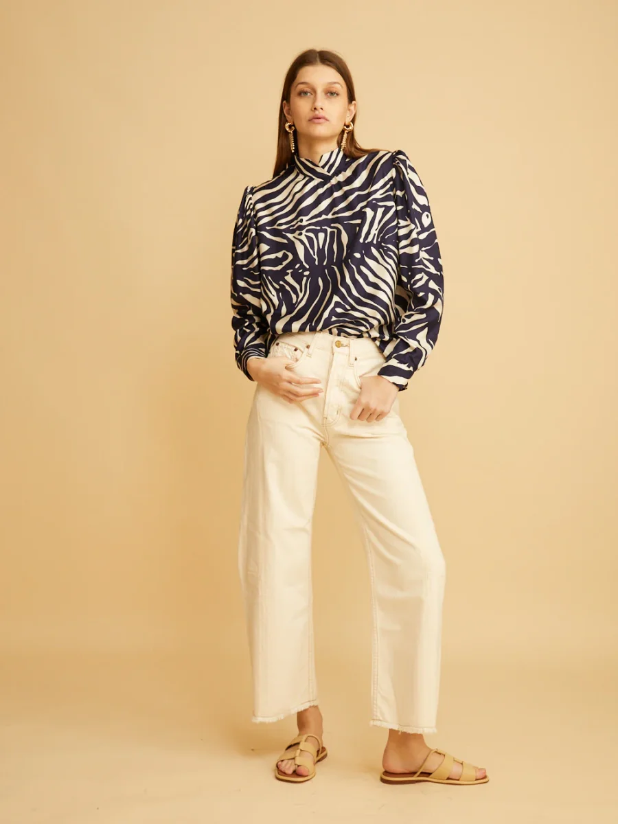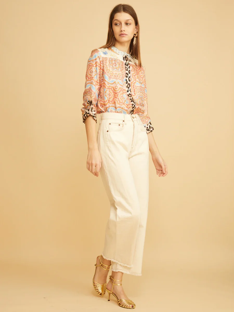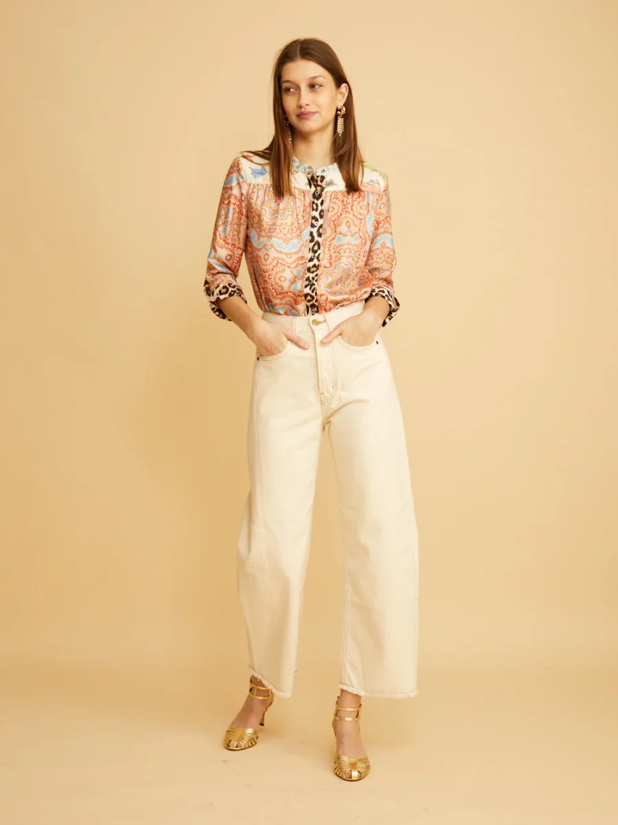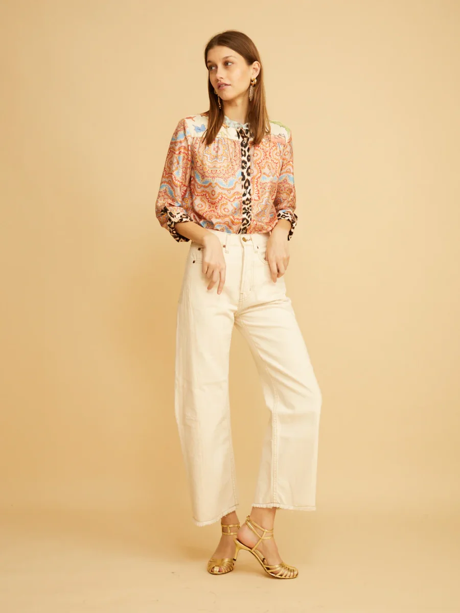 Jean Slim Lasso signé Bsides confectionné dans une toile denim de couleur blanc cassé. Un pantalon taille haute aux jambes larges arquées accompagnées de détails effilochés au niveau des chevilles. – Fabriqué aux États-Unis – Le mannequin mesure 1m75 et porte une taille 25