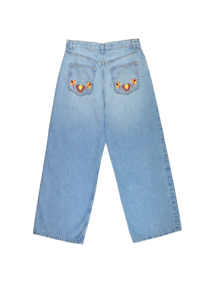 Jean Sunny signé Monoki confectionné dans une toile denim au délavage bleu clair décoré de broderies florales au niveau des poches. Un jean aux jambes larges pour un look moderne. – Broderies dans les tons jaune, rouge et vert sur les poches latérales et à l’arrière