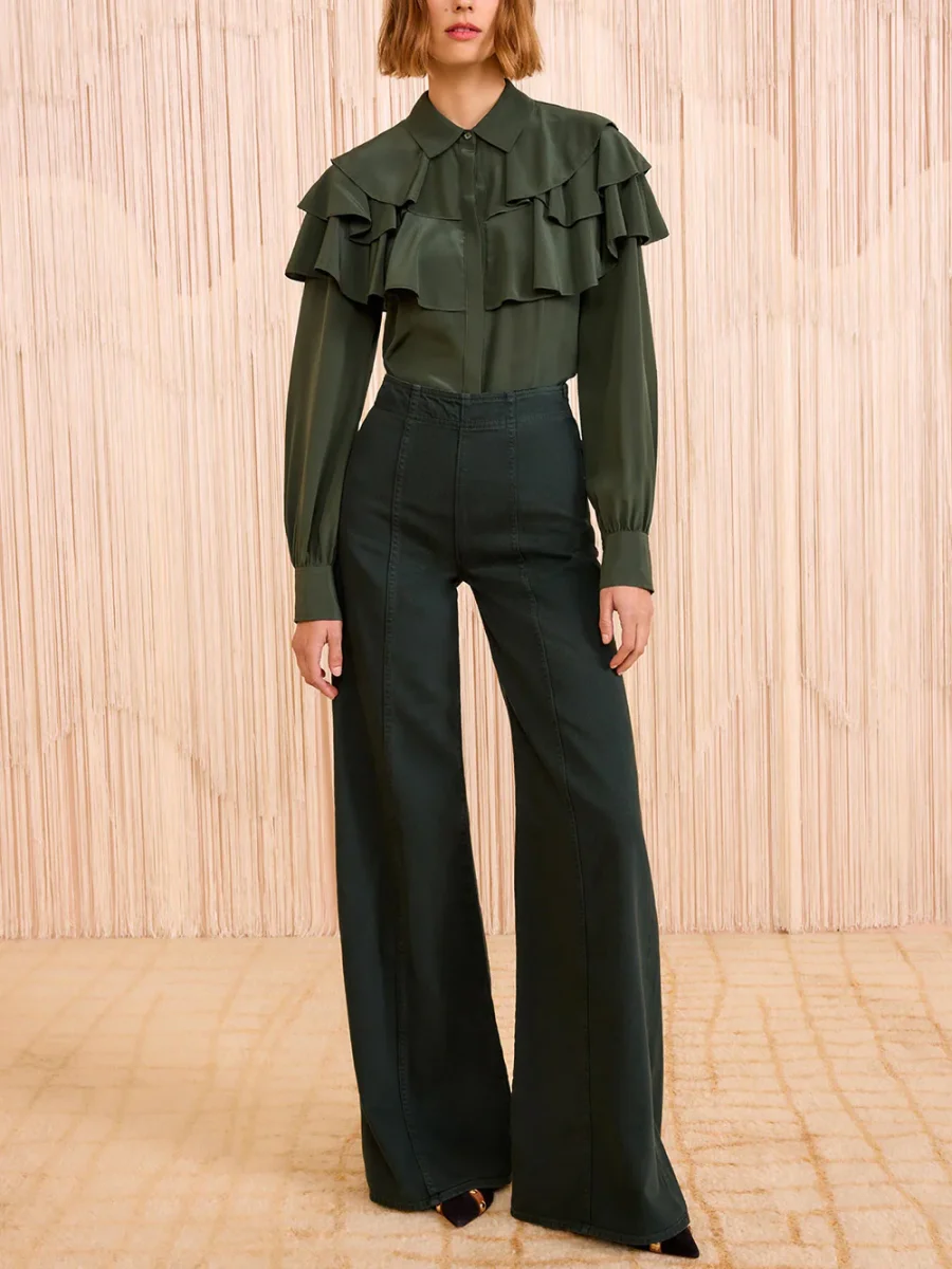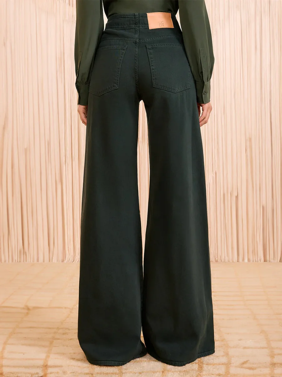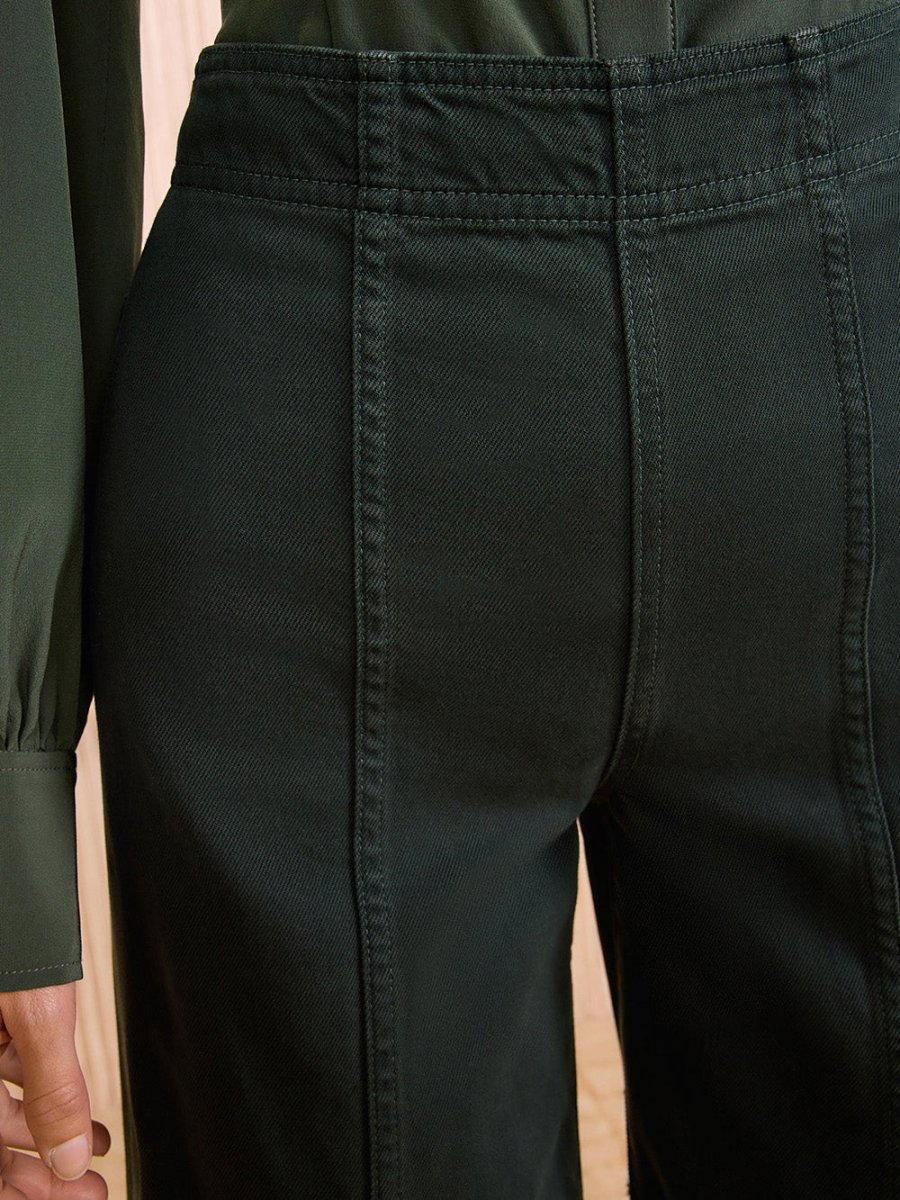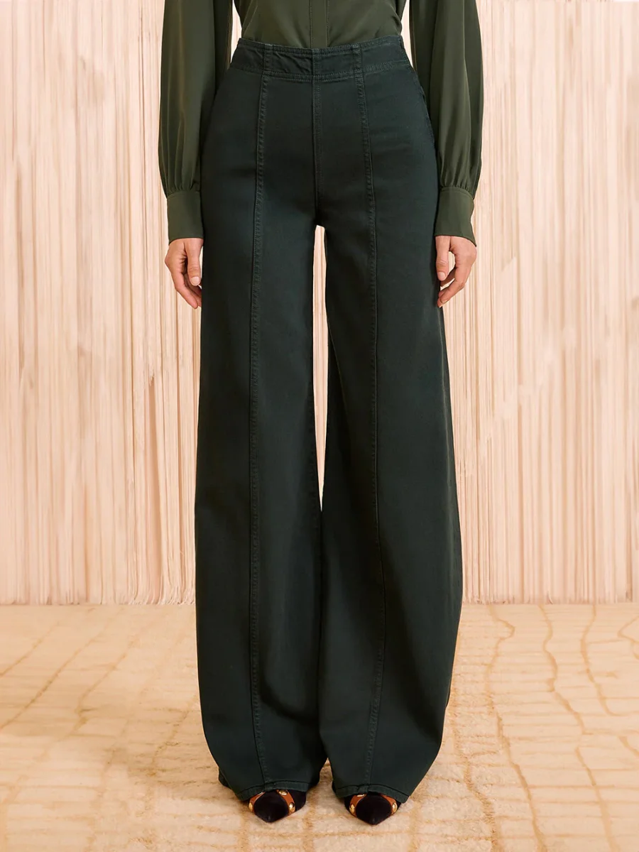 Jean The Bianca Hunter signé Ulla Johnson fabriqué à la main à Los Angeles dans une toile de jean premium de couleur vert forêt. Une jean large à la taille haute hollywoodienne pour un style chic. – Fabriqué à Los Angeles – Coutures décoratives sur toute la longueur – Fermeture éclair dissimulée sur le côté