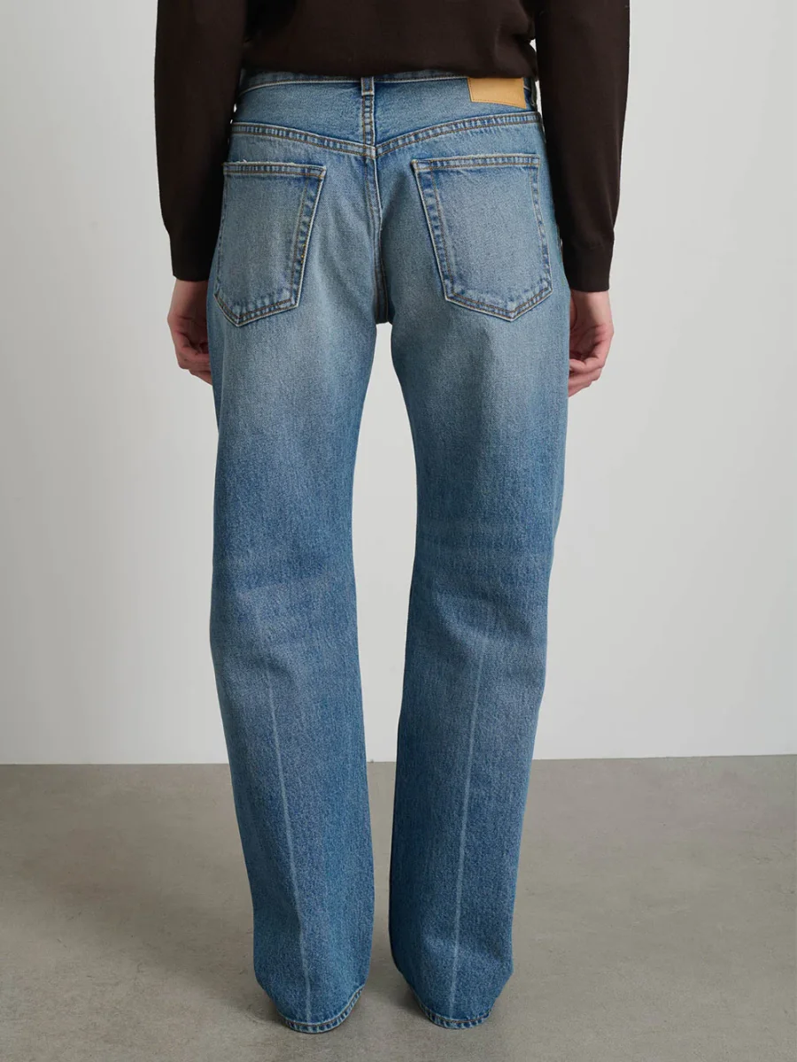 Jean Tilda coloris Jane signé B Sides confectionné dans une toile de coton 14oz, indigo naturel. Une coupe droite loose à la taille mi-haute. Cette pièce est conçue à New York et fabriquée de manière responsable à Los Angeles.