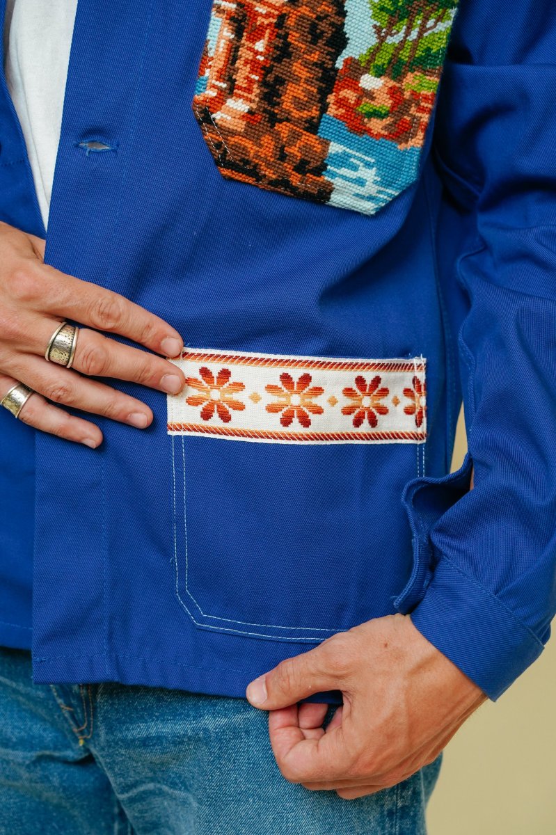 Kalika donne un second souffle au traditionnel bleu de travail avec ses détails cousus mains. Chaque veste est une pièce unique. Au dos, une broderie cousue à la main avec un cadre lui même brodé, à retrouver au col et sur les poches. Les vestes sont unisexes.