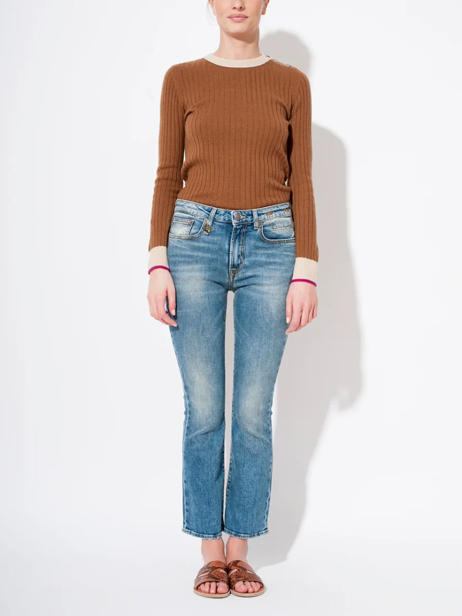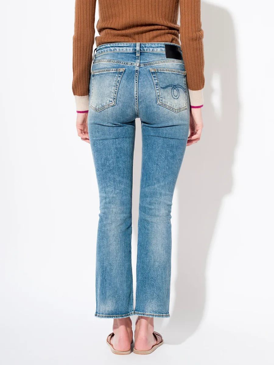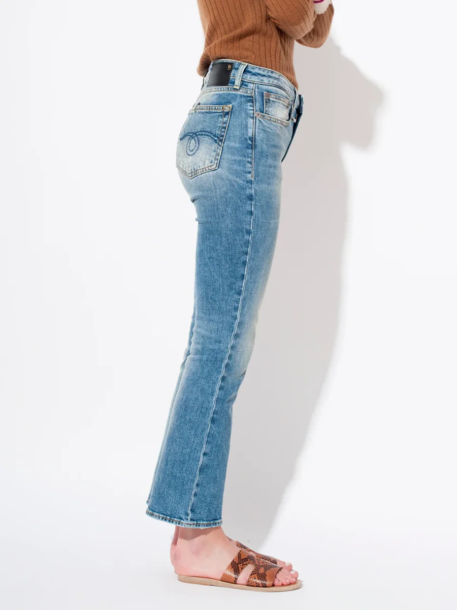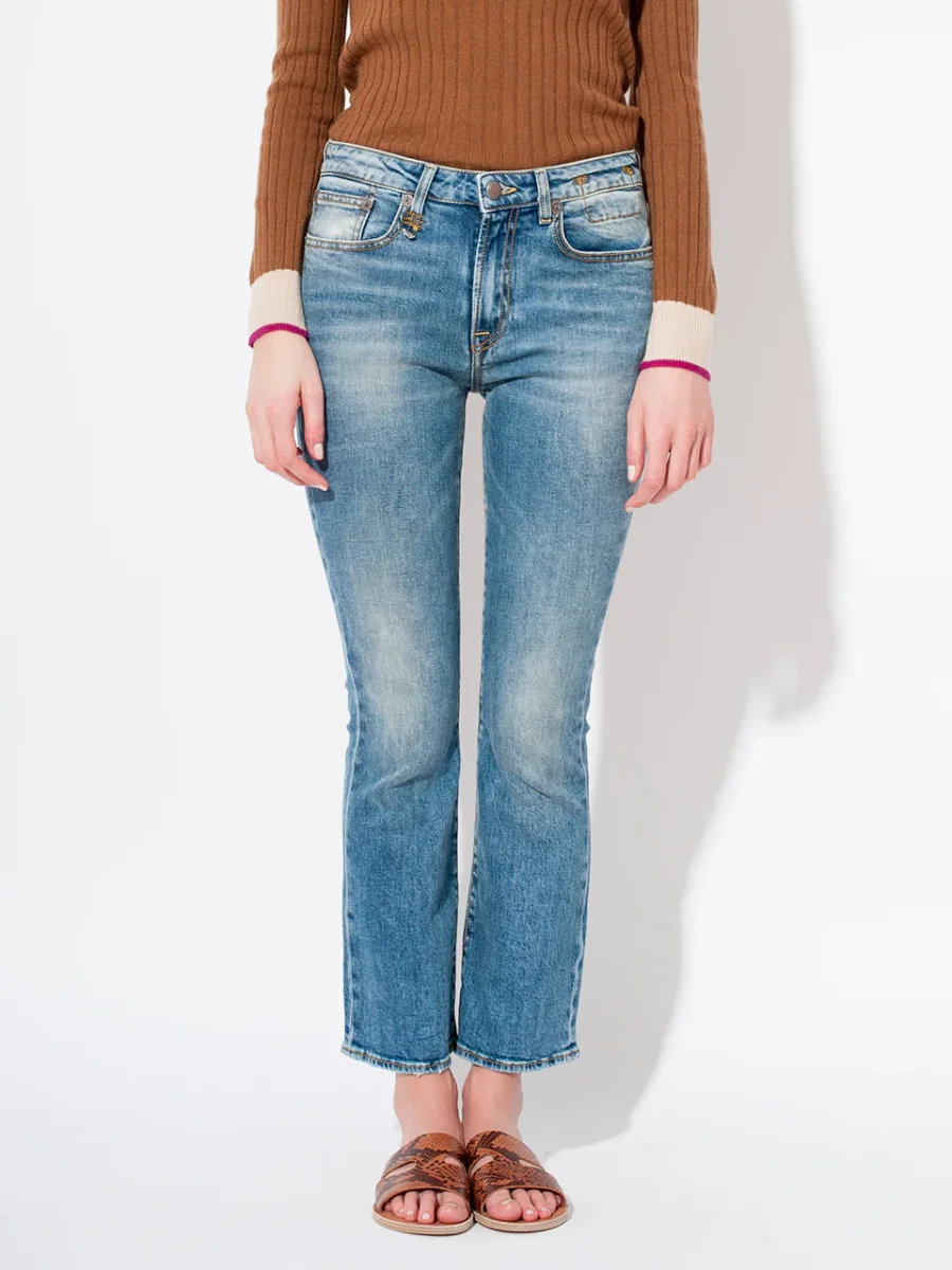 Jean Kick Fit Jasper R13. Ce jean taille mi-haute est légèrement évasé sur le bas et arrive au dessus des chevilles. Le jean est bleu délavé au niveau des genoux et sur le haut des cuisses. Le jean a 5 poches, des passants pour ceinture et se ferme à l’aide d’un zip et d’un bouton.