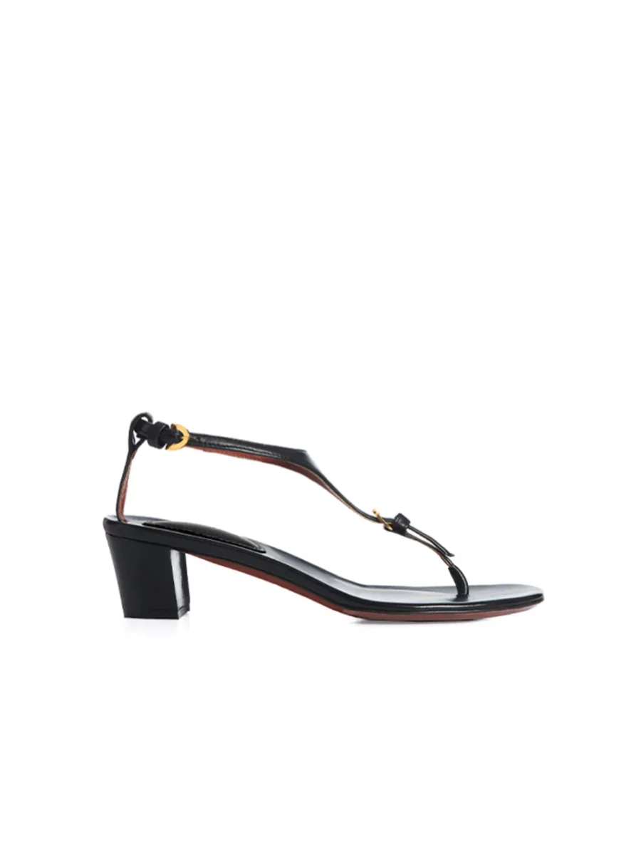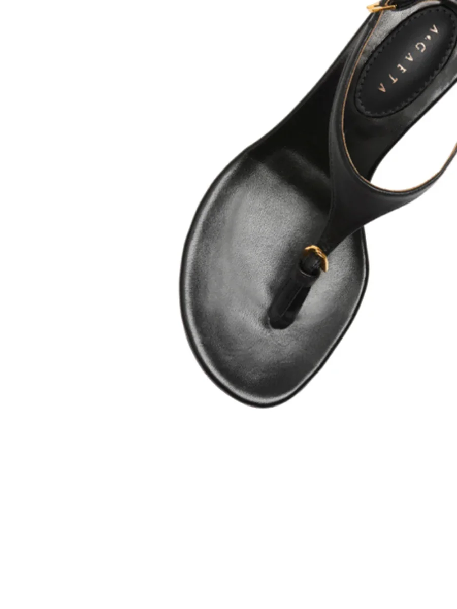 La Maliziosa signée A Di Gaeta confectionné en cuir nappa noir. Une paire de chaussures à talons, en forme de tongs, ajustable au niveau de la cheville par une boucle.