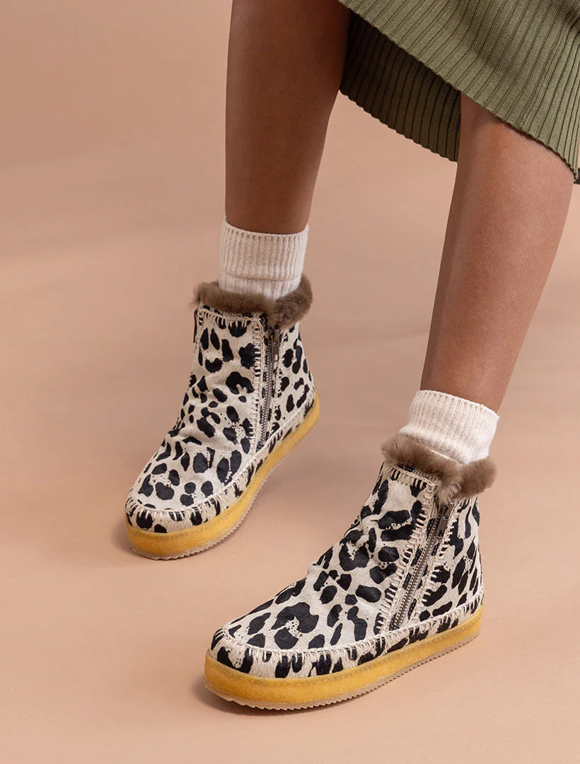 Bottines à enfiler faites à la main avec fermeture éclair latérale et imprimé léopard et détails au crochet en beige.