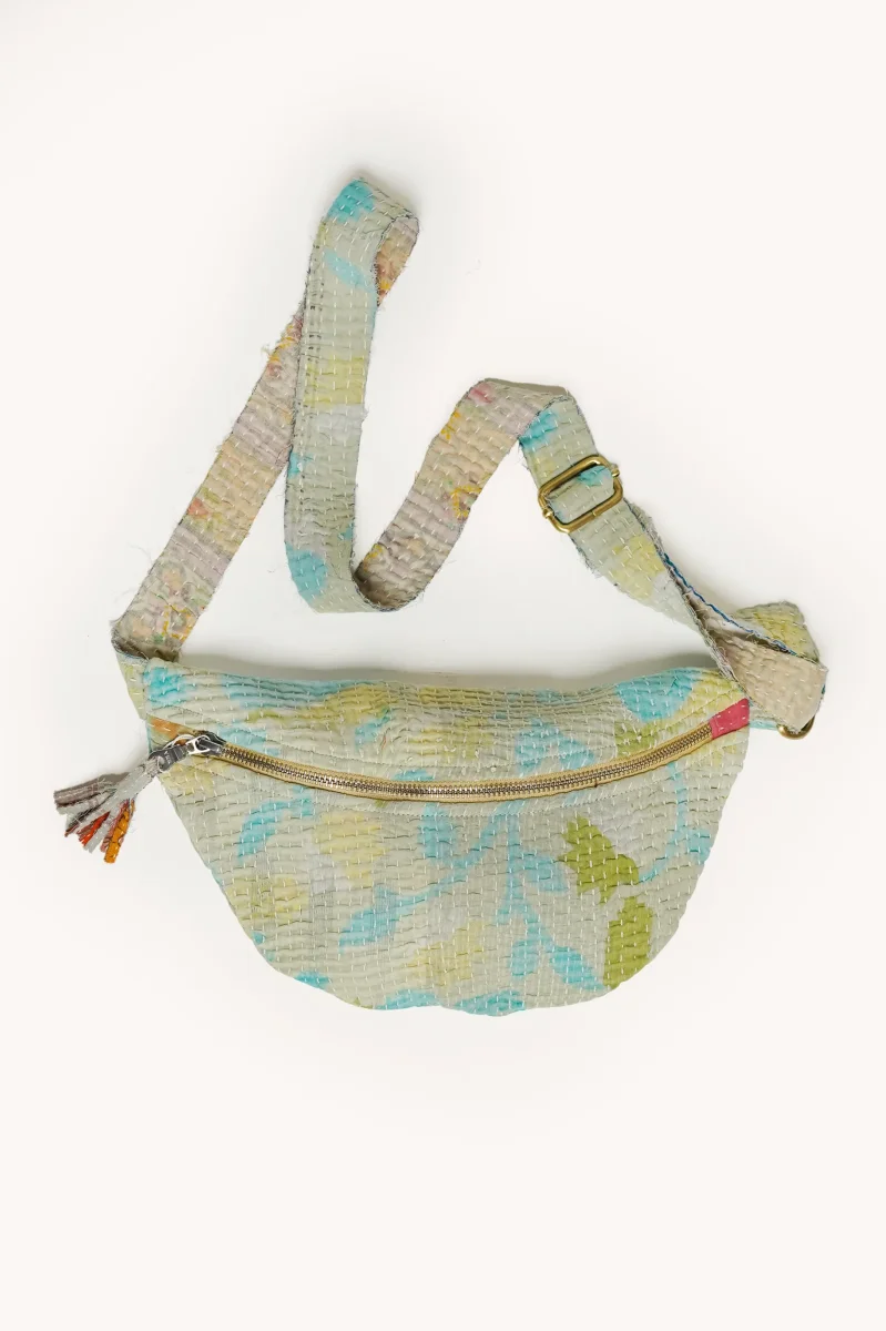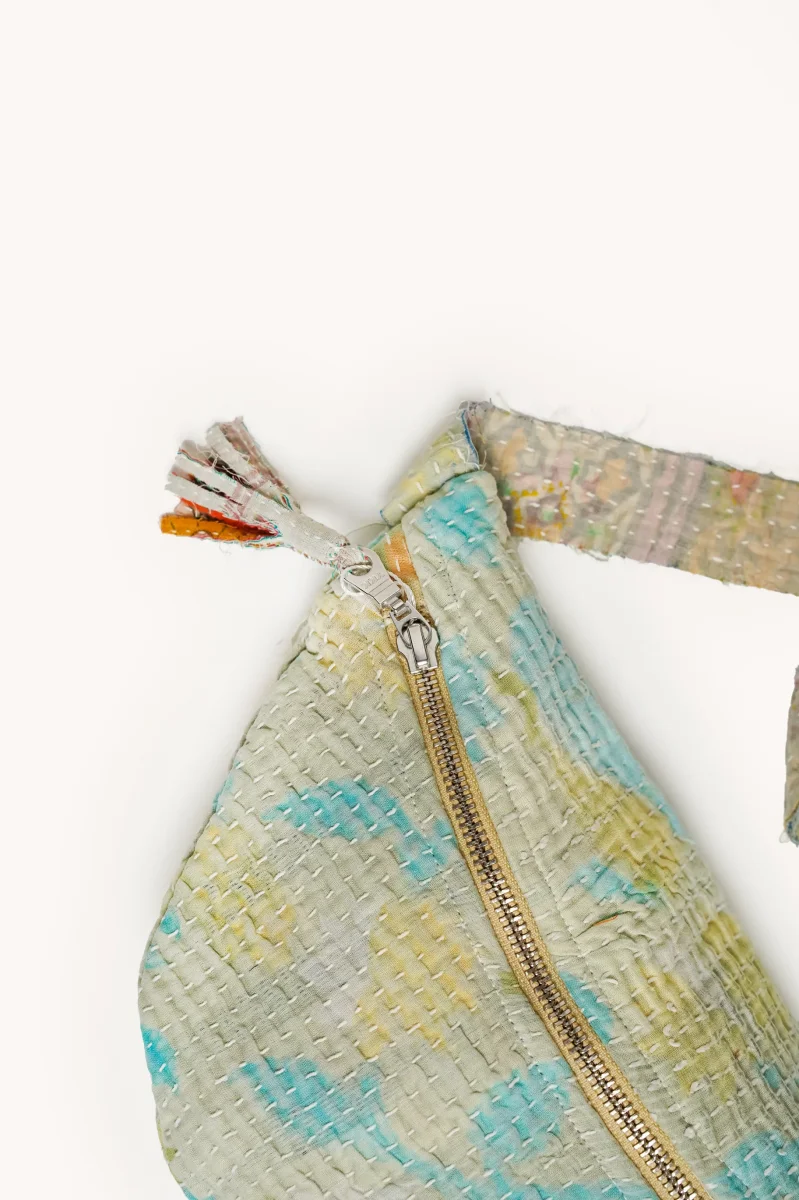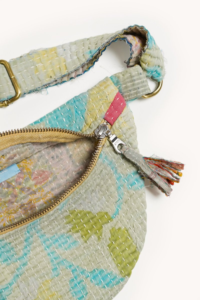 La banane L’Île Bleue est confectionnée à partir de textiles kantha, une technique de broderie traditionnelle indienne qui donne une seconde vie à des tissus anciens. Chaque modèle est unique, marqué par les motifs, les couleurs et les coutures qui racontent un passé riche et vibrant.